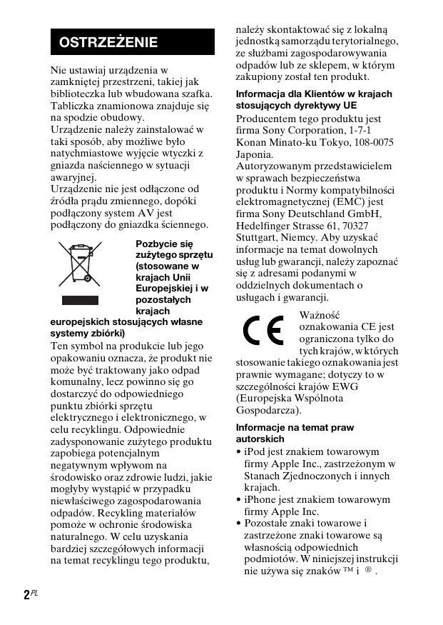 - Firma Sony nie odppwiada za ultracenie lub uszkodzenie danych zapisanych w urzadzeniu iPod podlaczonym do tego urzadzenia.