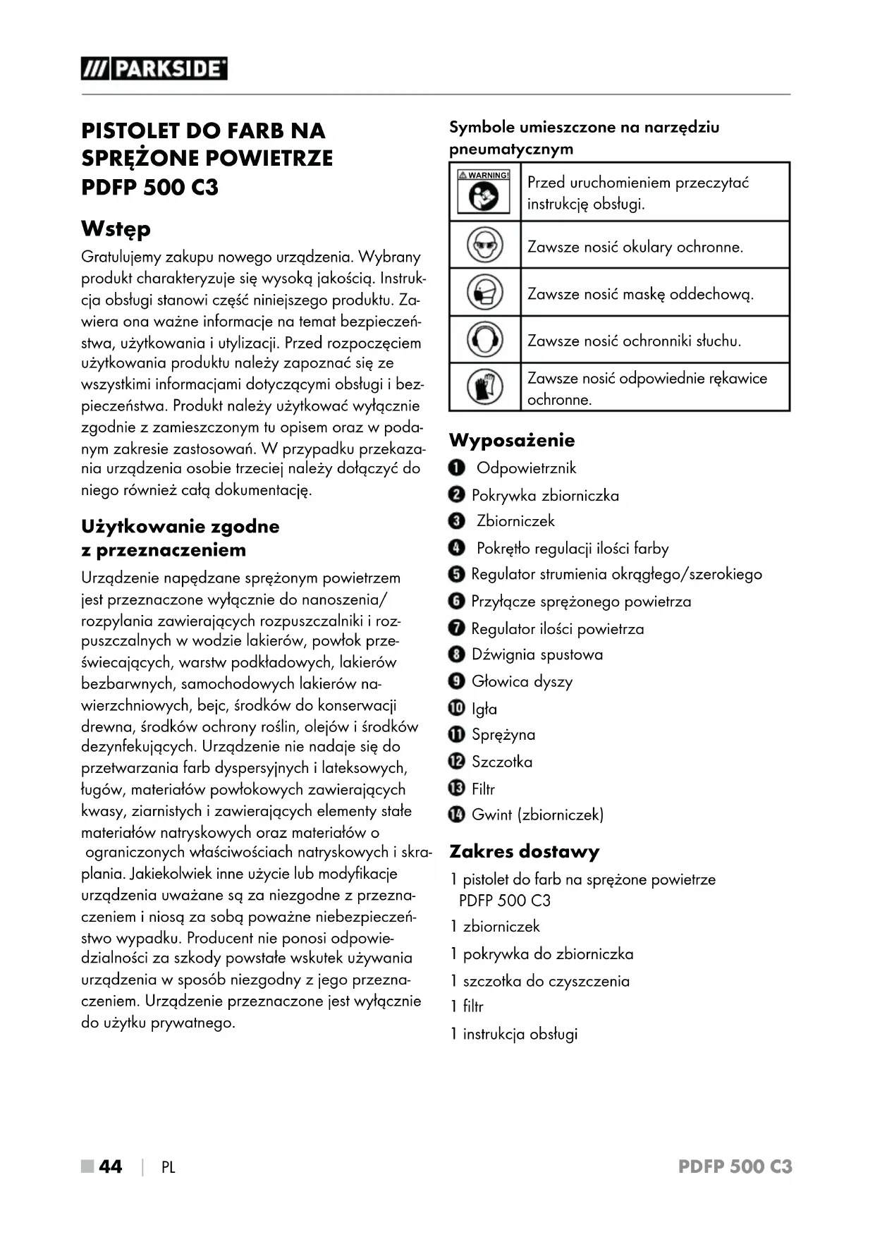 PDFP 500 C3 Wstęp Gratulujemy zakupu nowego urządzenia. Wybrany produkt charakteryzuje się wysoką jakością. Instruk- cja obsługi stanowi część niniejszego produktu. Za- wiera ona ważne informacje na temat bezpieczeń- stwa, użytkowania i utylizacji. Przed rozpoczęciem użytkowania produktu należy zapoznać się ze wszystkimi informacjami dotyczącymi obsługi i bez- pieczeństwa. Produkt należy użytkować wyłącznie zgodnie z zamieszczonym tu opisem oraz w poda- nym zakresie zastosowań. W przypadku przekaza- nia urządzenia osobie trzeciej należy dołączyć do niego również całą dokumentację. Użytkowanie zgodne z przeznaczeniem Urządzenie napędzane sprężonym powietrzem jest przeznaczone wyłącznie do nanoszenia/ rozpylania zawierających rozpuszczalniki i roz- puszczalnych w wodzie lakierów, powłok prze- świecających, warstw podkładowych, lakierów bezbarwnych, samochodowych lakierów na- wierzchniowych, bejc, środków do konserwacji drewna, środków ochrony roślin, olejów i środków dezynfekujących. Urządzenie nie nadaje się do przetwarzania farb dyspersyjnych i lateksowych, ługów, materiałów powłokowych zawierających kwasy, ziarnistych i zawierających elementy stałe materiałów natryskowych oraz materiałów o ograniczonych właściwościach natryskowych i skra- plania. Jakiekolwiek inne użycie lub modyfikacje urządzenia uważane są za niezgodne z przezna- czeniem i niosą za sobą poważne niebezpieczeń- stwo wypadku. Producent nie ponosi odpowie- dzialności za szkody powstałe wskutek używania urządzenia w sposób niezgodny z jego przezna- czeniem. Urządzenie przeznaczone jest wyłącznie do użytku prywatnego. Symbole umieszczone na narzędziu pneumatycznym WARNING! Przed uruchomieniem przeczytać instrukcję obsługi. Zawsze nosić okulary ochronne. Zawsze nosić maskę oddechową. Zawsze nosić ochronniki słuchu. Zawsze nosić odpowiednie rękawice ochronne. Wyposażenie Odpowietrznik Pokrywka zbiorniczka Zbiorniczek Pokrętło regulacji ilości farby Regulator strumienia okrągłego/szerokiego Przyłącze sprężonego powietrza Regulator ilości powietrza Dźwignia spustowa Głowica dyszy Igła Sprężyna Szczotka Filtr Gwint (zbiorniczek) Zakres dostawy 1 pistolet do farb na sprężone powietrze PDFP 500 C3 1 zbiorniczek 1 pokrywka do zbiorniczka 1 szczotka do czyszczenia 1 filtr 1 instrukcja obsługiPDFP 500 C3 PL