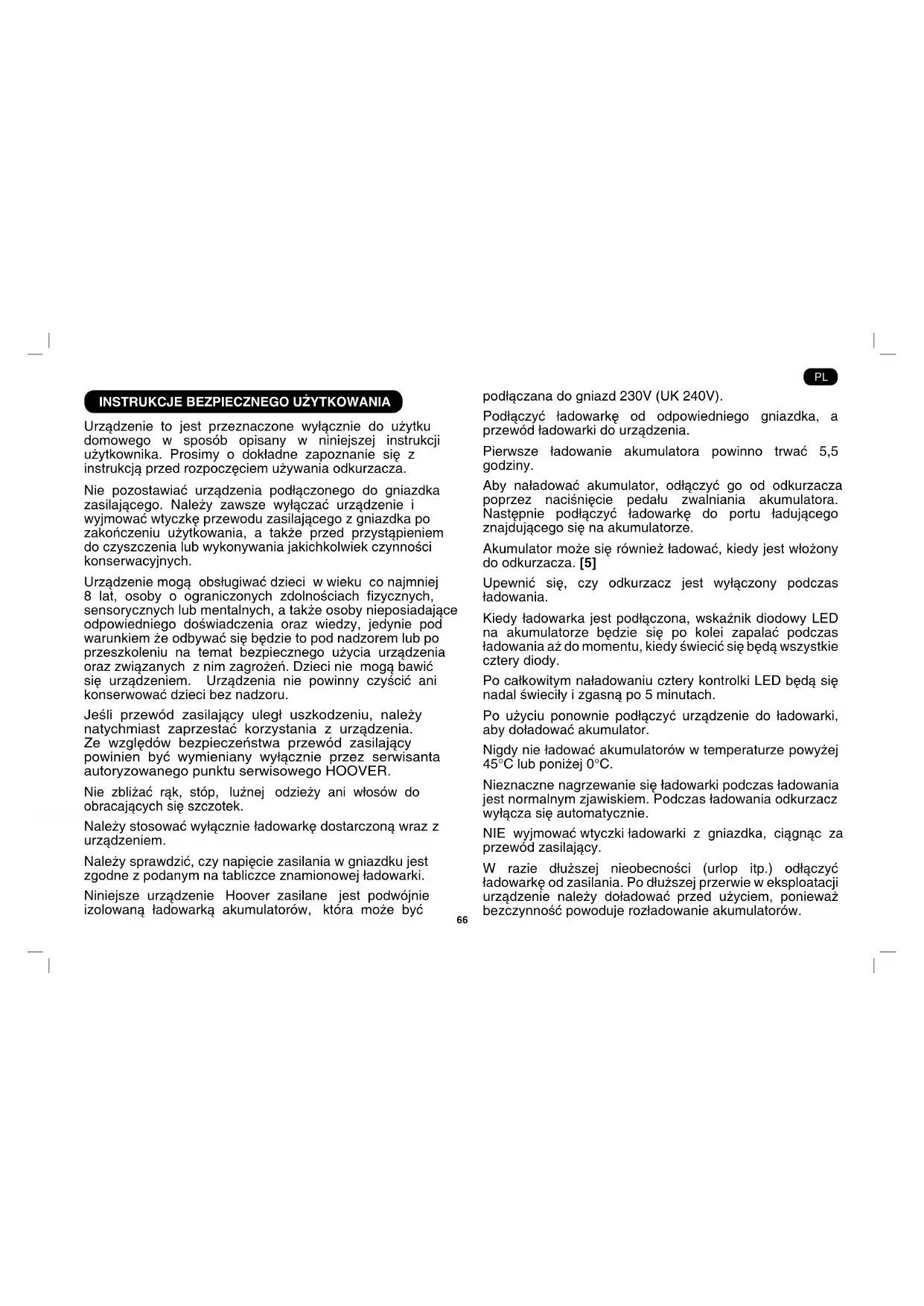 Urządzenie to jest przeznaczone wyłącznie do użytku domowego w sposób opisany w niniejszej instrukcji użytkownika. Prosimy o dokładne zapoznanie się z instrukcją przed rozpoczęciem używania odkurzacza. Nie pozostawiać urządzenia podłączonego do gniazdka zasilającego. Należy zawsze wyłączać urządzenie i wyjmować wtyczkę przewodu zasilającego z gniazdka po zakończeniu użytkowania, a także przed przystąpieniem do czyszczenia lub wykonywania jakichkolwiek czynności konserwacyjnych. Urządzenie mogą obsługiwać dzieci w wieku co najmniej 8 lat, osoby o ograniczonych zdolnościach zycznych, sensorycznych lub mentalnych, a także osoby nieposiadające odpowiedniego doświadczenia oraz wiedzy, jedynie pod warunkiem że odbywać się będzie to pod nadzorem lub po przeszkoleniu na temat bezpiecznego użycia urządzenia oraz związanych z nim zagrożeń. Dzieci nie mogą bawić się urządzeniem. Urządzenia nie powinny czyścić ani konserwować dzieci bez nadzoru. Jeśli przewód zasilający uległ uszkodzeniu, należy natychmiast zaprzestać korzystania z urządzenia. Ze względów bezpieczeństwa przewód zasilający powinien być wymieniany wyłącznie przez serwisanta autoryzowanego punktu serwisowego HOOVER. Nie zbliżać rąk, stóp, luźnej odzieży ani włosów do obracających się szczotek. Należy stosować wyłącznie ładowarkę dostarczoną wraz z urządzeniem. Należy sprawdzić, czy napięcie zasilania w gniazdku jest zgodne z podanym na tabliczce znamionowej ładowarki. Niniejsze urządzenie Hoover zasilane jest podwójnie izolowaną ładowarką akumulatorów, która może być podłączana do gniazd 230V (UK 240V). Podłączyć ładowarkę od odpowiedniego gniazdka, a przewód ładowarki do urządzenia. Pierwsze ładowanie akumulatora powinno trwać 5,5 godziny. Aby naładować akumulator, odłączyć go od odkurzacza poprzez naciśnięcie pedału zwalniania akumulatora. Następnie podłączyć ładowarkę do portu ładującego znajdującego się na akumulatorze. Akumulator może się również ładować, kiedy jest włożony do odkurzacza. [5] Upewnić się, czy odkurzacz jest wyłączony podczas ładowania. Kiedy ładowarka jest podłączona, wskaźnik diodowy LED na akumulatorze będzie się po kolei zapalać podczas ładowania aż do momentu, kiedy świecić się będą wszystkie cztery diody. Po całkowitym naładowaniu cztery kontrolki LED będą się nadal świeciły i zgasną po 5 minutach. Po użyciu ponownie podłączyć urządzenie do ładowarki, aby doładować akumulator. Nigdy nie ładować akumulatorów w temperaturze powyżej 45°C lub poniżej 0°C. Nieznaczne nagrzewanie się ładowarki podczas ładowania jest normalnym zjawiskiem. Podczas ładowania odkurzacz wyłącza się automatycznie. NIE wyjmować wtyczki ładowarki z gniazdka, ciągnąc za przewód zasilający. W razie dłuższej nieobecności (urlop itp.) odłączyć ładowarkę od zasilania. Po dłuższej przerwie w eksploatacji urządzenie należy doładować przed użyciem, ponieważ bezczynność powoduje rozładowanie akumulatorów. PL67 Jeżeli urządzenie ma być złomowane, należy z niego najpierw usunąć akumulatory. Podczas wyjmowania akumulatora urządzenie musi być odłączone od zasilania. Akumulatory należy utylizować w sposób bezpieczny dla środowiska. Włączyć urządzenie i pozwolić, aby pracowało aż do całkowitego wyczerpania akumulatorów. Zużyte akumulatory należy przekazać do recyklingu. Nie należy ich wyrzucać ze śmieciami domowymi. W celu wyjęcia akumulatorów należy skontaktować się z Centrum Serwisowym Hoover lub postępować zgodnie z następującymi instrukcjami. WAŻNE: Przed usunięciem należy całkowicie rozładować akumulatory. Włączyć odkurzacz i pozwolić, aby pracował aż do pełnego wyczerpania akumulatorów. Wyjąć wtyczkę przewodu ładowarki z urządzenia. Nacisnąć przycisk zwalniania akumulatora, aby zwolnić akumulator. [5] Powoli wysunąć zestaw akumulatorów ze szczeliny. [5] UWAGA: W razie napotkania jakichkolwiek problemów z demontażem jednostki lub w razie konieczności uzyskania dodatkowych informacji na temat sposobu utylizacji, złomowania i recyklingu urządzenia należy skontaktować się z lokalnym urzędem gminy lub komunalnym zakładem utylizacji odpadów. Nie wolno stosować jednorazowych baterii zamiast akumulatorów. Należy korzystać wyłącznie z końcówek, materiałów eksploatacyjnych oraz części zamiennych zalecanych lub dostarczonych przez rmę HOOVER. Ładunki elektrostatyczne: Odkurzanie niektórych dywanów może powodować niewielkie naelektryzowanie się urządzenia. Tego rodzaju ładunki elektrostatyczne nie stanowią zagrożenia dla zdrowia. Nie używać urządzenia na zewnątrz domu, do odkurzania mokrych powierzchni ani do zbierania wody. Nie wolno wciągać twardych lub ostrych przedmiotów, zapałek, gorącego popiołu, niedopałków papierosów ani innych podobnych przedmiotów. Nie spryskiwać łatwopalnymi cieczami, środkami czyszczącymi w aerozolu ani parą. Nie stąpać po przewodzie zasilającym podczas korzystania z urządzenia i nie wyjmować wtyczki, ciągnąc za przewód zasilający. Nie kontynuować eksploatacji uszkodzonego urządzenia. Serwis rmy HOOVER: Aby zapewnić bezpieczne i sprawne działanie tego urządzenia, zalecamy zlecanie prac serwisowych lub napraw wyłącznie serwisantom autoryzowanego punktu serwisowego rmy HOOVER. Nie stawać na przewodzie zasilającym i nie owijać go sobie wokół rąk lub nóg podczas korzystania z urządzenia. Nie używać urządzenia do odkurzania ludzi lub zwierząt. Nie ustawiać urządzenia powyżej swojego poziomu podczas odkurzania schodów. Ochrona środowiska Symbol umieszczony na urządzeniu oznacza, że nie jest ono klasykowane jako odpad z gospodarstwa domowego. Urządzenie należy zdać w odpowiednim punkcie utylizacji w celu recyklingu komponentów elektrycznych i elektronicznych. Urządzenie nale