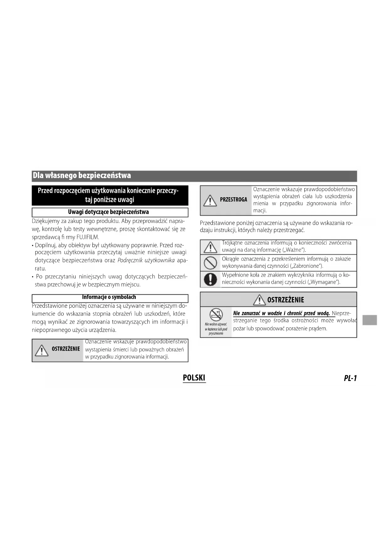- Eksklusive dæksler, modlysblænder og stativkravefødder 995 g Filterstørrelse ⌀72 mm Q Produktforbedringer kan medføre ikke-varslede ændringer af specifi kationer og produktets udseende. Q Som følge af dette objektivs konstruktion kan kameraets viste “afstandsindikator” i visse tilfælde afvige fra den faktiske fokusafstand. Anvend derfor kun “afstandsindikatoren” vejledende. Speci kationerPL-1 POLSKI Dla własnego bezpieczeństwa Przed rozpoczęciem użytkowania koniecznie przeczy- taj poniższe uwagi Uwagi dotyczące bezpieczeństwa Dziękujemy za zakup tego produktu. Aby przeprowadzić napra- wę, kontrolę lub testy wewnętrzne, proszę skontaktować się ze sprzedawcą fi rmy FUJIFILM.