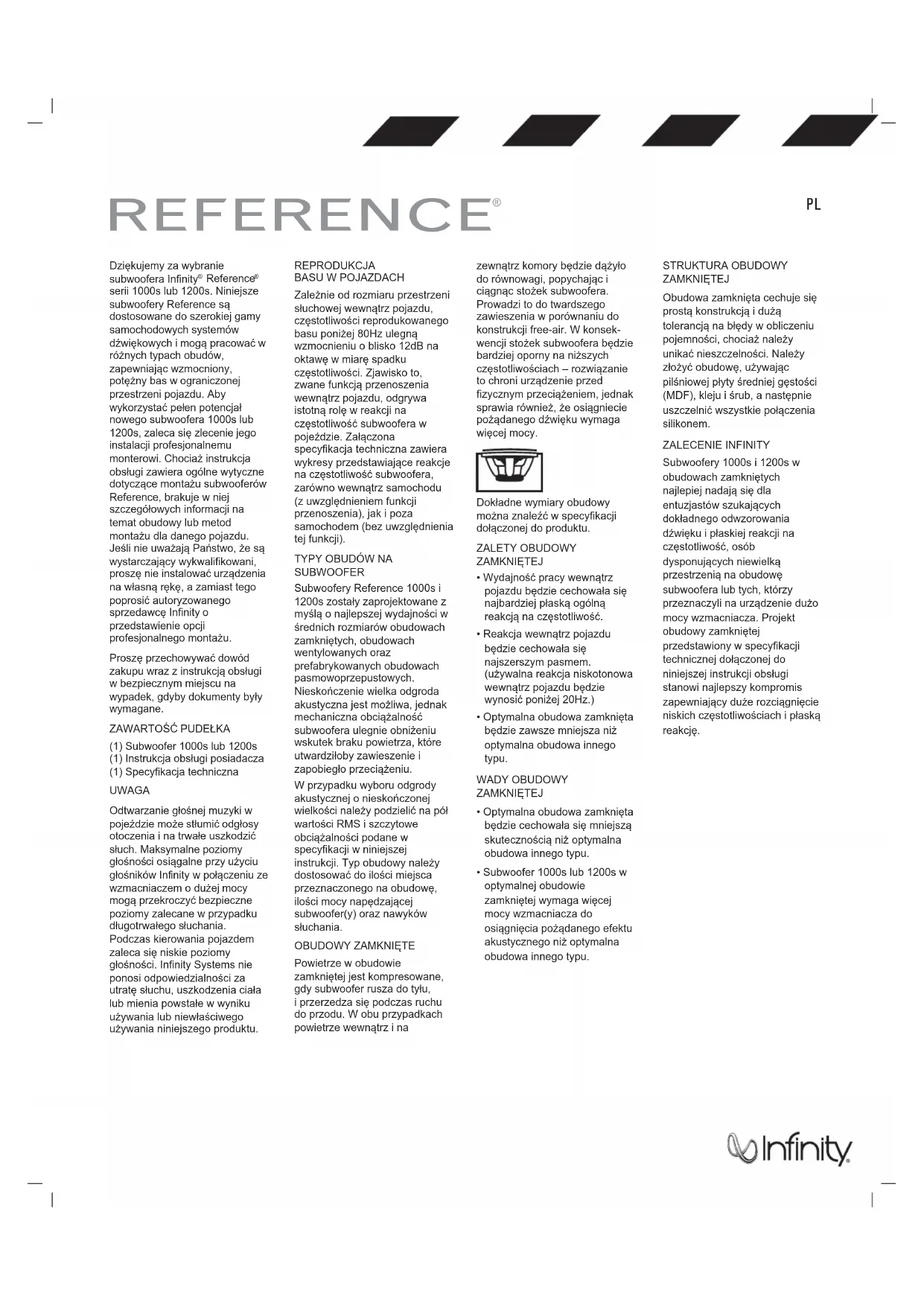 serii 1000s lub 1200s. Niniejsze subwoofery Reference są dostosowane do szerokiej gamy samochodowych systemów dźwiękowych i mogą pracować w różnych typach obudów, zapewniając wzmocniony, potężny bas w ograniczonej przestrzeni pojazdu. Aby wykorzystać pełen potencjał nowego subwoofera 1000s lub 1200s, zaleca się zlecenie jego instalacji profesjonalnemu monterowi. Chociaż instrukcja obsługi zawiera ogólne wytyczne dotyczące montażu subwooferów Reference, brakuje w niej szczegółowych informacji na temat obudowy lub metod montażu dla danego pojazdu. Jeśli nie uważają Państwo, że są wystarczający wykwalifikowani, proszę nie instalować urządzenia na własną rękę, a zamiast tego poprosić autoryzowanego sprzedawcę Infinity o przedstawienie opcji profesjonalnego montażu. Proszę przechowywać dowód zakupu wraz z instrukcją obsługi w bezpiecznym miejscu na wypadek, gdyby dokumenty były wymagane.