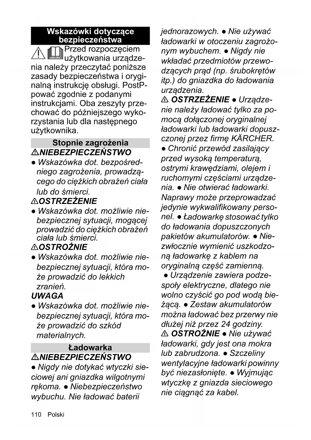 - Deklaracja zgodności UE Chairman of the Board of Management Director Regulatory Affairs & Certification H. Jenner S. Reiser 3ROVNL Wskazówki dotyczące bezpieczeństwa Przed rozpoczęciem użytkowania urządze- nia należy przeczytać poniższe zasady bezpieczeństwa i orygi- nalną instrukcję obsługi. PostP- pować zgodnie z podanymi instrukcjami. Oba zeszyty prze- chować do późniejszego wyko- rzystania lub dla następnego użytkownika. Stopnie zagrożenia NIEBEZPIECZEŃSTWO ● Wskazówka dot. bezpośred- niego zagrożenia, prowadzą- cego do ciężkich obrażeń ciała lub do śmierci. 몇 OSTRZEŻENIE ● Wskazówka dot. możliwie nie- bezpiecznej sytuacji, mogącej prowadzić do ciężkich obrażeń ciała lub śmierci. 몇 OSTROŻNIE ● Wskazówka dot. możliwie nie- bezpiecznej sytuacji, która mo- że prowadzić do lekkich zranień. UWAGA ● Wskazówka dot. możliwie nie- bezpiecznej sytuacji, która mo- że prowadzić do szkód materialnych. Ładowarka NIEBEZPIECZEŃSTWO ● Nigdy nie dotykać wtyczki sie- ciowej ani gniazdka wilgotnymi rękoma. ● Niebezpieczeństwo wybuchu. Nie ładować baterii jednorazowych. ● Nie używać ładowarki w otoczeniu zagrożo- nym wybuchem. ● Nigdy nie wkładać przedmiotów przewo- dzących prąd (np. śrubokrętów itp.) do gniazdka do ładowania urządzenia. 몇 OSTRZEŻENIE ● Urządze- nie należy ładować tylko za po- mocą dołączonej oryginalnej ładowarki lub ładowarki dopusz- czonej przez firmę KÄRCHER. ● Chronić przewód zasilający przed wysoką temperaturą, ostrymi krawędziami, olejem i ruchomymi częściami urządze- nia. ● Nie otwierać ładowarki. Naprawy może przeprowadzać jedynie wykwalifikowany perso- nel. ● Ł adowarkę stosować tylko do ładowania dopuszczonych pakietów akumulatorów . ● Nie- zwłocznie wymienić uszkodzo- ną ładowarkę z kablem na oryginalną część zamienną. ● Urządzenie zawiera podze- społy elektryczne, dlatego nie wolno czyścić go pod wodą bie- żącą. ● Zestaw akumulatorów można ładować bez przerwy nie dłużej niż przez 24 godziny. 몇 OSTROŻNIE ● Nie używać ładowarki, gdy jest ona mokra lub zabrudzona. ● Szczeliny wentylacyjne ładowarki powinny być niezasłonięte. ● Wyjmując wtyczkę z gniazda sieciowego nie ciągnąć za kabel.3ROVNL ● Nie przenosić / transportować ładowarki trzymając za przewód zasilający. UWAGA ● Niebezpieczeństwo zwarcia. Chronić styki uchwytu akumulatora przed kontaktem z metalowymi częściami. ● Łado- warkę należy stosować i prze- chowywać tylko w suchych pomieszczeniach. Akumulator NIEBEZPIECZEŃSTWO ● Nigdy nie wkładać przedmio- tów przewodzących prąd (np. śrubokrętów itp.) do gniazdka do ładowania urządzenia. ● Nie poddawać akumulatora silnemu promieniowaniu słonecznemu ani działaniu ciepła i ognia. UWAGA ● To urządzenie zawie- ra akumulatory, których nie moż- na wymienić. Nie dotyczy urządzeń z wymiennym zestawem akumulatorów. Bezpieczna obsługa 몇 OSTRZEŻENIE ● Niniejsze urządzenie nie jest przewidzia- ne do użytkowania przez dzieci lub osoby o ograniczonych moż- liwościach fizycznych, senso- rycznych lub mentalnych albo takie, które nie zapoznały się z niniejszymi instrukcjami. ● Urzą- dzenie może być obsługiwane przez osoby o ograniczonych możliwościach fizycznych, sen- sorycznych lub mentalnych albo takie, którym brakuje doświad- czenia i wiedzy na temat jego używania, tylko jeżeli są one od- powiednio nadzorowane lub otrzymały wskazówki na temat bezpiecznego użytkowania urządzenia od osoby odpowie- dzialnej za ich bezpieczeństwo i zrozumiały wynikające z tego zagrożenia. ● Dzieci nie mogą bawić się urządzeniem. ● Nale- ży pilnować dzieci, aby upewnić się, iż nie bawią się one urzą- dzeniem. ● Urządzenie należy użytkować wyłącznie zgodnie z przeznaczeniem. Podczas eks- ploatacji urządzenia uwzględ- niać miejscowe warunki i zwrócić uwagę na inne osoby, zwłaszcza dzieci. ● W obsza- rach niebezpiecznych (np. na stacjach benzynowych) należy przestrzegać właściwych prze- pisów bezpieczeństwa. Urzą- dzenia nie użytkować nigdy w pomieszczeniach zagrożonych wybuchem. ● Nie spryskiwać przedmiotów zawierających materiały szkodli- we dla zdrowia (np. azbest). ● Niebezpieczeństwo zranienia. Nie kierować strumienia natry- sku na oczy. 몇 OSTROŻNIE ● Nie używać urządzenia, jeżeli przedtem spa- dło, zostało uszkodzone lub jest nieszczelne. ● Obsługiwać lub przechowywać urządzenie tylko zgodnie z opisem lub rysunkiem. ● Działającego urządzenia nigdy nie pozostawiać bez nadzoru. 3ROVNL ● Ustawić urządzenie na twardej, równej powierzchni, aby zapew- nić stabilność. ● Wypadki i uszko- dzenia spowodowane przewróceniem się urządzenia. Przed wykonaniem jakiejkolwiek czynności za pomocą urządzenia lub przy nim należy zapewnić je- go stateczność. UWAGA ● Nie wlewać środków czyszczących ani innych dodat- ków. ● Uszkodzenie urządzenia. Nigdy nie wlewać do zbiornika wody rozpuszczalników, cieczy zawierających rozpuszczalniki ani stężonych kwasów (np. środków czyszczących, benzy- ny, rozpuszczalników do farb i acetonu). ● Uszkodzenie urzą- dzenia spowodowane pracą na sucho. Włączać urządzenie tyl- ko wtedy, gdy w zbiorniku wody znajduje się woda. ● Nie używać urządzenia przy temperaturach poniżej 0°C. Zastosowanie zgodne z przeznaczeniem Myjka niskociśnieniowa jest przeznaczona wyłącznie do zastosowania w gospodarstwach domowych.Myjka niskociśnieniowa jest przeznaczona do czysz-czenia i mycia maszyn, pojazdów, narzędzi, fasad, tara-sów, sprzętu ogrodowego, zwierząt domowych itd. za pomocą strumienia wody pod niskim ciśnieniem bez do-datku środków czyszczących. Ochrona środowiska Materiały, z których wykonano opakowania, na-dają się do recyklingu. Opakowania poddać utyli-zacji przyjaznej dla środowiska 
