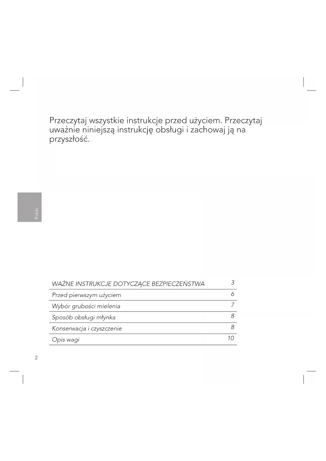 - Nie otwieraj obudowy produktu, ponieważ spowoduje to unieważnienie gwarancji.9 DanskDansk Polski Polski Rozwiązywanie problemów Problem Możliwe przyczyny Rozwiązanie Młynek do kawy nie włącza się Przewód zasilający jest odłączony Nieprawidłowe położenie po- jemnika zasypowego na ziarno Podłącz wtyczkę do gniazdka sieci elektrycznej Obróć pojemnik na ziarna, aby go zablokować. Młynek do kawy blokuje się Przy ustawieniu 1–4 żarna mogą się zatykać. Ustaw stopień zmielenia na 25 i włącz młynek z ziarnami w pojemniku. Stopniowo zmniejszaj wartość, nie wyłączając młynka. To spowoduje odetkanie żaren. W zależności od rodzaju ziaren, stopnia zużycia i kalibracji fabrycznej młynka, dla ustawień odpowiadających najdrobniejszemu mieleniu urządzenie może się zatykać. Aby określić ustawienie najdrobniejszego mielenia, przy którym młynek się nie zatyka, stopniowo zmniejszaj wartość stopnia zmielenia, aż żarna zatkają się. Jeśli zatkanie nastąpi dla ustawienia 3, używaj ustawienia 4 jako najdrob- niejszego. Młynek mieli kawę grubo nawet po ustawieniu najdrob- niejszego mielenia Pojemnik na ziarno nie został całkowicie obrócony. Jeśli kawa jest grubo mielona po ustawieniu drobnego mielenia, głowica może nie być usta- wiona prawidłowo. Spróbuj obrócić pojemnik na ziarna o jeszcze jeden obrót. Trudno regulować stopień zmielenia dla ustawień drob- nego mielenia Zmielona ziarna mogły utknąć między żarnami. Nie wyłączając silnika, zmień mielenie na drobniejsze.10 DanskDansk Polski Polski