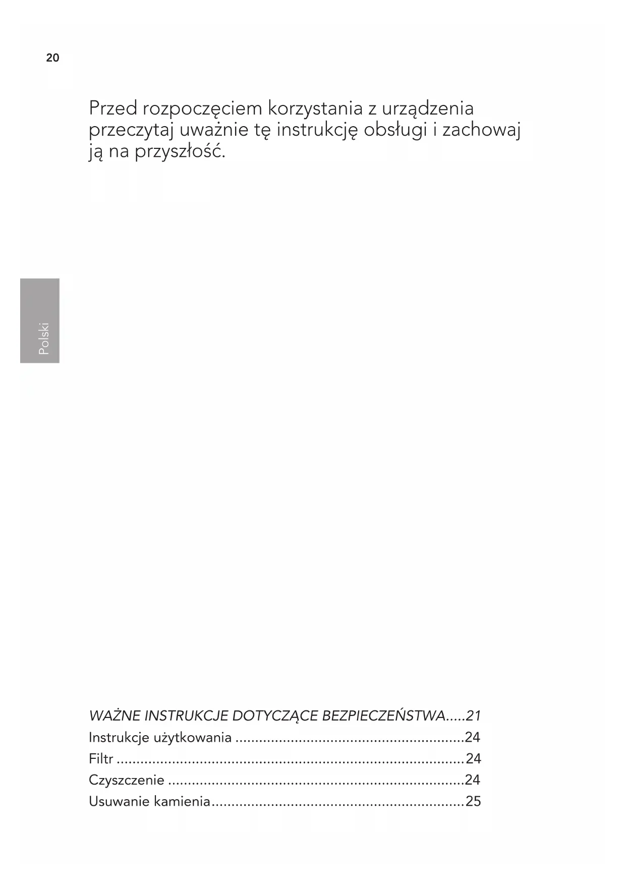 - Usuwanie kamienia Przed rozpoczęciem korzystania z urządzenia przeczytaj uważnie tę instrukcję obsługi i zachowaj ją na przyszłość.21 Polski p. 25