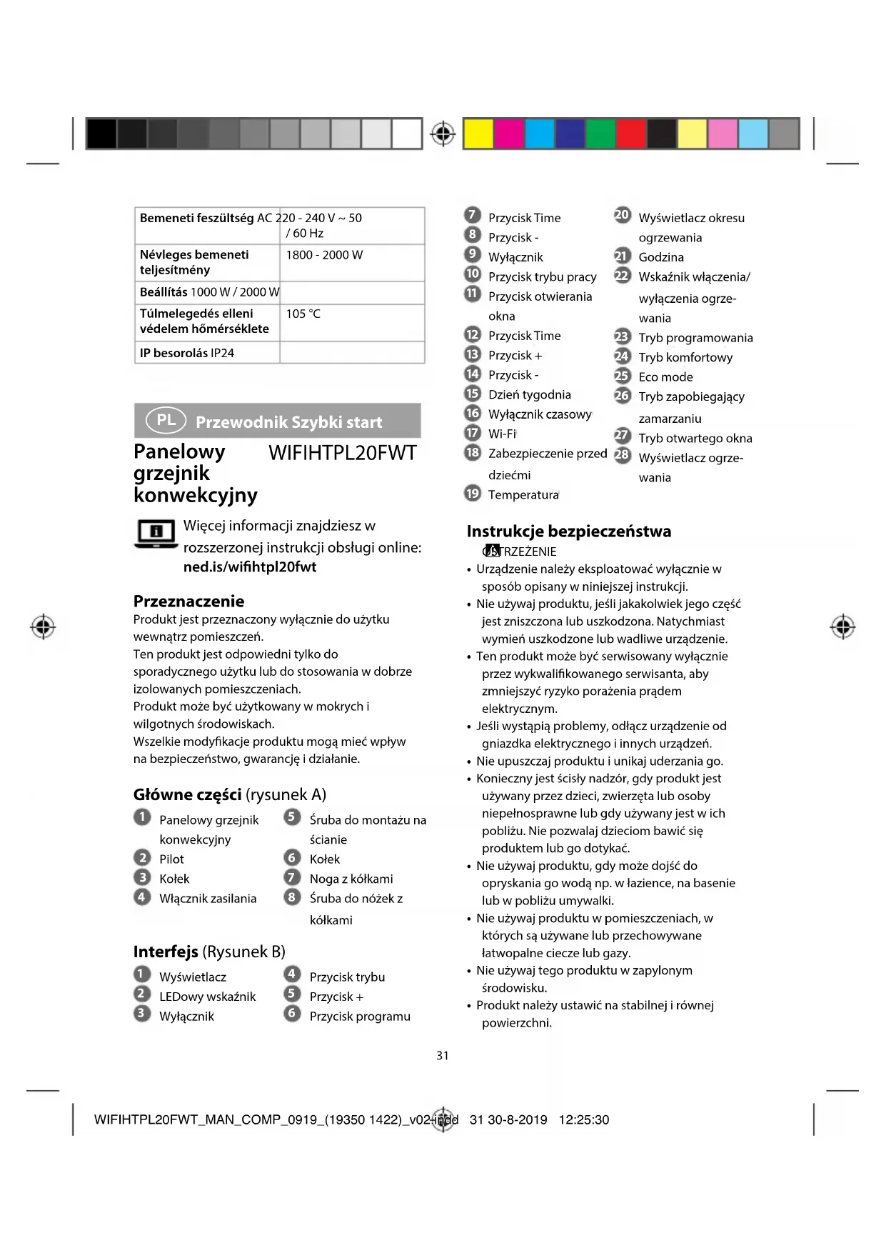 Przewodnik Szybki start Panelowy grzejnik konwekcyjny WIFIHTPL20FWT Więcej informacji znajdziesz w rozszerzonej instrukcji obsługi online: ned.is/wihtpl20fwt Przeznaczenie Produkt jest przeznaczony wyłącznie do użytku wewnątrz pomieszczeń.Ten produkt jest odpowiedni tylko do sporadycznego użytku lub do stosowania w dobrze izolowanych pomieszczeniach.Produkt może być użytkowany w mokrych i wilgotnych środowiskach.Wszelkie modykacje produktu mogą mieć wpływ na bezpieczeństwo, gwarancję i działanie. Główne części (rysunek A)