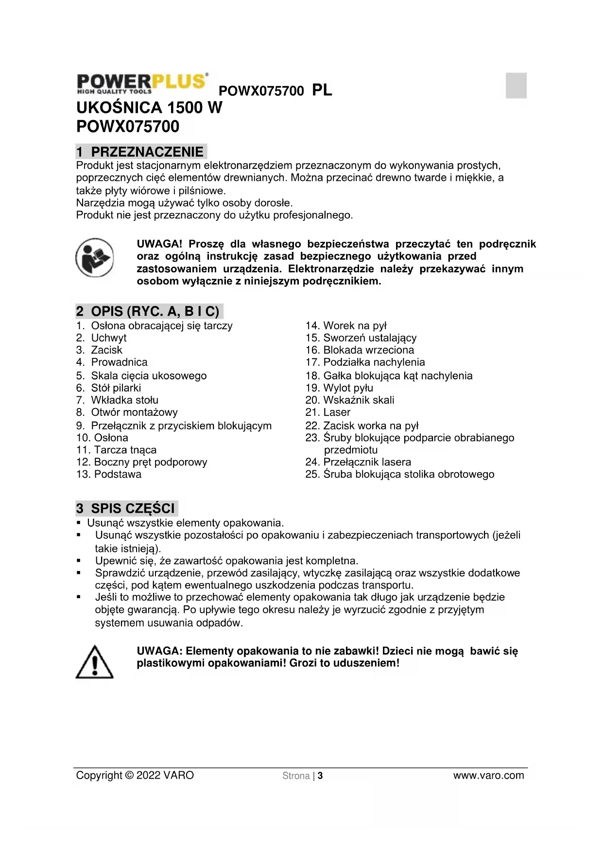 - Jeśli to możliwe to przechować elementy opakowania tak długo jak urządzenie będzie objęte gwarancją. Po upływie tego okresu należy je wyrzucić zgodnie z przyjętym systemem usuwania odpadów. UWAGA: Elementy opakowania to nie zabawki! Dzieci nie mogą bawić się plastikowymi opakowaniami! Grozi to uduszeniem!POWX075700 PL Copyright © 2022 VARO Strona | 4 www.varo.com W opakowaniu znajdują się: 1 ukośnica 1 tarcza tnąca (zamontowana) Klucz sześciokątny 6 mm 1 zacisk drewniany 1 worek na pył 2 boczne pręty podporowe 1 przystawka do odkurzacza 1 instrukcja obsługi W razie braku lub uszkodzenia części, prosimy skontaktować się ze sprzedawcą. 4 OZNACZENIA W niniejszej instrukcji i/lub na urządzeniu użyto następujących symboli: