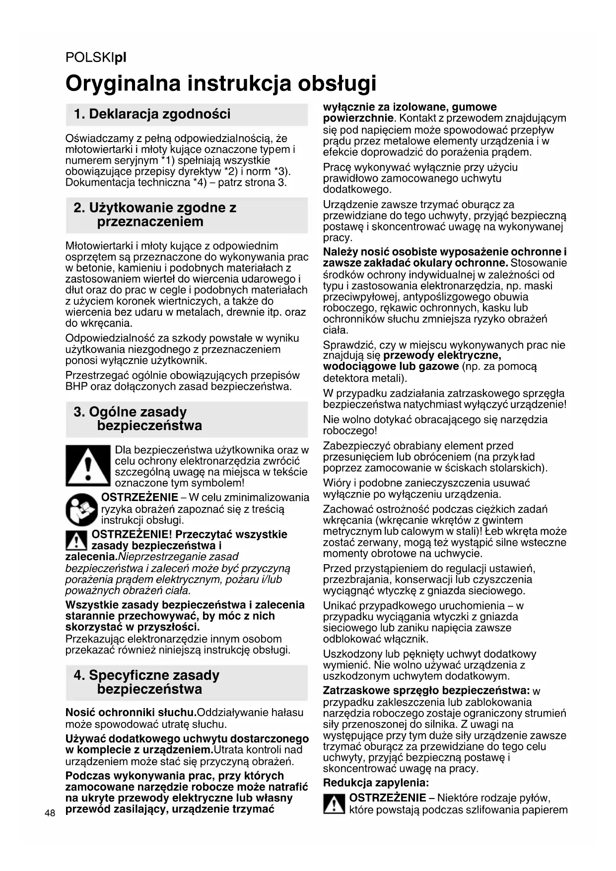 Oświadczamy z pełną odpowiedzialnością, że młotowiertarki i młoty kujące oznaczone typem i numerem seryjnym *1) spełniają wszystkie obowiązujące przepisy dyrektyw *2) i norm *3). Dokumentacja techniczna *4) – patrz strona 3. Młotowiertarki i młoty kujące z odpowiednim osprzętem są przeznaczone do wykonywania prac w betonie, kamieniu i podobnych materiałach z zastosowaniem wierteł do wiercenia udarowego i dłut oraz do prac w cegle i podobnych materiałach z użyciem koronek wiertniczych, a także do wiercenia bez udaru w metalach, drewnie itp. oraz do wkręcania. Odpowiedzialność za szkody powstałe w wyniku użytkowania niezgodnego z przeznaczeniem ponosi wyłącznie użytkownik. Przestrzegać ogólnie obowiązujących przepisów BHP oraz dołączonych zasad bezpieczeństwa. Dla bezpieczeństwa użytkownika oraz w celu ochrony elektronarzędzia zwrócić szczególną uwag ę na miejsca w tekście oznaczone tym symbolem! OSTRZEŻENIE – W celu zminimalizowania ryzyka obrażeń zapoznać się z treścią instrukcji obsługi. OSTRZEŻENIE! Przeczytać wszystkie zasady bezpieczeństwa i zalecenia.Nieprzestrzeganie zasad bezpieczeństwa i zaleceń może być przyczyną porażenia prądem elektrycznym, pożaru i/lub poważnych obrażeń ciała. Wszystkie zasady bezpieczeństwa i zalecenia starannie przechowywać, by móc z nich skorzystać w przyszłości. Przekazując elektronarzędzie innym osobom przekazać również niniejszą instrukcję obsługi. Nosić ochronniki słuchu.Oddziaływanie hałasu może spowodować utratę słuchu. Używać dodatkowego uchwytu dostarczonego w komplecie z urządzeniem.Utrata kontroli nad urządzeniem może stać się przyczyną obrażeń. Podczas wykonywania prac, przy których zamocowane narzędzie robocze może natrafić na ukryte przewody elektryczne lub własny przewód zasilający, urządzenie trzymać wyłącznie za izolowane, gumowe powierzchnie. Kontakt z przewodem znajdującym się pod napięciem może spowodować przepływ prądu przez metalowe elementy urządzenia i w efekcie doprowadzić do porażenia prądem. Pracę wykonywać wyłącznie przy użyciu prawidłowo zamocowanego uchwytu dodatkowego. Urządzenie zawsze trzymać oburącz za przewidziane do tego uchwyty, przyjąć bezpieczną postawę i skoncentrować uwagę na wykonywanej pracy. Należy nosić osobiste wyposażenie ochronne i zawsze zakładać okulary ochronne. Stosowanie środków ochrony indywidualnej w zależności od typu i zastosowania elektronarzędzia, np. maski przeciwpyłowej, antypoślizgowego obuwia roboczego, rękawic ochronnych, kasku lub ochronników słuchu zmniejsza ryzyko obrażeń ciała. Sprawdzić, czy w miejscu wykonywanych prac nie znajdują się przewody elektryczne, wodociągowe lub gazowe (np. za pomocą detektora metali). W przypadku zadziałania zatrzaskowego sprzęgła bezpieczeństwa natychmiast wyłączyć urządzenie! Nie wolno dotykać obracającego się narzędzia roboczego! Zabezpieczyć obrabiany element przed przesunięciem lub obróceniem (na przyk ład poprzez zamocowanie w ściskach stolarskich). Wióry i podobne zanieczyszczenia usuwać wyłącznie po wyłączeniu urządzenia. Zachować ostrożność podczas ciężkich zadań wkręcania (wkręcanie wkrętów z gwintem metrycznym lub calowym w stali)! Łeb wkręta może zostać zerwany, mogą też wystąpić silne wsteczne momenty obrotowe na uchwycie. Przed przystąpieniem do regulacji ustawień, przezbrajania, konserwacji lub czyszczenia wyciągnąć wtyczkę z gniazda sieciowego. Unikać przypadkowego uruchomienia – w przypadku wyciągania wtyczki z gniazda sieciowego lub zaniku napięcia zawsze odblokować włącznik. Uszkodzony lub pęknięty uchwyt dodatkowy wymienić. Nie wolno używać urządzenia z uszkodzonym uchwytem dodatkowym. Zatrzaskowe sprzęgło bezpieczeństwa: