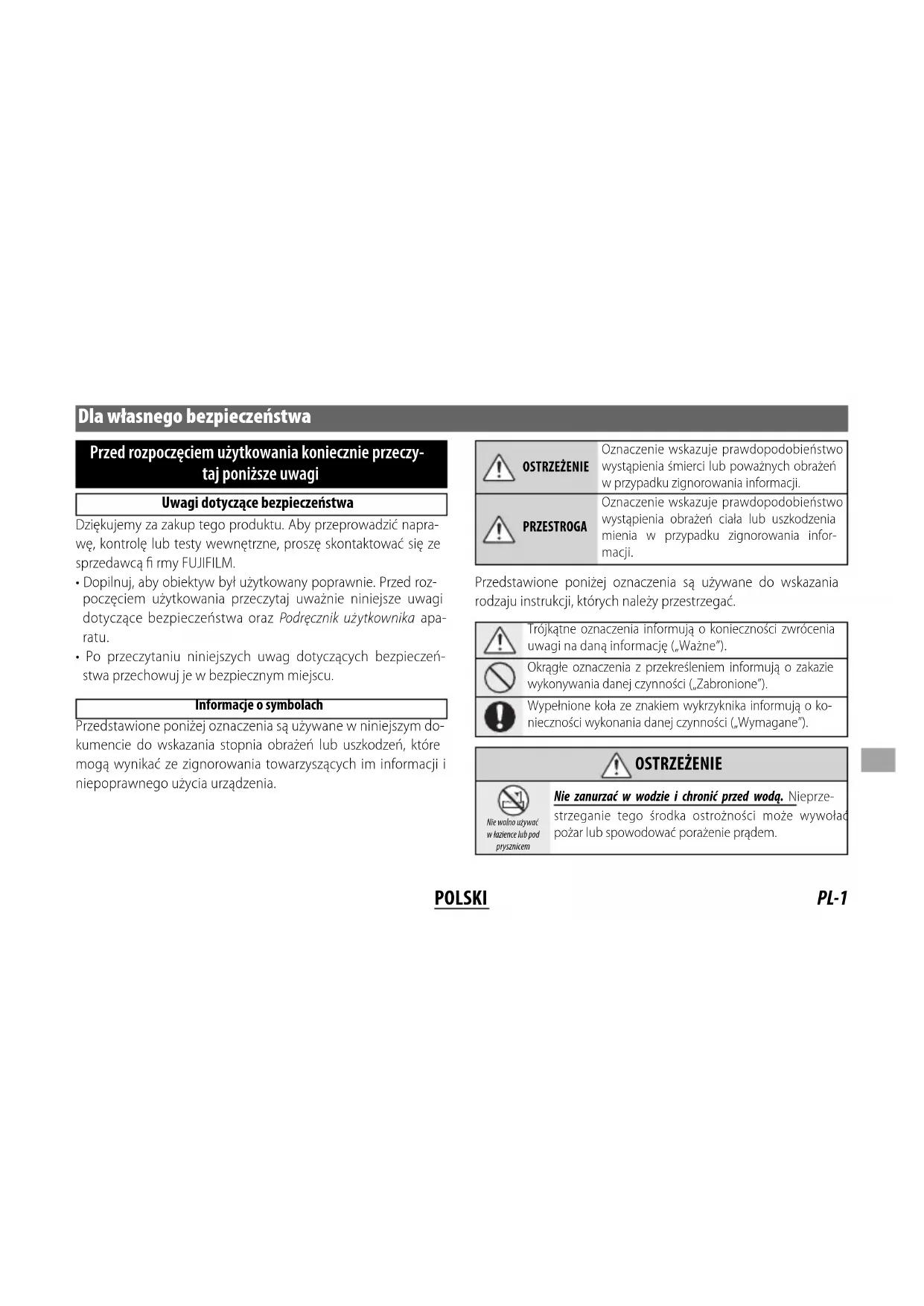 PRZESTROGA PRZESTROGA Nie przenosić aparatu ani obiektywu przymocowanych do statywu. Produkt może spaść lub w coś uderzyć, po- wodując obrażenia ciała. Utylizacja zużytych urządzeń elektrycznych i elektronicznych w gospodarstwach Utylizacja zużytych urządzeń elektrycznych i elektronicznych w gospodarstwach domowych domowych W Unii Europejskiej, Norwegii, Islandii i Liechtensteinie: Ten symbol umieszczony na produkcie lub w instrukcji obsługi i gwarancji oraz/ lub na opakowaniu oznacza, że tego produktu nie należy traktować jak zwykłego odpadu z gospodarstw domowych. Należy go natomiast oddać do odpowiedniego punktu zbiórki i recyklingu urządzeń elektrycznych i elektronicznych. Dzięki właściwej utylizacji tego produktu pomagasz uniknąć potencjalnie negatywnych skutków dla środowiska i zdrowia ludzi, na które mogłoby mieć wpływ nieodpowiednie pozbycie się tego produktu. Recykling materiałów pomaga oszczędzać zasoby naturalne. Aby uzyskać bardziej szczegółowe informacje na temat recyklingu tego produktu, skontaktuj się lokalnym urzędem miasta, fi rmą odpowiadającą za wywóz odpadów lub miejscem sprzedaży produktu. W krajach poza Unią Europejską, Norwegią, Islandią i Liechtensteinem: Jeśli chcesz pozbyć się tego produktu wraz z bateriami lub akumulatorami, skontaktuj się z lokalnymi władzami i zapytaj o właściwy sposób utylizacji.PL-4 POLSKI Przed rozpoczęciem użytkowania tego produktu Niektóre funkcje obiektywu nie są dostępne w przy- padku starszych wersji oprogramowania sprzętowe- go aparatu. Pamiętaj, aby zaktualizować oprogra- mowanie sprzętowe aparatu do najnowszych wersji. Wskazówki jak sprawdzić wersję oprogramowania aparatu oraz jak uaktualnić oprogramowanie apara- tu znajdują się na następującej stronie internetowej: http://www.fujifilm.com/support/digital_cameras/software/ #firmware Jeśli nie masz dostępu do komputera, pomoc można uzyskać u lokalnego dystrybutora, którego znajdziesz na liście znajdującej się w materiale „Ogólnoświatowa sieć FUJIFILM”, dołączonym do aparatu. Pielęgnacja produktu