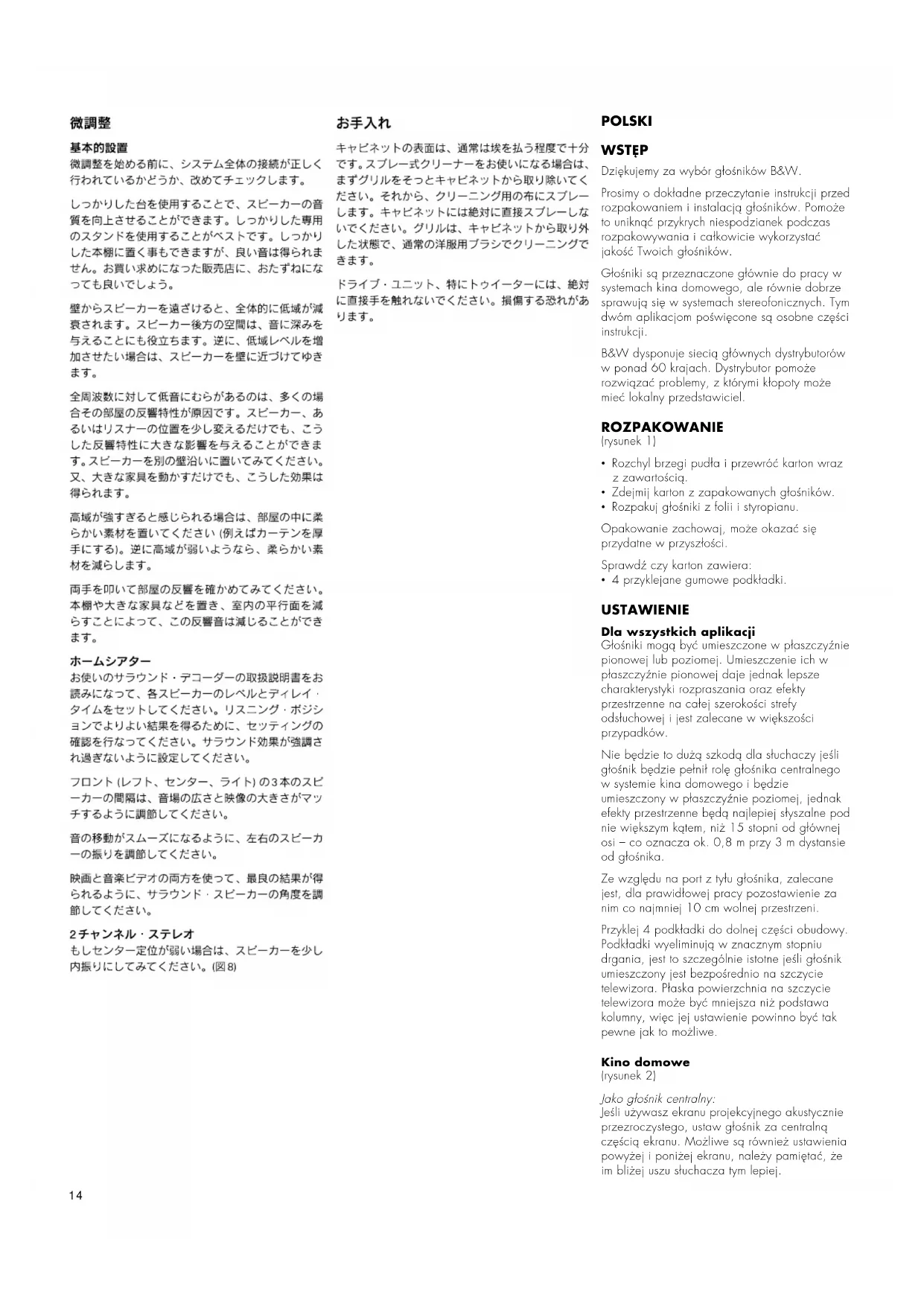 - ciankƒ kolumny zalecane jest umieszczanie wszystkich, magnetycznie czu¡ych, przedmiotów (takich jak, dyskietki, ta·my audio i wideo itp.) w odleg¡o·ci co najmniej 0,2 m od g¡o·nika. POD¿√CZENIA Wszystkie pod¡ƒczenia powinny zostaπ wykonane przy wy¡ƒczonych urzƒdzeniach. Z ty¡u znajduje si∆ terminal zawierajƒcy 2 pary gniazd, po¡ƒczonych zworami, przeznaczonych do zrealizowanie pod¡ƒczenia bi-wiring. KaÃda z oddzielnej pary gniazd powinna zostaπ po¡ƒczona 2 Ãy¡owym przewodem wysokiej klasy ze wzmacniaczem – niezb∆dne jest wówczas wyj∆cie zwór. W przypadku tradycyjnego pod¡ƒczenia jednym kablem jednej kolumny zwory powinny pozostaπ na swoim miejscu. NaleÃy wtedy uÃyπ jednej z dwóch par gniazd (rysunek 6). Upewnij si∆, czy dodatnie gniazdo kolumny (oznaczone + i kolorem czerwonym) jest pod¡ƒczone do dodatniego wyj·cia wzmacniacza oraz czy ujemne gniazdo kolumny (oznaczone – i kolorem czarnym) do ujemnego wyj·cia wzmacniacza. Odwrotne pod¡ƒczenie spowoduje wyeliminowanie efektów przestrzennych i utrat∆ basu. Przy pod¡ƒczeniu bi-wiring naleÃy nieco odkr∆ciπ nakr∆tki na terminalach po czym wyjƒπ zwory. Konieczne jest uÃycie 2 Ãy¡owego kabla do kaÃdej pary terminali (dwa 2 Ãy¡owe kable do kaÃdej kolumny) (rysunek 7). Pod¡ƒczenie tego typu znacznie poprawi precyzj∆ niskotonowych dØwi∆ków. Niezwykle istotna jest takÃe prawid¡owa polaryzacja (+ do +, – do –). Przy pod¡ƒczeniu bi-wiring b¡∆dna polaryzacja moÃe znacznie zdeformowaπ charakterystyk∆ przenoszenia g¡o·ników. Spytaj o rad∆ przedstawiciela B&W przy wyborze przewodów g¡o·nikowych. Ca¡kowita impedancja przewodu powinna byπ poniÃej najwyÃszej rekomendowanej w danych technicznych kolumny. UÃyte kable powinny mieπ takÃe niskƒ indukcyjno·π by uniknƒπ t¡umienia najwyÃszych cz∆stotliwo·ci. DOSTRAJANIE Dla wszystkich aplikacji Zanim przystƒpisz do finalnego zestrojenia systemu sprawdØ czy wszystkie po¡ƒczenia w instalacji sƒ poprawne i bezpieczne. Bezw¡adno·π mocowania moÃe wp¡ynƒπ na jako·π brzmienia g¡o·ników. Dla najlepszego efektu zamocuj glo·niki na firmowym wysi∆gniku. Umiejscowienie g¡osnika na pó¡ce os¡abi moÃliwo·ci soniczne produktu. W razie problemów zg¡o· si∆ po pomoc do swojego sprzedawcy. Odsu◊ g¡o·niki dalej od ·cian by zredukowaπ poziom basu. Przestrze◊ za kolumnami pomoÃe równieà osiƒgnƒπ lepsze wraÃenie g¡∆bi. Odwrotnie, przysu◊ g¡o·niki bliÃej ·cian je·li chcesz zwi∆kszyπ poziom basu. Nieliniowo·π najniÃszego zakresu cz∆stotliwo·ci jest zazwyczaj spowodowana rezonansami powstajƒcymi w pomieszczeniu. Zmiany w ustawieniu kolumn lub pozycji s¡uchaczy mogƒ mieπ g¡∆boki wp¡yw na sposób w jaki rezonanse oddzia¡ywajƒ na dØwi∆k. Spróbuj zainstalowaπ kolumny wzd¡uà innej ·ciany. Nawet przesuni∆cie duÃych mebli moÃe daπ znakomity efekt. JeÃeli dØwi∆k jest za szorstki zwi∆ksz ilo·π mi∆kkich przedmiotów w pomieszczeniu (np. uÃyj ci∆Ãszych zas¡on). Zredukuj liczb∆ podobnych elementów wyposaÃenia je·li brzmienie jest t∆pe i pozbawione Ãycia. SprawdØ jakie jest echo w pokoju (klaszczƒc w d¡onie), nas¡uchuj ostrych i gwa¡townych odpowiedzi. Zredukuj niepoÃdane echo przy uÃyciu przedmiotów o nieregularnie ukszta¡towanych powierzchniach takich jak pó¡ki pe¡ne ksiƒÃek czy duÃe meble. Kino domowe Zgodnie z instrukcjƒ twojego wzmacniacza, ustaw poziomy i opóÃnienia dla wszystkich g¡osników. SprawdØ ustawienia dla uzyskania moÃliwie najlepszego rezultatu we wszystkich moÃliwych miejscach ods¡uchu. Poza efektami specjalnymi, odbiór z g¡o·ników efektowych nie powinien byπ zbyt jasny. Reguluj odleg¡o·π mi∆dzy g¡o·nikami tak, aby efekt akustyczny by¡ odpowiedni do rozmiaru ekranu. Reguluj kƒt skr∆cenia g¡o·ników przednich dla uzyskania najlepszej transmisji dØwi∆ku. Reguluj kƒt skr∆cenia g¡o·ników tylnych dla uzyskania najlepszych warunków ods¡uchu zarówno filmów, jak i wideoklipów. System stereofoniczny Je·li lokalizacja i efekty stereofoniczne z przednich g¡o·ników sƒ s¡abe, to spróbuj zbliÃyπ je do siebie oraz zmie◊ ich kƒt promieniowania (rysunek 8). METODA CZYSZCZENIA Powierzchnie obudowy zazwyczaj wymagajƒ odkurzania. Je·li chcesz uÃyπ p¡ynu w aerozolu najpierw zdejmij maskownic∆. Do czyszczenia uÃyj czystej szmatki, p¡yn na¡óà w¡a·nie na niƒ a nie wprost na obudow∆. Do czyszczenia maskownicy moÃna uÃyπ zwyczajnej, delikatnej, szczotki do ubrania. Unikaj dotykania g¡o·ników, szczególnie wysokotonowego – moÃe to spowodowaπ powaÃne uszkodzenia. 15"ESKY ÚVOD D>kujeme, ãe jste si vybrali zna#ku B&W. P_e#t>te si prosím cel≥ návod p_edtím, neã úpln> vybalíte a instalujete v≥robek. Umoãní Vám to optimalizovat pouãití. Reproduktor je prvotn> ur#en pro instalace domácího kina, ale rovn>ã ho lze pouãít i pro dvoukanálov≥ zvuk. V návodu se t>mto dv>ma aplikacím v>nují zvlá|tní #ásti. B&W udrãuje sít’ v≥hradních distributorÅ ve více neã 60 zemích sv>ta, kte_í Vám pomohou vy_e|it Vá| problém v p_ípad>, ãe Vám nebude schopen pomoci Vá| prodejce. VYBALENÍ (obrázek 1)
