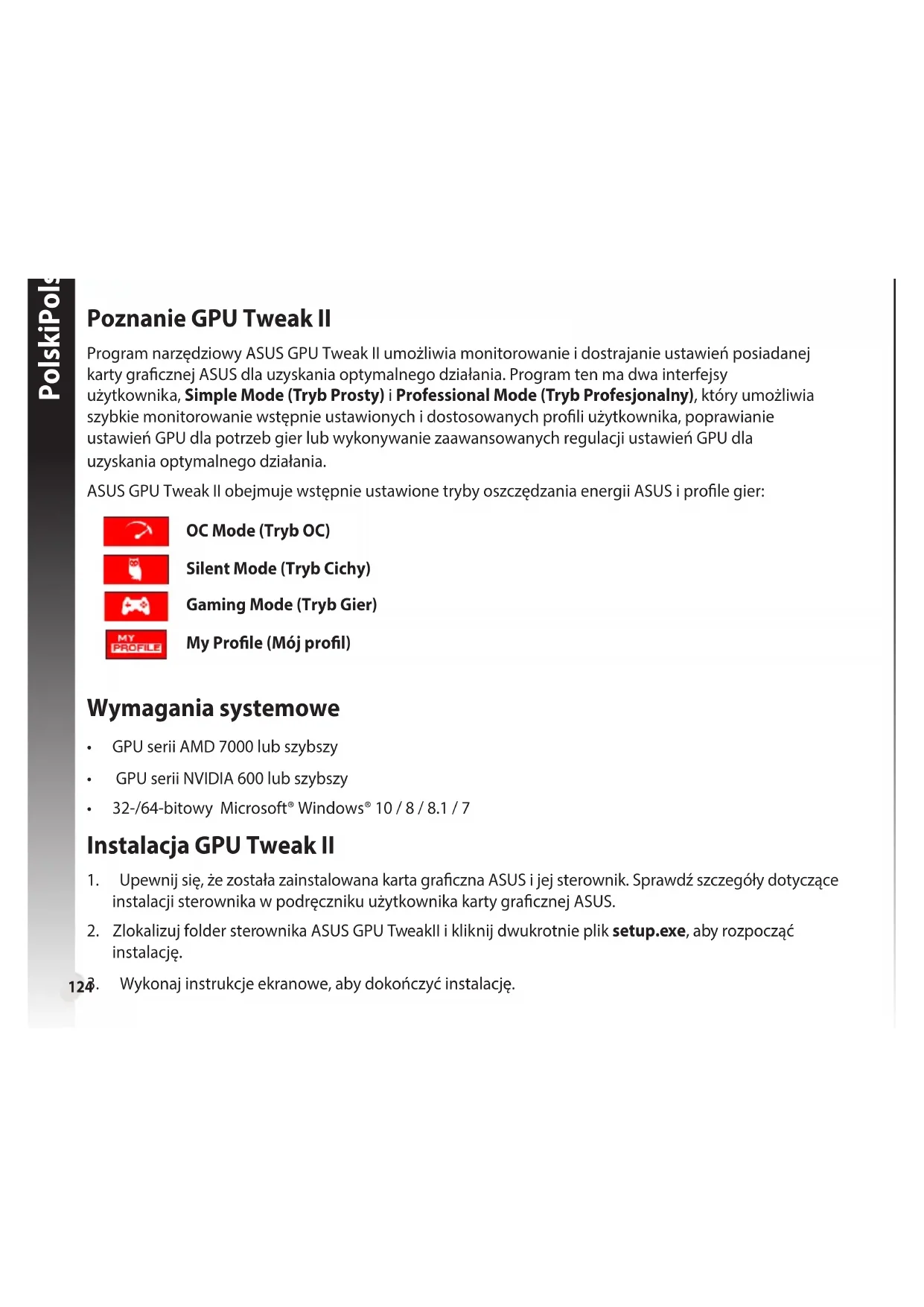 - Noticar-me mas não transferir nem instalar as atualizações automaticamente: Selecione esta opção para receber apenas noticações e decidir se deseja transferir e instalar as atualizações manualmente. DeniçõesdeLive Update (Atualização)123 Português Português Atalhos do teclado Ativar/desativarosAtalhosdetecladoparamostrarrapidamenteoecrãprincipalouaplicaralgunsajustes rápidos. Denições de atalhos do teclado124 PolskiPolski Poznanie GPU Tweak II Program narzędziowy ASUS GPU Tweak II umożliwia monitorowanie i dostrajanie ustawień posiadanej karty gracznej ASUS dla uzyskania optymalnego działania. Program ten ma dwa interfejsy użytkownika, Simple Mode (Tryb Prosty) i Professional Mode (Tryb Profesjonalny), który umożliwia szybkie monitorowanie wstępnie ustawionych i dostosowanych proli użytkownika, poprawianie ustawień GPU dla potrzeb gier lub wykonywanie zaawansowanych regulacji ustawień GPU dla uzyskania optymalnego działania. ASUS GPU Tweak II obejmuje wstępnie ustawione tryby oszczędzania energii ASUS i prole gier: OC Mode (Tryb OC) Silent Mode (Tryb Cichy) Gaming Mode (Tryb Gier) My Prole (Mój prol) Wymagania systemowe
