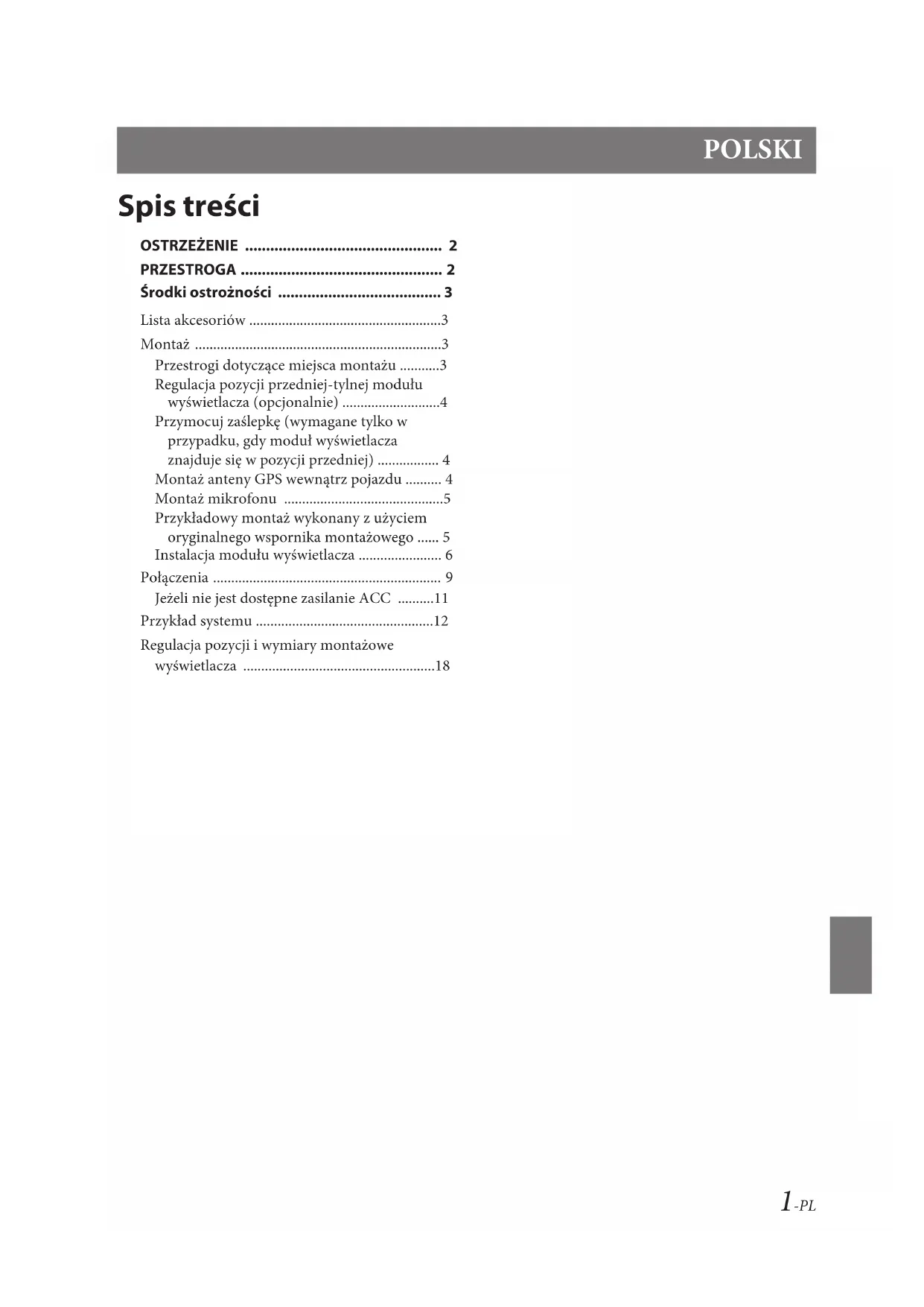 - Regulacja pozycji i wymiary montażowe wyświetlacza -PL NIE ROZKŁADAĆ I NIE WYKONYWAĆ SAMODZIELNYCH MODYFIKACJI. W przeciwnym wypadku może dojść do wypadku, pożaru lub porażenia prądem. NIEWIELKIE PRZEDMIOTY, TAKIE JAK WKRĘTY, PRZECHOWYWAĆ W MIEJSCU NIEDOSTĘPNYM DLA DZIECI. Połknięcie może spowodować poważne obrażenia ciała. W wypadku połknięcia należy niezwłocznie skontaktować się z lekarzem. PRZY WYMIANIE BEZPIECZNIKÓW NALEŻY PRZESTRZEGAĆ WŁAŚCIWEGO NATĘŻENIA PRĄDU. Niezastosowanie się do tego wymogu może spowodować pożar lub porażenie prądem. NIE ZAKRYWAĆ OTWORÓW WENTYLACYJNYCH I PANELI RADIATORÓW. W przeciwnym wypadku nieodprowadzone ciepło może spowodować zapalenie urządzenia. URZĄDZENIE STOSOWAĆ TYLKO W MOBILNYCH INSTALACJACH PRĄDU 12 V. Niezastosowanie się do tego wymogu może spowodować pożar, porażenie prądem lub inne obrażenia ciała. PRAWIDŁOWO PODŁĄCZYĆ URZĄDZENIE. Nieprawidłowe podłączenie może spowodować pożar lub uszkodzenie urządzenia. UŻYWAĆ TYLKO W POJAZDACH Z ZASILANIEM 12 V I UJEMNYM UZIEMIENIEM. (W razie wątpliwości należy skontaktować się z najbliższym przedstawicielem firmy). Niezastosowanie się do tego wymogu może spowodować pożar lub inne wypadki. PRZED PODŁĄCZENIEM PRZEWODÓW NALEŻY ODŁĄCZYĆ PRZEWÓD OD UJEMNEGO BIEGUNA AKUMULATORA. Niezastosowanie się do tego wymogu może spowodować porażenie prądem lub obrażenia ciała w wyniku zwarcia instalacji elektrycznej. NIE DOPUŚCIĆ, ABY KABLE ZAPLĄTAŁY SIĘ W PRZYLEGŁE PRZEDMIOTY. Ułożyć wiązki i kable zgodnie z instrukcją, aby uniknąć zablokowania ruchu podczas jazdy. Kable lub wiązki blokujące ruch albo zwisające z koła kierownicy, dźwigni zmiany biegów, pedału hamulca itp. stanowią ogromne niebezpieczeństwo. NIE WOLNO SPLATAĆ ZE SOBĄ PRZEWODÓW ELEKTRYCZNYCH. Nie wolno zdejmować z kabli elektrycznych izolacji w celu doprowadzenia prądu do innych urządzeń. W przeciwnym wypadku nastąpi przekroczenie obciążalności prądowej przewodu, czego skutkiem będzie pożar lub porażenie prądem. W TRAKCIE WIERCENIA UWAŻAĆ, ABY NIE USZKODZIĆ RUR I PRZEWODÓW SAMOCHODU. W wypadku konieczności wiercenia dziur w podwoziu należy przedsięwziąć wszelkie środki ostrożności, aby nie uszkodzić ani nie zablokować rur, przewodu paliwowego, baku albo instalacji elektrycznej. Niezastosowanie odpowiednich środków ostrożności może być przyczyną pożaru. NIE UZIEMIAĆ INSTALACJI ELEKTRYCZNEJ ZA POŚREDNICTWEM ŚRUB I NAKRĘTEK UKŁADU HAMULCOWEGO I KIEROWNICZEGO. Śruby i nakrętki wykorzystywane w układzie hamulcowym, kierowniczym (i w innych układach mających wpływ na bezpieczeństwo pojazdu) jak również baku, BEZWZGLĘDNIE nie mogą być wykorzystywane jako elementy instalacji elektrycznej ani uziemiającej. W przeciwnym wypadku może dojść do utraty kontroli nad pojazdem, pożaru, itp. NIE WOLNO MONTOWAĆ URZĄDZENIA W MIEJSCU, W KTÓRYM UTRUDNIAŁOBY ONO STEROWANIE POJAZDEM, TAKIM JAK KIEROWNICA CZY DŹWIGNIA ZMIANY BIEGÓW. W przeciwnym wypadku może dojść do ograniczenia widoczności kierowcy i/lub ograniczenia jego ruchów, a w konsekwencji do poważnego wypadku. NIE WOLNO INSTALOWAĆ MONITORA W POBLIŻU PODUSZKI POWIETRZNEJ PASAŻERA. Jeśli urządzenie nie zostanie zainstalowane prawidłowo, poduszka powietrzna może nie działać prawidłowo, a po wyzwoleniu może spowodować wyrzucenie monitora do góry, powodując wypadeki obrażenia. WYKONANIE I PODŁĄCZENIE INSTALACJI KABLOWEJ NALEŻY POZOSTAWIĆ SPECJALIŚCIE. Wykonanie i podłączenie instalacji do tego urządzenia wymaga specjalistycznych umiejętności technicznych i doświadczenia. Ze względów bezpieczeństwa należy zlecić te prace przedstawicielowi firmy, od której urządzenie zostało nabyte. DO PRAC MONTAŻOWYCH STOSOWAĆ WYSZCZEGÓLNIONE AKCESORIA I MOCOWAĆ JE W SPOSÓB PEWNY. Zawsze stosować wyłącznie wyszczególnione akcesoria. Użycie części innych niż wyszczególnione może skutkować uszkodzeniem podzespołów wewnętrznych urządzenia lub jego niewłaściwym zamocowaniem. W efekcie części mogą ulec poluzowaniu i stanowić zagrożenie dla ludzi lub innych przedmiotów. PRZEWODY INSTALACJI NALEŻY POPROWADZIĆ W TAKI SPOSÓB, BY NIE BYŁY ŚCIŚNIĘTE OSTRYMI METALOWYMI KRAWĘDZIAMI. Kable i przewody należy poprowadzić z dala od części ruchomych (jak np. szyn siedzeń) oraz ostrych lub spiczastych krawędzi. Zapobiegnie to ściśnięciu przewodu i uszkodzeniu instalacji. Jeżeli konieczne jest przeprowadzenie przewodów przez otwór w metalu, należy zastosować gumową przelotkę, aby zapobiec ocieraniu się izolacji o krawędź metalu. NIE MONTOWAĆ W MIEJSCACH O DUŻEJ WILGOTNOŚCI LUB ZAPYLENIU. Unikać montażu urządzenia w miejscach o dużej wilgotności lub zapyleniu. Wilgoć i pył przenikają do wnętrza urządzenia i mogą powodować awarie. OSTRZEŻENIE Ten symbol umieszczany jest przy ważnych instrukcjach. Nieprzestrzeganie ich może spowodować poważne obrażenia ciała lub śmierć. PRZESTROGA Ten symbol umieszczany jest przy ważnych instrukcjach. Nieprzestrzeganie ich może spowodować obrażenia ciała lub szkody materialne.3-PL Środki ostrożności p. 182