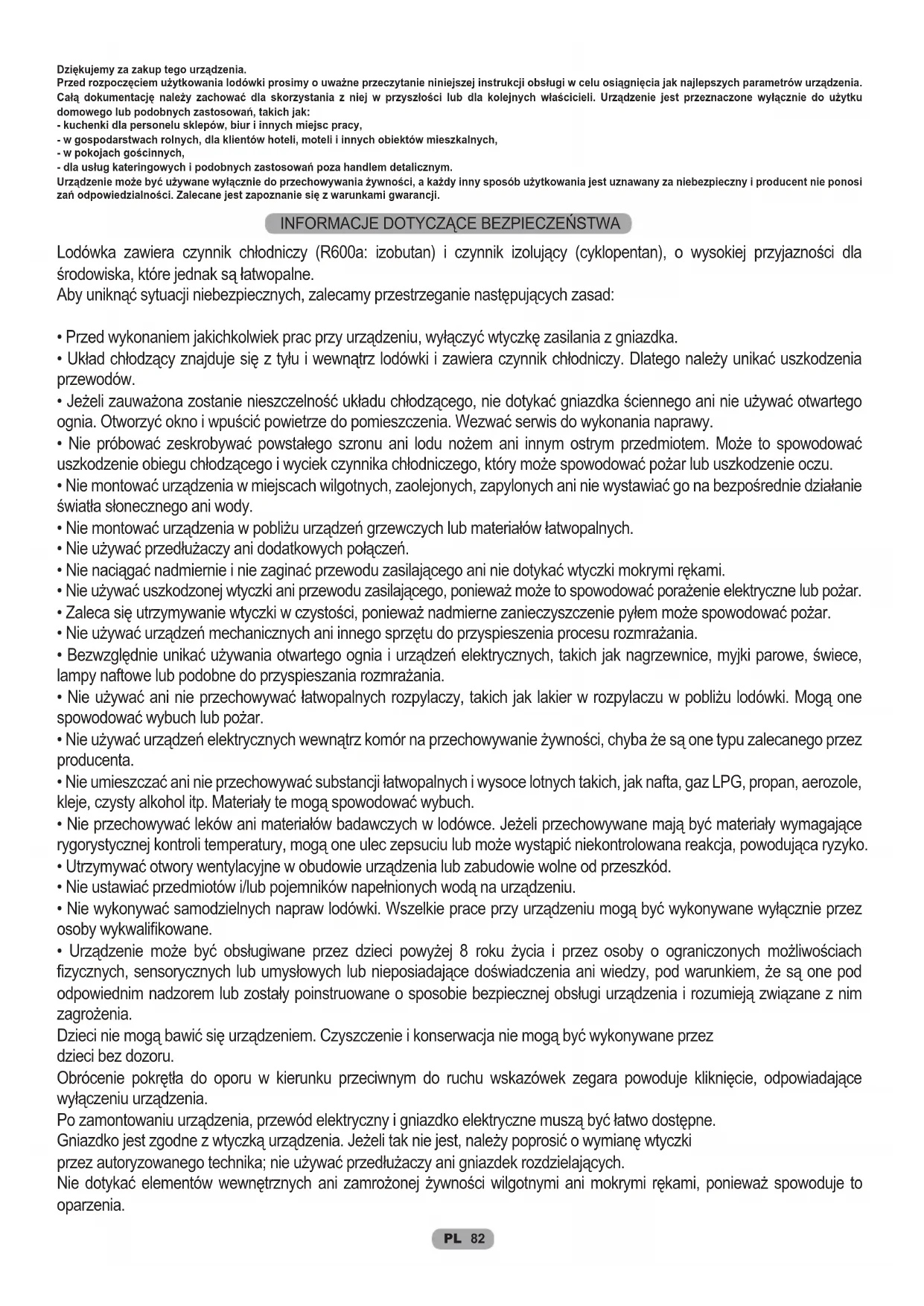 Dziękujemy za zakup tego urządzenia. Przed rozpoczęciem użytkowania lodówki prosimy o uważne przeczytanie niniejszej instrukcji obsługi w celu osiągnięcia jak najlepszych parametrów urządzenia. Całą dokumentację należy zachować dla skorzystania z niej w przyszłości lub dla kolejnych właścicieli. Urządzenie jest przeznaczone wyłącznie do użytku domowego lub podobnych zastosowań, takich jak: - kuchenki dla personelu sklepów, biur i innych miejsc pracy, - w gospodarstwach rolnych, dla klientów hoteli, moteli i innych obiektów mieszkalnych, - w pokojach gościnnych, - dla usług kateringowych i podobnych zastosowań poza handlem detalicznym. Urządzenie może być używane wyłącznie do przechowywania żywności, a każdy inny sposób użytkowania jest uznawany za niebezpieczny i producent nie ponosi zań odpowiedzialności. Zalecane jest zapoznanie się z warunkami gwarancji. Lodówka zawiera czynnik chłodniczy (R600a: izobutan) i czynnik izolujący (cyklopentan), o wysokiej przyjazności dla środowiska, które jednak są łatwopalne. Aby uniknąć sytuacji niebezpiecznych, zalecamy przestrzeganie następujących zasad: