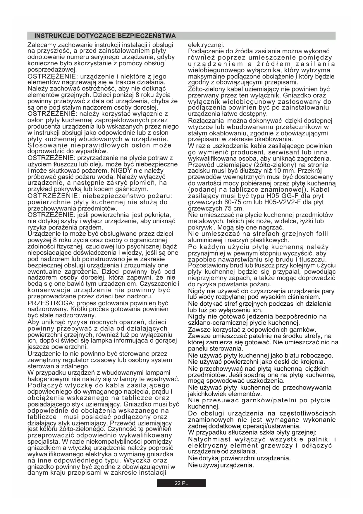 INSTALACJA URZĄDZENIA DOMOWEGO MOŻE BYĆ SKOMPLIKOWANĄ OPERACJĄ, KTÓRA JEŻELI NIE BĘDZIE WYKONANA PRAWIDŁOWO, MOŻE POWAŻNIE ZAGROZIĆ BEZPIECZEŃSTWU UŻYTKOWNIKA. DLATEGO TEŻ, ZADANIE TO POWINNO BYĆ WYKONANE PRZEZ OSOBĘ O ODPOWI ORAZ ZGODNIE Z OBOWIĄZUJĄCYMI PRZEPISAMI. W PRZYPADKU ZIGNOROWANIA NINIEJSZEGO ZALECENIA I WYKONANIA INSTALACJI PRZEZ OSOBĘ EDNICH KWALIFIKACJACH BEZ ODPOWIEDNICH KWALIFIKACJI, PRODUCENT NIE PONOSI ŻADNEJ ODPOWIEDZIALNOŚCI ZA JAKIEKOLWIEK USTERKI TECHNICZNE, BEZ WZGLĘDU NATO,CZY SPOWODUJĄ ONE SZKODYW MIENIU, CZY TEŻ USZKODZENIACIAŁAU LUDZI. Sprawdzić na tabliczce znamionowej dane dotyczące podłączenia do sieci elektrycznej oraz upewnić się, że kabel zasilający jest typu 3x0.75 mm² H05 GG-F dla płyt grzewczych 60-75 cm lub H05-V2V2- F dla płyt grzewczych 75 cm.