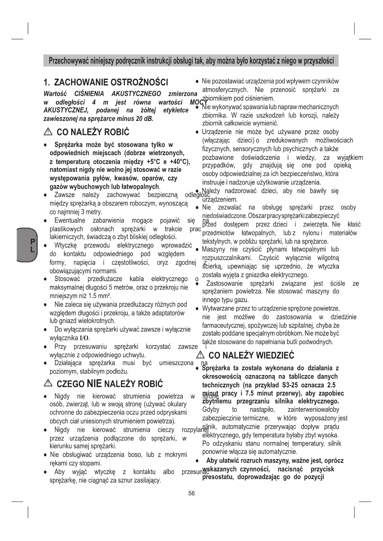 ● Sprężarka może być stosowana tylko w odpowiednich miejscach (dobrze wietrzonych, z temperaturą otoczenia między +5°C e +40°C), natomiast nigdy nie wolno jej stosować w razie występowania pyłów, kwasów, oparów, czy gazów wybuchowych lub łatwopalnych. ● Zawsze należy zachowywać bezpieczną odległość międzysprężarkąaobszaremroboczym,wynoszącą conajmniej3metry. ● Ewentualne zabarwienia mogące pojawić się na plastikowych osłonach sprężarki w trakcie prac lakierniczych,świadcząozbytbliskiejodległości. ● Wtyczkę przewodu elektrycznego wprowadzić do kontaktu odpowiedniego pod względem formy, napięcia i częstotliwości, oryz zgodnej z obowiązującyminormami. ● Stosować przedłużacze kabla elektrycznego o maksymalnejdługości5metrów,orazoprzekrojunie mniejszymniż1.5mm². ● Niezalecasięużywaniaprzedłużaczyróżnychpod względemdługościiprzekroju,atakżeadaptatorów lubgniazdwielokrotnych. ● Dowyłączaniasprężarkiużywaćzawszeiwyłącznie wyłącznika I/O. ● Przy przesuwaniu sprężarki korzystać zawsze i wyłączniezodpowiedniegouchwytu. ● Działająca sprężarka musi być umieszczona na poziomym,stabilnympodłożu.