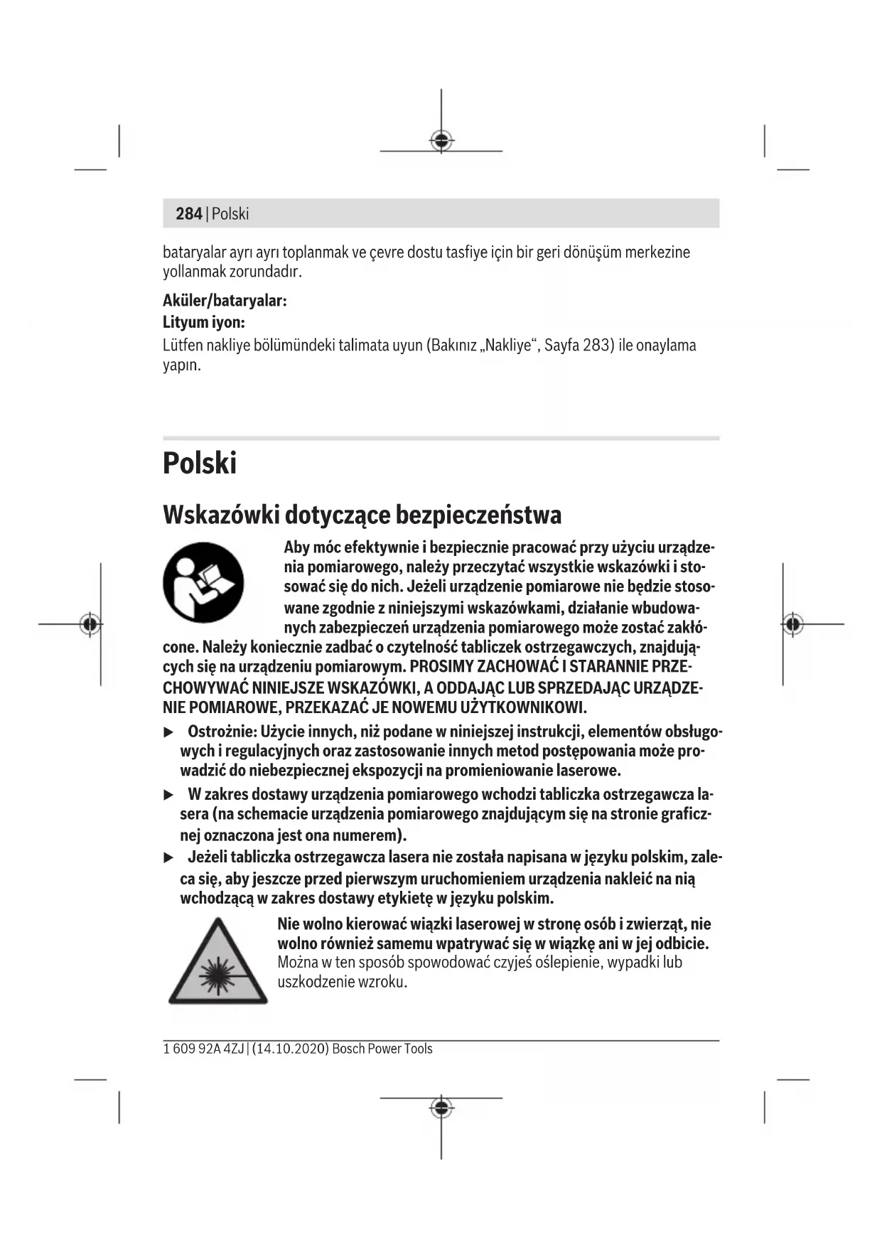 Karasoku Mahallesi 28028. Sokak No:20/A Merkez / ADANA Tel.: +903223599710 -3521379 Fax: +903223591323 E-mail: isiklar@isiklarelektrik.com Diğer servis adreslerini şurada bulabilirsiniz: www.bosch-pt.com/serviceaddresses Nakliye Lityum iyon aküler tehlikeli madde taşıma yönetmeliğine tabidir. Aküler başka bir yükümlülük olmaksızın kullanıcı tarafından caddeler üzerinde taşınabilir. Üçüncü kişiler eliyle yollanma durumunda (örneğin hava yolu ile veya nakliye şirketleri ile) paketleme ve etiketlemeye ilişkin özel hükümlere uyulmalıdır. Gönderi paketlenirken bir tehlikeli madde uzmanından yardım alınmalıdır. Aküleri sadece ve ancak gövdelerinde hasar yoksa gönderin. Açık kontakları kapatın ve aküyü ambalaj içinde hareket etmeyecek biçimde paketleyin. Lütfen olası ek ulusal yönetmelik hükümlerine de uyun. Tasfiye Ölçme cihazları, aküler/bataryalar, aksesuar ve ambalaj malzemesi çevre dostu tasfiye amacıyla bir geri kazanım merkezine yollanmalıdır. Ölçme cihazlarını ve aküleri/bataryaları evsel çöplerin içine atmayın! Sadece AB ülkeleri için: 2012/19/EU yönetmeliği uyarınca kullanım ömrünü tamamlamış ölçme cihazları ve 2006/66/EC yönetmeliği uyarınca arızalı veya kullanım ömrünü tamamlamış aküler/ Bosch Power Tools 1 609 92A 4ZJ | (14.10.2020)284 | Polski bataryalar ayrı ayrı toplanmak ve çevre dostu tasfiye için bir geri dönüşüm merkezine yollanmak zorundadır. Aküler/bataryalar: Lityum iyon: Lütfen nakliye bölümündeki talimata uyun (Bakınız „Nakliye“, Sayfa283) ile onaylama yapın. Polski Wskazówki dotyczące bezpieczeństwa Aby móc efektywnie i bezpiecznie pracować przy użyciu urządze- nia pomiarowego, należy przeczytać wszystkie wskazówki i sto- sować się do nich. Jeżeli urządzenie pomiarowe nie będzie stoso- wane zgodnie z niniejszymi wskazówkami, działanie wbudowa- nych zabezpieczeń urządzenia pomiarowego może zostać zakłó- cone. Należy koniecznie zadbać o czytelność tabliczek ostrzegawczych, znajdują- cych się na urządzeniu pomiarowym. PROSIMY ZACHOWAĆ I STARANNIE PRZE- CHOWYWAĆ NINIEJSZE WSKAZÓWKI, A ODDAJĄC LUB SPRZEDAJĄC URZĄDZE- NIE POMIAROWE, PRZEKAZAĆ JE NOWEMU UŻYTKOWNIKOWI. u Ostrożnie: Użycie innych, niż podane w niniejszej instrukcji, elementów obsługo- wych iregulacyjnych oraz zastosowanie innych metod postępowania może pro- wadzić do niebezpiecznej ekspozycji na promieniowanie laserowe. u W zakres dostawy urządzenia pomiarowego wchodzi tabliczka ostrzegawcza la- sera (na schemacie urządzenia pomiarowego znajdującym się na stronie graficz- nej oznaczona jest ona numerem). u Jeżeli tabliczka ostrzegawcza lasera nie została napisana w języku polskim, zale- ca się, aby jeszcze przed pierwszym uruchomieniem urządzenia nakleić na nią wchodzącą w zakres dostawy etykietę w języku polskim. Nie wolno kierować wiązki laserowej wstronę osób i zwierząt, nie wolno również samemu wpatrywać się w wiązkę ani w jej odbicie. Można w ten sposób spowodować czyjeś oślepienie, wypadki lub uszkodzenie wzroku. 1 609 92A 4ZJ | (14.10.2020) Bosch Power ToolsPolski | 285 u W przypadku gdy wiązka lasera zostanie skierowane na oko, należy zamknąć oczy i odsunąć głowę tak, aby znalazła się poza zasięgiem padania wiązki. u Nie wolno dokonywać żadnych zmian ani modyfikacji urządzenia laserowego. u Nie należy używać okularów do pracy z laserem (osprzęt) jako okularów ochron- nych. Okulary do pracy z laserem służą do łatwiejszej identyfikacji wiązki lasera, nie chronią jednak przed promieniowaniem laserowym. u Nie należy używać okularów do pracy z laserem (osprzęt) jako okularów przeciw- słonecznych ani podczas prowadzenia samochodu. Okulary do pracy z laserem nie zapewniają całkowitej ochrony przed promieniowaniem UV i utrudniają rozróżnianie kolorów. u Naprawę urządzenia pomiarowego należy zlecać wyłącznie wykwalifikowanym fachowcom i wykonać ją tylko przy użyciu oryginalnych części zamiennych. Tylko w ten sposób zagwarantowane zostanie zachowanie bezpieczeństwa urządzenia. u Nie wolno udostępniać laserowego urządzenia pomiarowego do użytkowania dzieciom pozostawionym bez nadzoru. Mogą one nieumyślnie oślepić inne osoby lub same siebie. u Nie należy stosować tego urządzenia pomiarowego w otoczeniu zagrożonym wy- buchem, wktórym znajdują się łatwopalne ciecze, gazy lub pyły. W urządzeniu po- miarowym może dojść do utworzenia iskier, które mogą spowodować zapłon pyłów lub oparów. u Nie otwierać akumulatora. Istnieje niebezpieczeństwo zwarcia. u W razie uszkodzenia akumulatora lub stosowania go niezgodnie z przeznacze- niem może dojść do wystąpienia oparów. Akumulator może się zapalić lub wy- buchnąć. Należy zadbać o dopływ świeżego powietrza, a w przypadku wystąpienia dolegliwości skontaktować się z lekarzem. Opary mogą podrażnić drogi oddechowe. u W przypadku nieprawidłowej obsługi lub uszkodzenia akumulatora może dojść do wycieku palnego elektrolitu z akumulatora. Należy unikać kontaktu z nim, a wprzypadku niezamierzonego zetknięcia się z elektrolitem, należy umyć dane miejsce wodą. Jeżeli ciecz dostała się do oczu, należy dodatkowo skonsultować się z lekarzem. Elektrolit może doprowadzić do podrażnienia skóry lub oparzeń. u Ostre przedmioty, takie jak gwoździe lub śrubokręt, a także działanie sił ze- wnętrznych mogą spowodować uszkodzenie akumulatora. Może wówczas dojść do zwarcia wewnętrznego akumulatora i do jego przepalenia, eksplozji lub przegrza- nia. u Nieużywany akumulator należy trzymać z dala od spinaczy, monet, kluczy, gwoź- dzi, śrub lub innych małych przedmiotów metalowych, które mogłyby spowodo- Bosch Power Tools 1 609 92A 4ZJ | (14.10.2020)286 | Polski wać zmostkowanie styków. Zwarcie pomiędzy stykami akumulatora może spowodo- wać oparzenia lub 