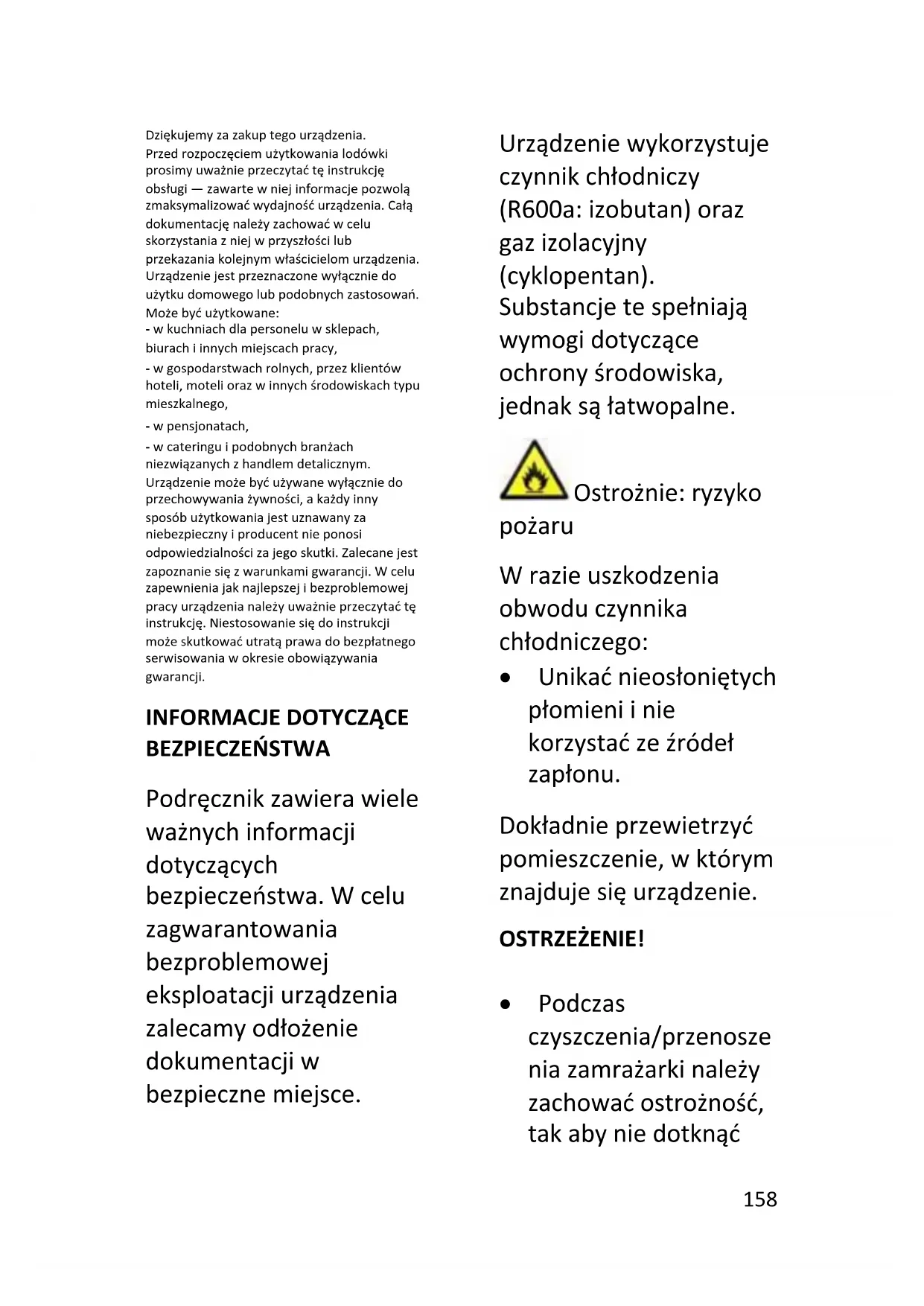 BEZPIECZEŃSTWA Podręcznik zawiera wiele ważnych informacji dotyczących bezpieczeństwa. W celu zagwarantowania bezproblemowej eksploatacji urządzenia zalecamy odłożenie dokumentacji w bezpieczne miejsce. Urządzenie wykorzystuje czynnik chłodniczy (R600a: izobutan) oraz gaz izolacyjny (cyklopentan). Substancje te spełniają wymogi dotyczące ochrony środowiska, jednak są łatwopalne. Ostrożnie: ryzyko pożaru W razie uszkodzenia obwodu czynnika chłodniczego: