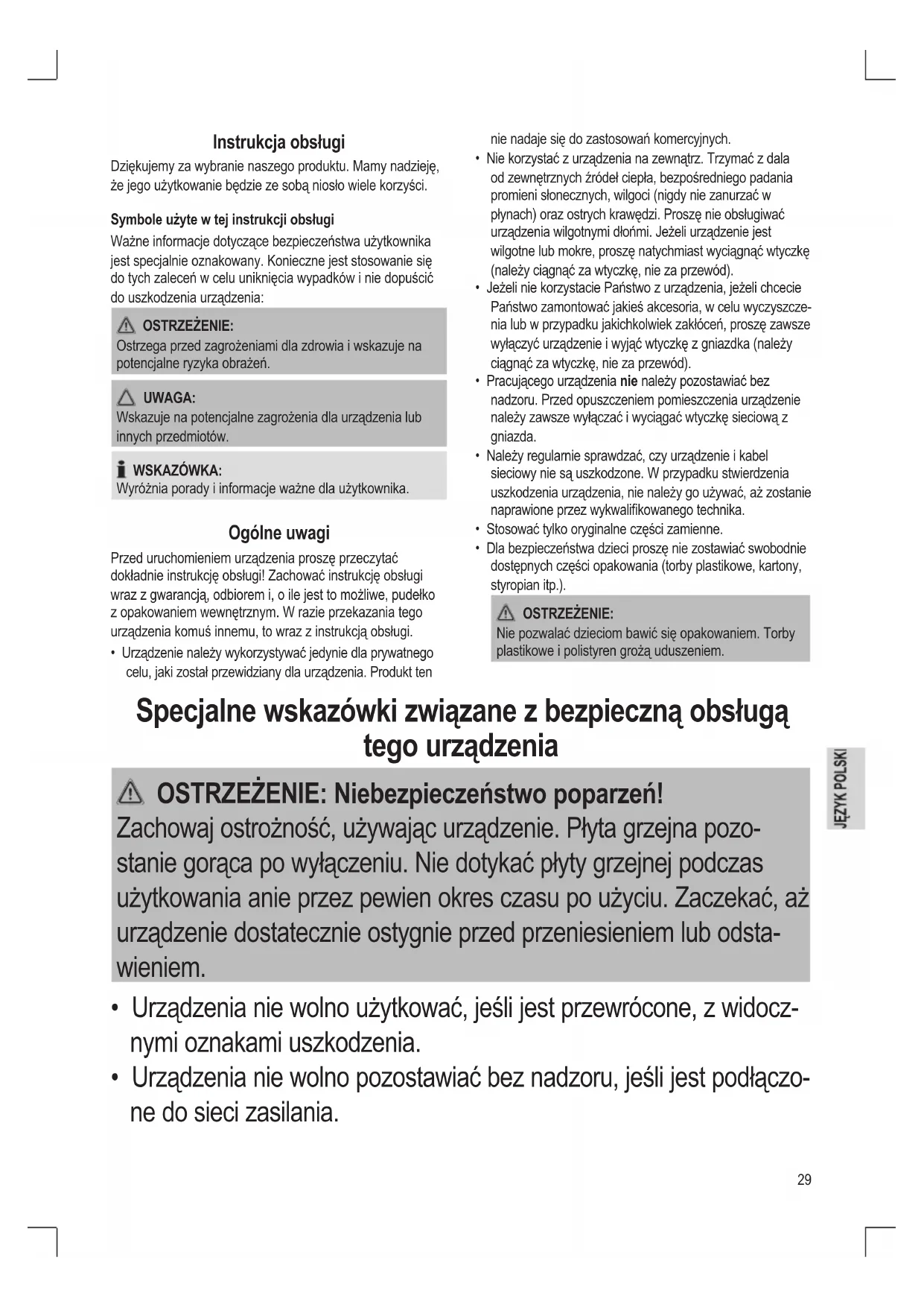 - Dla bezpieczeństwa dzieci proszę nie zostawiać swobodnie dostępnych części opakowania (torby plastikowe, kartony, styropian itp.). OSTRZEŻENIE: Nie pozwalać dzieciom bawić się opakowaniem. Torby plastikowe i polistyren grożą uduszeniem. Specjalne wskazówki związane z bezpieczną obsługą tego urządzenia OSTRZEŻENIE: Niebezpieczeństwo poparzeń! Zachowaj ostrożność, używając urządzenie. Płyta grzejna pozo- stanie gorąca po wyłączeniu. Nie dotykać płyty grzejnej podczas użytkowania anie przez pewien okres czasu po użyciu. Zaczekać, aż urządzenie dostatecznie ostygnie przed przeniesieniem lub odsta- wieniem.