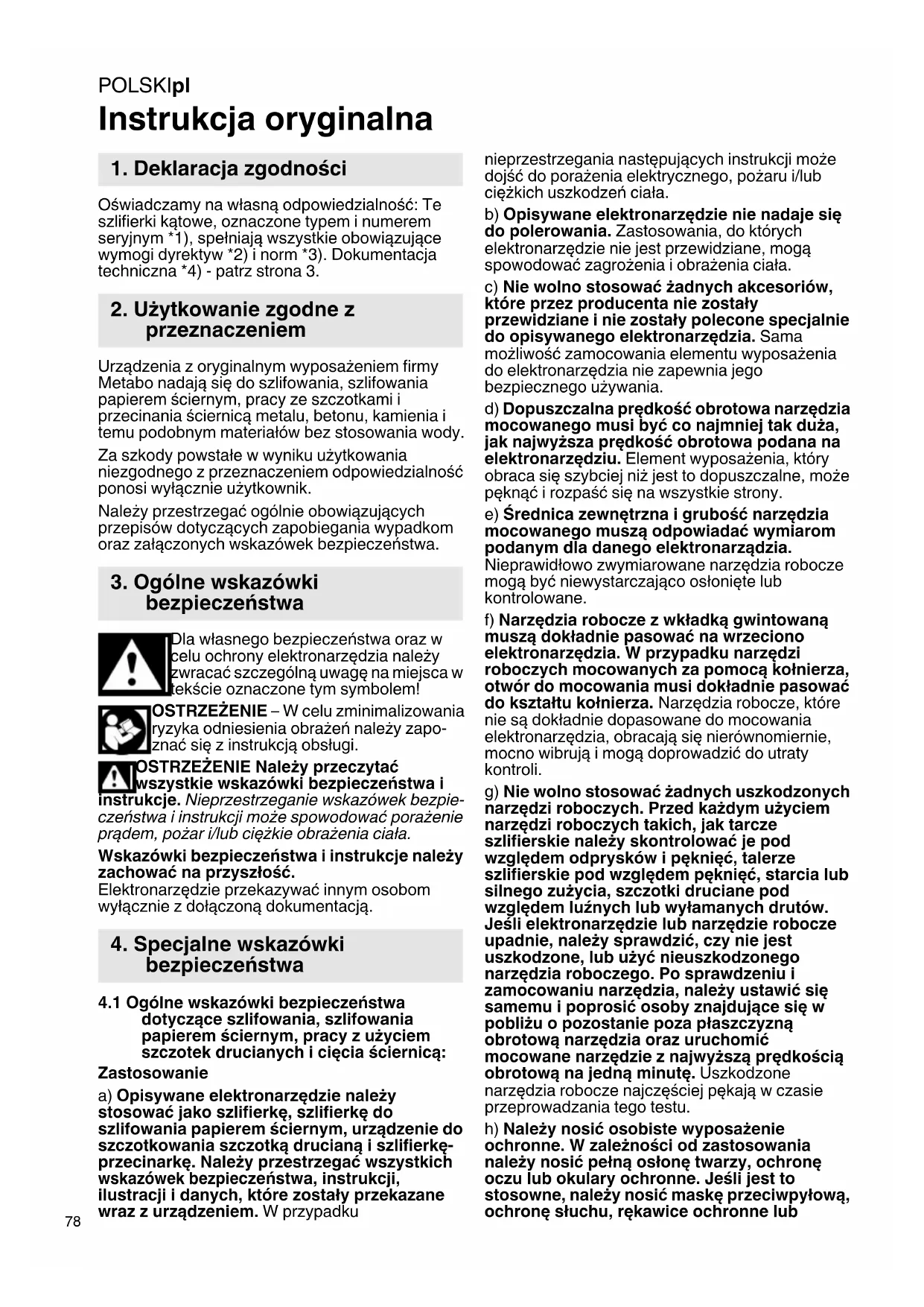 Instrukcja oryginalna Oświadczamy na własną odpowiedzialność: Te szlifierki kątowe, oznaczone typem i numerem seryjnym *1), spełniają wszystkie obowiązujące wymogi dyrektyw *2) i norm *3). Dokumentacja techniczna *4) - patrz strona 3. Urządzenia z oryginalnym wyposażeniem firmy Metabo nadają się do szlifowania, szlifowania papierem ściernym, pracy ze szczotkami i przecinania ściernicą metalu, betonu, kamienia i temu podobnym materiałów bez stosowania wody. Za szkody powstałe w wyniku użytkowania niezgodnego z przeznaczeniem odpowiedzialność ponosi wyłącznie użytkownik. Należy przestrzegać ogólnie obowiązujących przepisów dotyczących zapobiegania wypadkom oraz załączonych wskazówek bezpieczeństwa. Dla własnego bezpieczeństwa oraz w celu ochrony elektronarzędzia należy zwracać szczególną uwagę na miejsca w tekście oznaczone tym symbolem! OSTRZEŻENIE – W celu zminimalizowania ryzyka odniesienia obrażeń należy zapo- znać się z instrukcją obsługi. OSTRZEŻENIE Należy przeczytać wszystkie wskazówki bezpieczeństwa i instrukcje. Nieprzestrzeganie wskazówek bezpie- czeństwa i instrukcji może spowodować porażenie prądem, pożar i/lub ciężkie obrażenia ciała. Wskazówki bezpieczeństwa i instrukcje należy zachować na przyszłość. Elektronarzędzie przekazywać innym osobom wyłącznie z dołączoną dokumentacją.