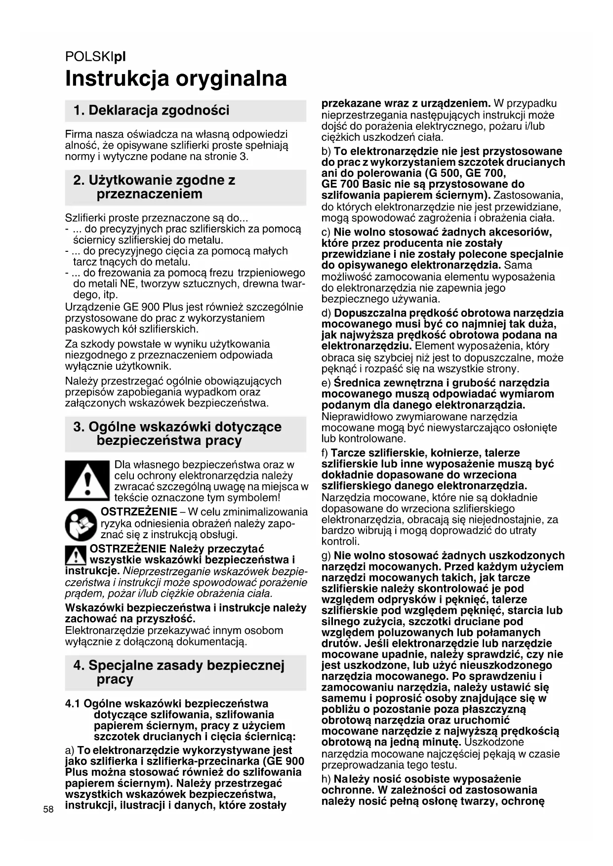 przeznaczeniem Szlifierki proste przeznaczone są do... - ... do precyzyjnych prac szlifierskich za pomocą ściernicy szlifierskiej do metalu. - ... do precyzyjnego cięci a za pomocą małych tarcz tnących do metalu. - ... do frezowania za pomocą frezu trzpieniowego do metali NE, tworzyw sztucznych, drewna twar- dego, itp. Urządzeni e GE 900 Plus jest również szczególnie przystosowane do prac z wykorzystaniem paskowych kół szl ifierskich. Za szkody powstałe w wy niku użytkowania niezgodnego z przeznaczeniem odpowiada wyłącznie użytkownik. Należy przestrzegać og ólnie obowiązujących przepisów zapobiegania wypadkom oraz załącz onych wskazówek bezpieczeństwa.