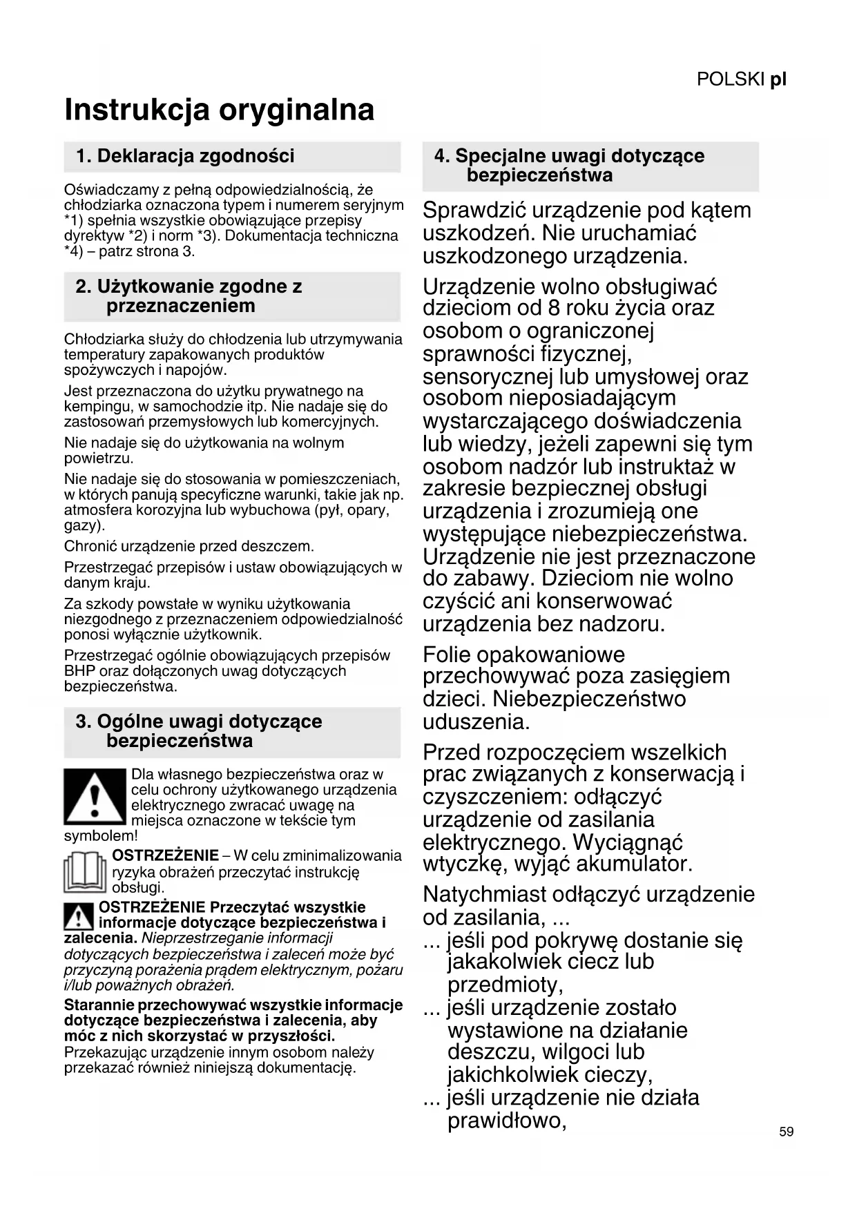 Instrukcja oryginalna Oświadczamy z pełną odpowiedzialnością, że chłodziarka oznaczona typem i numerem seryjnym *1) spełnia wszystkie obowiązujące przepisy dyrektyw *2) i norm *3). Dokumentacja techniczna *4) – patrz strona 3. Chłodziarka służy do chłodzenia lub utrzymywania temperatury zapakowanych produktów spożywczych i napojów. Jest przeznaczona do użytku prywatnego na kempingu, w samochodzie itp. Nie nadaje się do zastosowań przemysłowych lub komercyjnych. Nie nadaje się do użytkowania na wolnym powietrzu. Nie nadaje się do stosowania w pomieszczeniach, w których panują specyficzne warunki, takie jak np. atmosfera korozyjna lub wybuchowa (pył, opary, gazy). Chronić urządzenie przed deszczem. Przestrzegać przepisów i ustaw obowiązujących w danym kraju. Za szkody powstałe w wyniku użytkowania niezgodnego z przeznaczeniem odpowiedzialność ponosi wyłącznie użytkownik. Przestrzegać ogólnie obowiązujących przepisów BHP oraz dołą czonych uwag dotyczących bezpieczeństwa. Dla własnego bezpieczeństwa oraz w celu ochrony użytkowanego urządzenia elektrycznego zwracać uwagę na miejsca oznaczone w tekście tym symbolem! OSTRZEŻENIE – W celu zminimalizowania ryzyka obrażeń przeczytać instrukcję obsługi. OSTRZEŻENIE Przeczytać wszystkie informacje dotyczące bezpieczeństwa i zalecenia. Nieprzestrzeganie informacji dotyczących bezpieczeństwa i zaleceń może być przyczyną porażenia prądem elektrycznym, pożaru i/lub poważnych obrażeń. Starannie przechowywać wszystkie informacje dotyczące bezpieczeństwa i zalecenia, aby móc z nich skorzystać w przyszłości. Przekazując urządzenie innym osobom nale