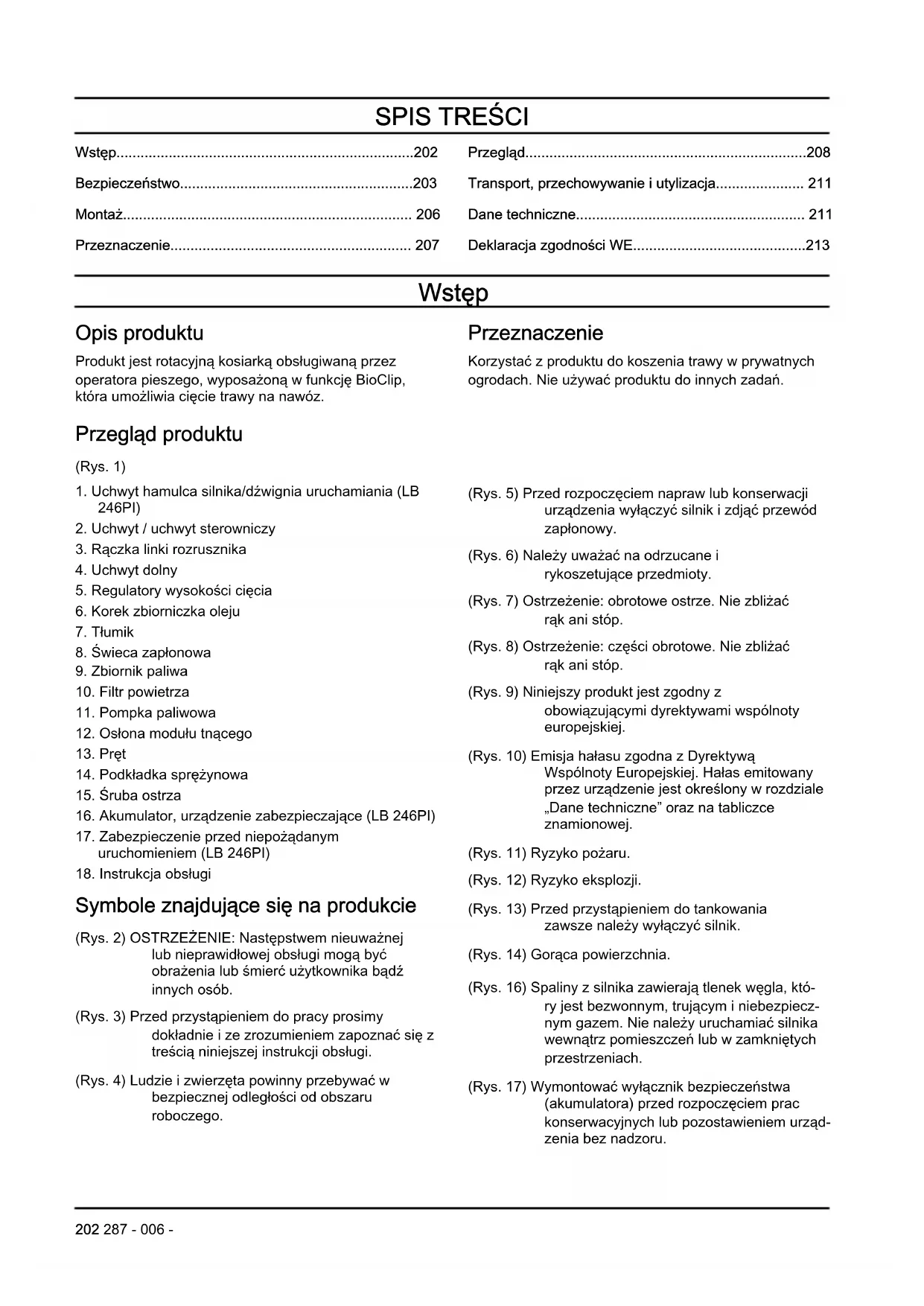 - Deklaracja zgodności WE Wstęp Opis produktu Produkt jest rotacyjną kosiarką obsługiwaną przez operatora pieszego, wyposażoną w funkcję BioClip, która umożliwia cięcie trawy na nawóz. Przeznaczenie Korzystać z produktu do koszenia trawy w prywatnych ogrodach. Nie używać produktu do innych zadań. Przegląd produktu (Rys. 1) p. 213