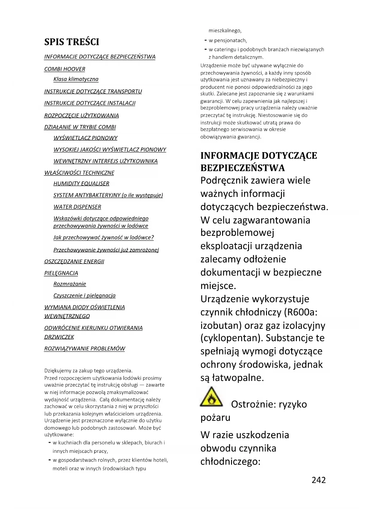 INFORMACJE DOTYCZĄCE BEZPIECZEŃSTWA COMBI HOOVER Klasa klimatyczna INSTRUKCJE DOTYCZĄCE TRANSPORTU INSTRUKCJE DOTYCZĄCE INSTALACJI ROZPOCZĘCIE UŻYTKOWANIA DZIAŁANIE W TRYBIE COMBI WYŚWIETLACZ PIONOWY WYSOKIEJ JAKOŚCI WYŚWIETLACZ PIONOWY WEWNĘTRZNY INTERFEJS UŻYTKOWNIKA WŁAŚCIWOŚCI TECHNICZNE HUMIDITY EQUALISER SYSTEM ANTYBAKTERYJNY (o ile występuje) WATER DISPENSER Wskazówki dotyczące odpowiedniego przechowywania żywności w lodówce Jak przechowywać żywność w lodówce? Przechowywanie żywności już zamrożonej OSZCZĘDZANIE ENERGII PIELĘGNACJA Rozmrażanie Czyszczenie i pielęgnacja WYMIANA DIODY OŚWIETLENIA WEWNĘTRZNEGO ODWRÓCENIE KIERUNKU OTWIERANIA DRZWICZEK ROZWIĄZYWANIE PROBLEMÓW Dziękujemy za zakup tego urządzenia. Przed rozpoczęciem użytkowania lodówki prosimy uważnie przeczytać tę instrukcję obsługi — zawarte w niej informacje pozwolą zmaksymalizować wydajność urządzenia. Całą dokumentację należy zachować w celu skorzystania z niej w przyszłości lub przekazania kolejnym właścicielom urządzenia. Urządzenie jest przeznaczone wyłącznie do użytku domowego lub podobnych zastosowań. Może być użytkowane: - w kuchniach dla personelu w sklepach, biurach i innych miejscach pracy, - w gospodarstwach rolnych, przez klientów hoteli, moteli oraz w innych środowiskach typu mieszkalnego, - w pensjonatach, - w cateringu i podobnych branżach niezwiązanych z handlem detalicznym. Urządzenie może być używane wyłącznie do przechowywania żywności, a każdy inny sposób użytkowania jest uznawany za niebezpieczny i producent nie ponosi odpowiedzialności za jego skutki. Zalecane jest zapoznanie się z warunkami gwarancji. W celu zapewnienia jak najlepszej i bezproblemowej pracy urządzenia należy uważnie przeczytać tę instrukcję. Niestosowanie się do instrukcji może skutkować utratą prawa do bezpłatnego serwisowania w okresie obowiązywania gwarancji.