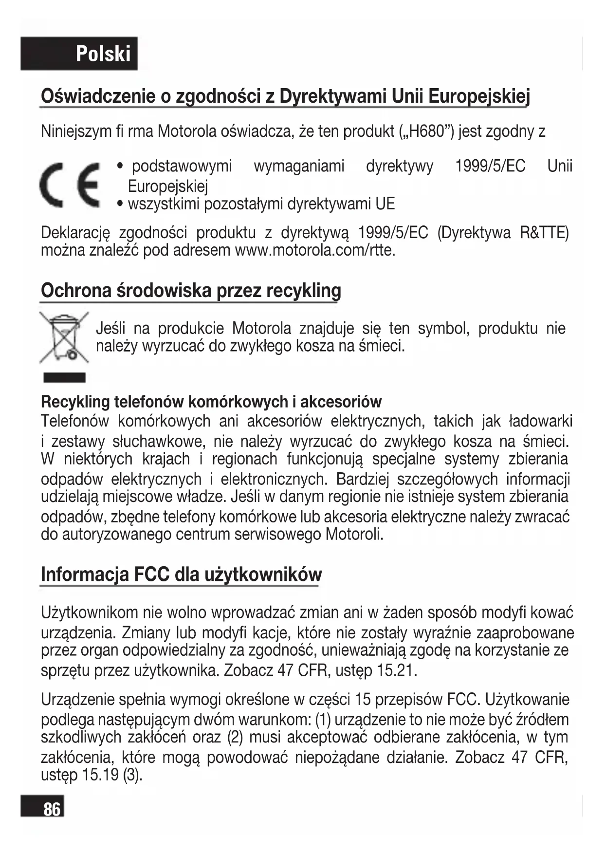 - wszystkimi pozostałymi dyrektywami UE Deklarację zgodności produktu z dyrektywą 1999/5/EC (Dyrektywa R&TTE) można znaleźć pod adresem www.motorola.com/rtte. Ochrona środowiska przez recykling Jeśli na produkcie Motorola znajduje się ten symbol, produktu nie należy wyrzucać do zwykłego kosza na śmieci. Recykling telefonów komórkowych i akcesoriów Telefonów komórkowych ani akcesoriów elektrycznych, takich jak ładowarki i zestawy słuchawkowe, nie należy wyrzucać do zwykłego kosza na śmieci. W niektórych krajach i regionach funkcjonują specjalne systemy zbierania odpadów elektrycznych i elektronicznych. Bardziej szczegółowych informacji udzielają miejscowe władze. Jeśli w danym regionie nie istnieje system zbierania odpadów, zbędne telefony komórkowe lub akcesoria elektryczne należy zwracać do autoryzowanego centrum serwisowego Motoroli. Informacja FCC dla użytkowników Użytkownikom nie wolno wprowadzać zmian ani w żaden sposób modyfi kować urządzenia. Zmiany lub modyfi kacje, które nie zostały wyraźnie zaaprobowane przez organ odpowiedzialny za zgodność, unieważniają zgodę na korzystanie ze sprzętu przez użytkownika. Zobacz 47 CFR, ustęp 15.21. Urządzenie spełnia wymogi określone w części 15 przepisów FCC. Użytkowanie podlega następującym dwóm warunkom: (1) urządzenie to nie może być źródłem szkodliwych zakłóceń oraz (2) musi akceptować odbierane zakłócenia, w tym zakłócenia, które mogą powodować niepożądane działanie. Zobacz 47 CFR, ustęp 15.19 (3). Polski87 Zanim zaczniesz Patrz ilustracja 1 na stronie 1. Zanim zaczniesz, zapoznaj się z nowym zestawem słuchawkowym Bluetooth H680. Oprócz zestawu opakowanie zawiera bazę ładującą, służącą do ładowania i przechowywania zestawu. Zestaw słuchawkowy Bluetooth