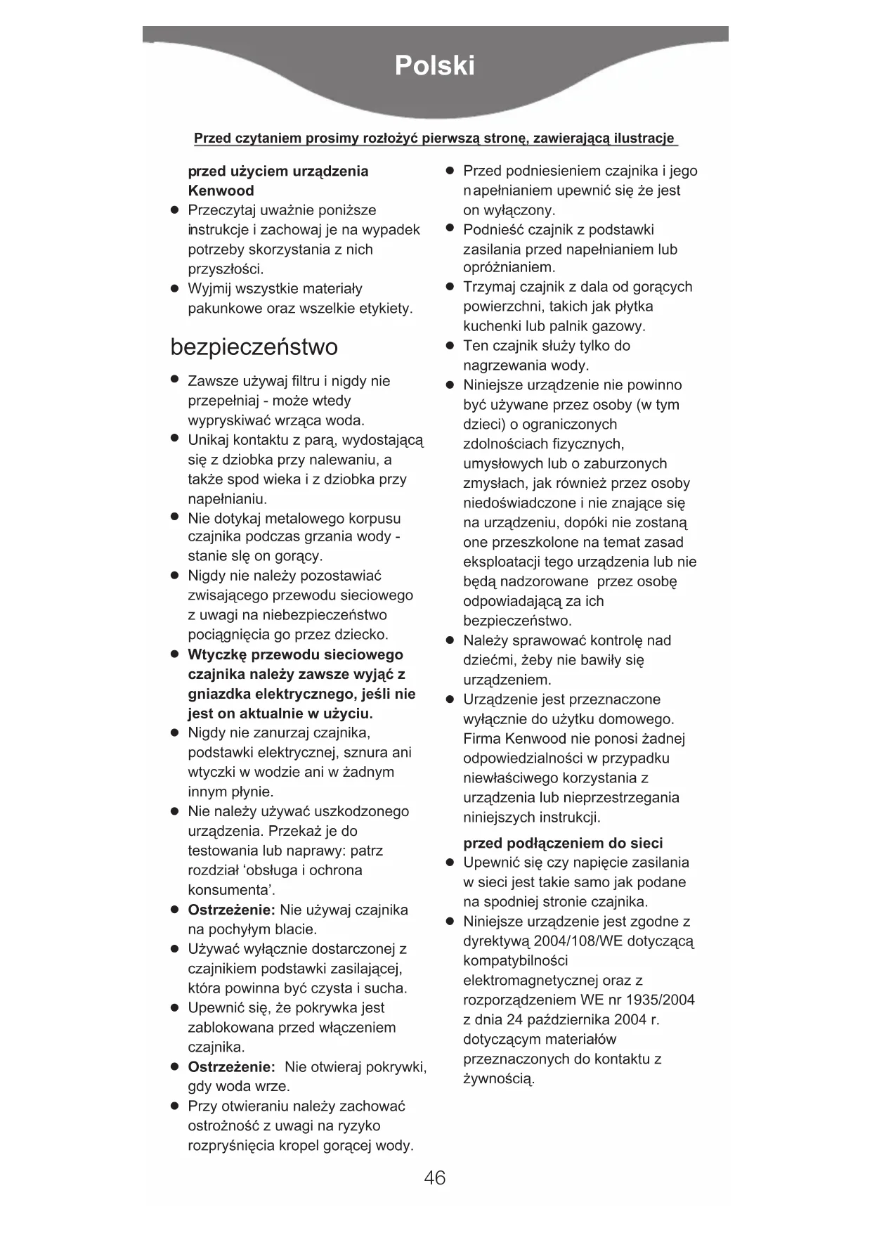 Urządzenie jest przeznaczone wyłącznie do użytku domowego. Firma Kenwood nie ponosi żadnej odpowiedzialności w przypadku niewłaściwego korzystania z urządzenia lub nieprzestrzegania niniejszych instrukcji. przed podłączeniem do sieci