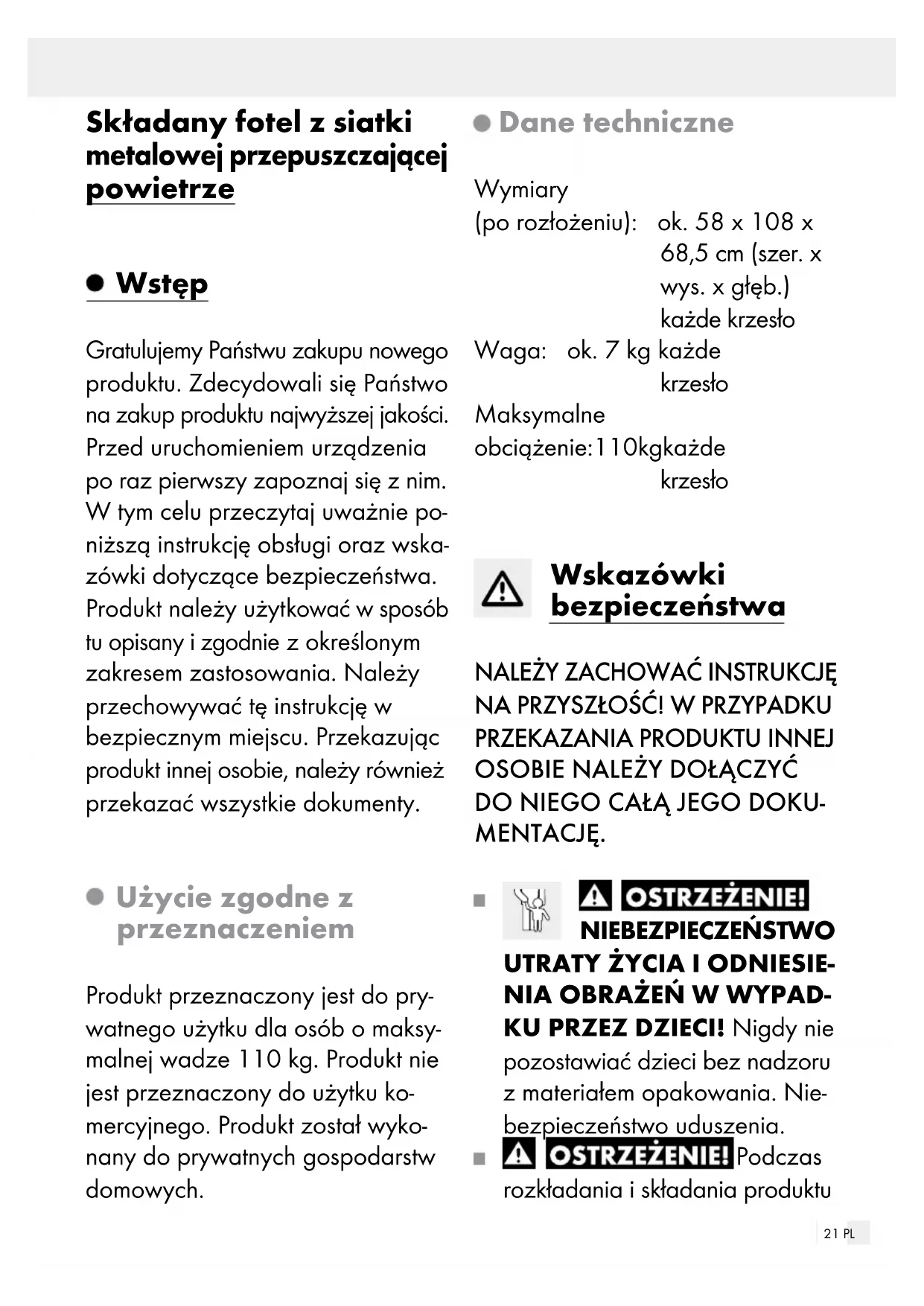 KU PRZEZ DZIECI! Nigdy nie pozostawiać dzieci bez nadzoru z materiałem opakowania. Nie- bezpieczeństwo uduszenia. Podczas rozkładania i składania produktu22 PL należy ostrożnie postępować, aby uniknąć urazów/przytrza- śnięcia. Produkt należy sprawdzić przed każdym użyciem pod kątem usz- kodzenia lub zużycia. Produktu należy używać tylko jeśli jest w nienagannym stanie. Nie używać produktu w razie stwierdzenia widocznych uszkodzeń lub przy- puszczenia, że takie mogą być. Przed użyciem należy sprawdzić właściwą stabilność produktu. Produkt przed użyciem należy ustawić na równym, twardym podłożu, w przeciwnym razie mógłby on utracić stabilność, przechylić się na bok lub przewrócić. Może to prowadzić do poważnych obrażeń ciała lub szkód rzeczowych. 11 0 kg Należy przestrzegać maksymalnego obcią- żenia 110 kg. Jeśli zostanie przekroczona ta granica wagi, może to prowadzić do poważ- nych obrażeń ciała i / lub szkód rzeczowych. Zwrócić uwagę na to, aby ręce nie dostały się do mechanizmu składania, aby uniknąć obrażeń. Przy rozkładaniu należy uważać na to, aby mechanizm składania odpowiednio zaskoczył, zanim użyje się produktu. Przed użyciem należy się upewnić, że produkt jest całkowicie rozłożony. Produkt nie jest zabawką i powi- nien być używany przez dzieci wyłącznie pod nadzorem osób dorosłych. Produktu może używać tylko jedna osoba naraz. Nigdy nie siadać na oparciu krzesła, podłokietnikach lub podnóżku (jeśli jest). Proszę nie stawać na produkcie. W przypadku ekstremalnych warunków pogodowych, np. przy mocnym wietrze, należy zabezpieczyć produkt. Nie używać produktu w pobliżu otwartego ognia. NIEBEZPIECZEŃSTWO
