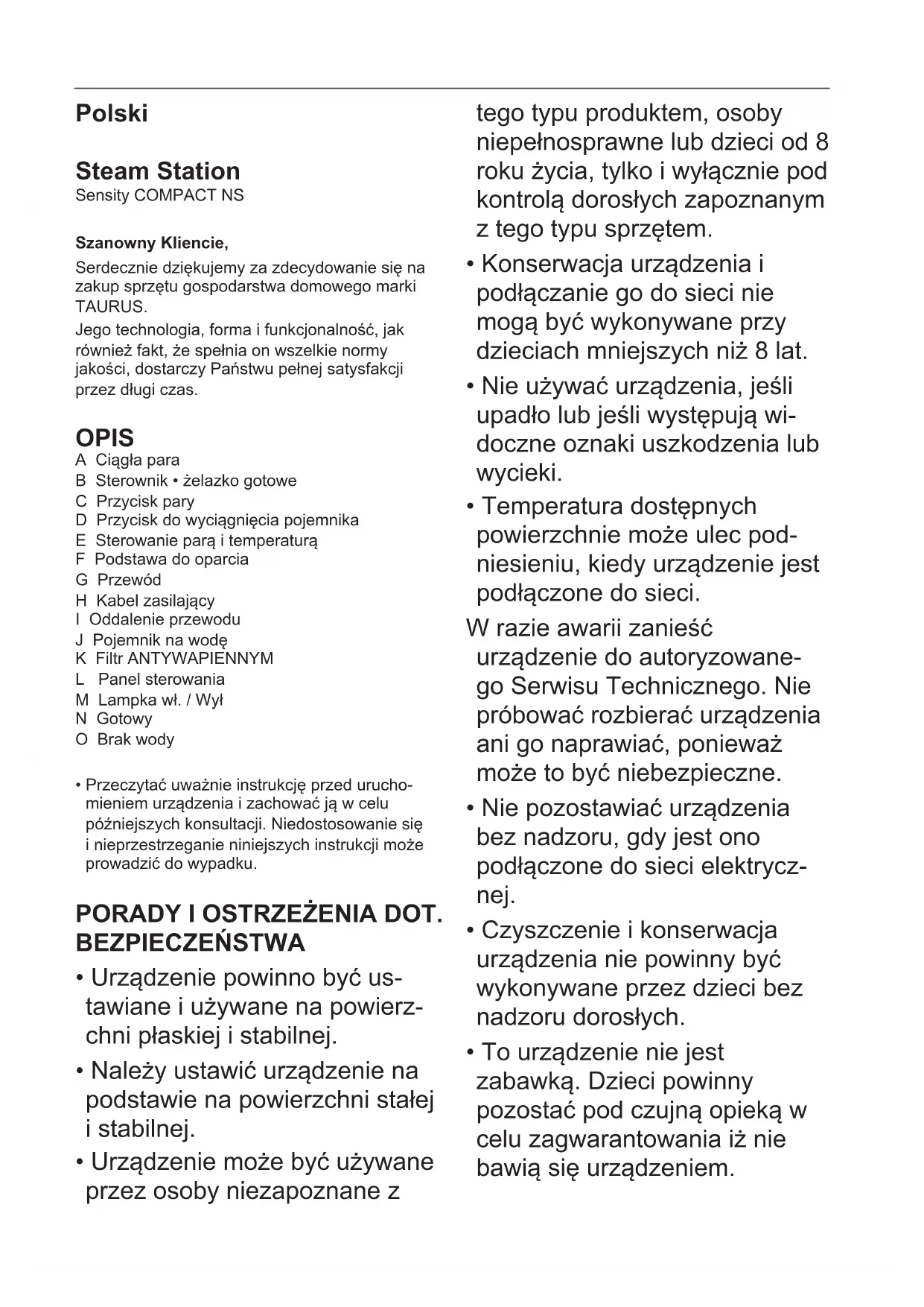 Sensity Compact Non Stop - żelazko TAURUS - Bezpłatna instrukcja obsługi