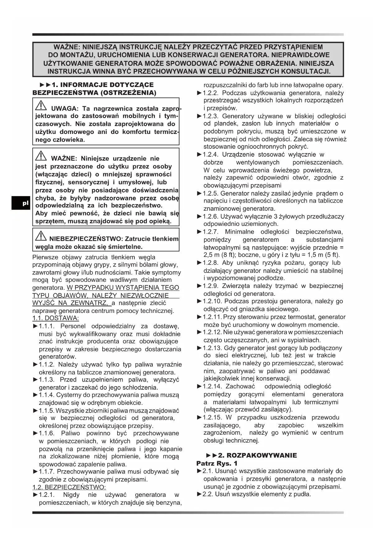 BEZPIECZEŃSTWA (OSTRZEŻENIA) UWAGA: Ta nagrzewnica została zapro- jektowana do zastosowań mobilnych i tym- czasowych. Nie została zaprojektowana do użytku domowego ani do komfortu termicz- nego człowieka. WAŻNE: Niniejsze urządzenie nie jest przeznaczone do użytku przez osoby (włączając dzieci) o mniejszej sprawności zycznej, sensorycznej i umysłowej, lub przez osoby nie posiadające doświadczenia chyba, że byłyby nadzorowane przez osobę odpowiedzialną za ich bezpieczeństwo. Aby mieć pewność, że dzieci nie bawią się sprzętem, muszą znajdować się pod opieką. NIEBEZPIECZEŃSTWO: Zatrucie tlenkiem węgla może okazać się śmiertelne. Pierwsze objawy zatrucia tlenkiem węgla przypominają objawy grypy, z silnymi bólami głowy, zawrotami głowy i/lub nudnościami. Takie symptomy mogą być spowodowane wadliwym działaniem generatora. W PRZYPADKU WYSTĄPIENIA TEGO TYPU OBJAWÓW, NALEŻY NIEZWŁOCZNIE WYJŚĆ NA ZEWNĄTRZ, a następnie zlecić naprawę generatora centrum pomocy technicznej. 1.1. DOSTAWA: ►1.1.1. Personel odpowiedzialny za dostawę, musi być wykwalikowany oraz musi dokładnie znać instrukcje producenta oraz obowiązujące przepisy w zakresie bezpiecznego dostarczania generatorów. ►1.1.2. Należy używać tylko typ paliwa wyraźnie określony na tabliczce znamionowej generatora. ►1.1.3. Przed uzupełnieniem paliwa, wyłączyć generator i zaczekać do jego schłodzenia. ►1.1.4. Cysterny do przechowywania paliwa muszą znajdować się w odrębnym obiekcie. ►1.1.5. Wszystkie zbiorniki paliwa muszą znajdować się w bezpiecznej odległości od generatora, określonej przez obowiązujące przepisy. ►1.1.6. Paliwo powinno być przechowywane w pomieszczeniach, w których podłogi nie pozwolą na przeniknięcie paliwa i jego kapanie na zlokalizowane niżej płomienie, które mogą spowodować zapalenie paliwa. ►1.1.7. Przechowywanie paliwa musi odbywać się zgodnie z obowiązującymi przepisami. 1.2. BEZPIECZEŃSTWO: ►1.2.1. Nigdy nie używać generatora w pomieszczeniach, w których znajduje się benzyna, rozpuszczalniki do farb lub inne łatwopalne opary. ►1.2.2. Podczas użytkowania generatora, należy przestrzegać wszystkich lokalnych rozporządzeń i przepisów. ►1.2.3. Generatory używane w bliskiej odległości od plandek, zasłon lub innych materiałów o podobnym pokryciu, muszą być umieszczone w bezpiecznej od nich odległości. Zaleca się również stosowanie ognioochronnych pokryć. ►1.2.4. Urządzenie stosować wyłącznie w dobrze wentylowanych pomieszczeniach. W celu wprowadzenia świeżego powietrza, należy zapewnić odpowiedni otwór, zgodnie z obowiązującymi przepisami ►1.2.5. Generator należy zasilać jedynie prądem o napięciu i częstotliwości określonych na tabliczce znamionowej generatora. ►1.2.6. Używać wyłącznie 3 żyłowych przedłużaczy odpowiednio uziemionych. ►1.2.7. Minimalne odległości bezpieczeństwa, pomiędzy generatorem a substancjami łatwopalnymi są następujące: wyjście przednie = 2,5 m (8 ft); boczne, u góry i z tyłu = 1,5 m (5 ft). ►1.2.8. Aby uniknąć ryzyka pożaru, gorący lub działający generator należy umieścić na stabilnej i wypoziomowanej podłodze. ►1.2.9. Zwierzęta należy trzymać w bezpiecznej odległości od generatora. ►1.2.10. Podczas przestoju generatora, należy go odłączyć od gniazdka sieciowego. ►1.2.11. Przy sterowaniu przez termostat, generator może być uruchomiony w dowolnym momencie. ►1.2.12. Nie używać generatora w pomieszczeniach często uczęszczanych, ani w sypialniach. ►1.2.13. Gdy generator jest gorący lub podłączony do sieci elektrycznej, lub też jest w trakcie działania, nie należy go przemieszczać, sterować nim, zaopatrywać w paliwo ani poddawać jakiejkolwiek innej konserwacji. ►1.2.14. Zachować odpowiednią odległość pomiędzy gorącymi elementami generatora a materiałami łatwopalnymi lub termicznymi (włączając przewód zasilający). ►1.2.15. W przypadku uszkodzenia przewodu zasilającego, aby zapobiec wszelkim zagrożeniom, należy go wymienić w centrum obsługi technicznej. ►►2. ROZPAKOWYWANIE Patrz Rys. 1 ►2.1. Usunąć wszystkie zastosowane materiały do opakowania i przesyłki generatora, a następnie usunąć je zgodnie z obowiązującymi przepisami. ►2.2. Usuń wszystkie elementy z pudła.