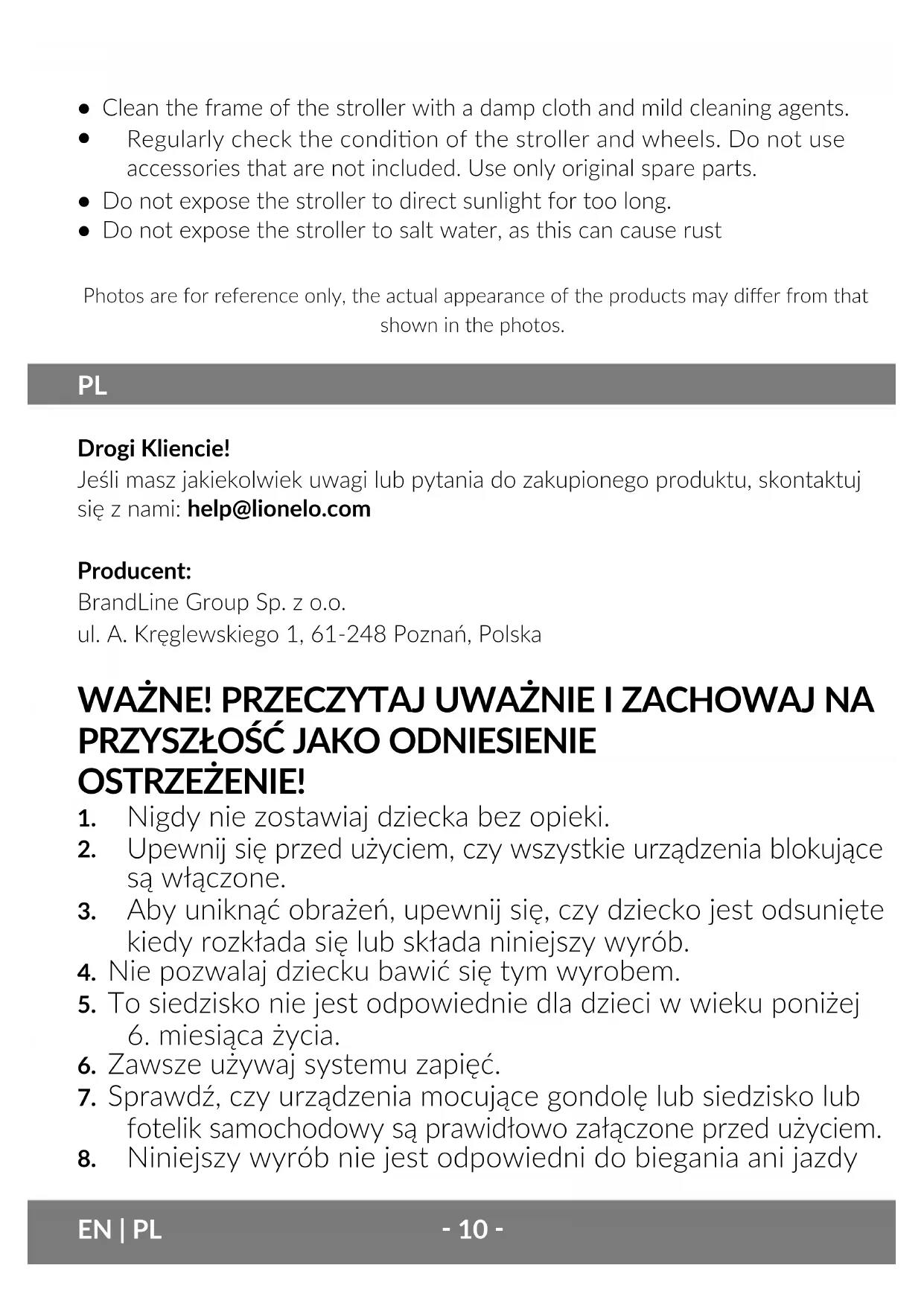 Drogi Kliencie! Jeśli masz jakiekolwiek uwagi lub pytania do zakupionego produktu, skontaktuj się z nami: help@lionelo.com Producent: BrandLine Group Sp. z o.o. ul. A. Kręglewskiego 1, 61-248 Poznań, Polska WAŻNE! PRZECZYTAJ UWAŻNIE I ZACHOWAJ NA