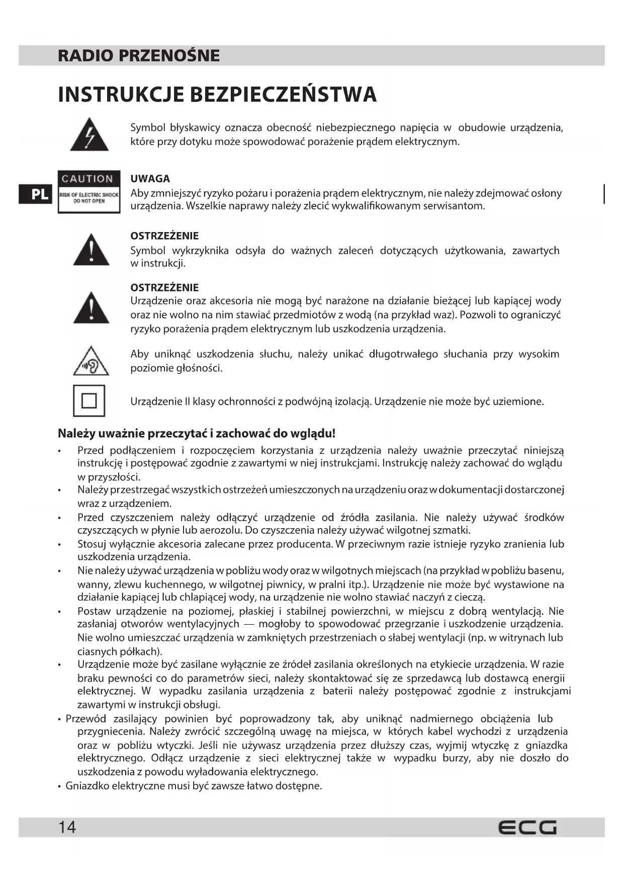 Symbol błyskawicy oznacza obecność niebezpiecznego napięcia w obudowie urządzenia, które przy dotyku może spowodować porażenie prądem elektrycznym. UWAGA Aby zmniejszyć ryzyko pożaru iporażenia prądem elektrycznym, nie należy zdejmować osłony urządzenia. Wszelkie naprawy należy zlecić wykwalikowanym serwisantom. OSTRZEŻENIE Symbol wykrzyknika odsyła do ważnych zaleceń dotyczących użytkowania, zawartych winstrukcji. OSTRZEŻENIE Urządzenie oraz akcesoria nie mogą być narażone na działanie bieżącej lub kapiącej wody oraz nie wolno na nim stawiać przedmiotów zwodą (na przykład waz). Pozwoli to ograniczyć ryzyko porażenia prądem elektrycznym lub uszkodzenia urządzenia. Aby uniknąć uszkodzenia słuchu, należy unikać długotrwałego słuchania przy wysokim poziomie głośności. Urządzenie II klasy ochronności zpodwójną izolacją. Urządzenie nie może być uziemione. Należy uważnie przeczytać izachować do wglądu!