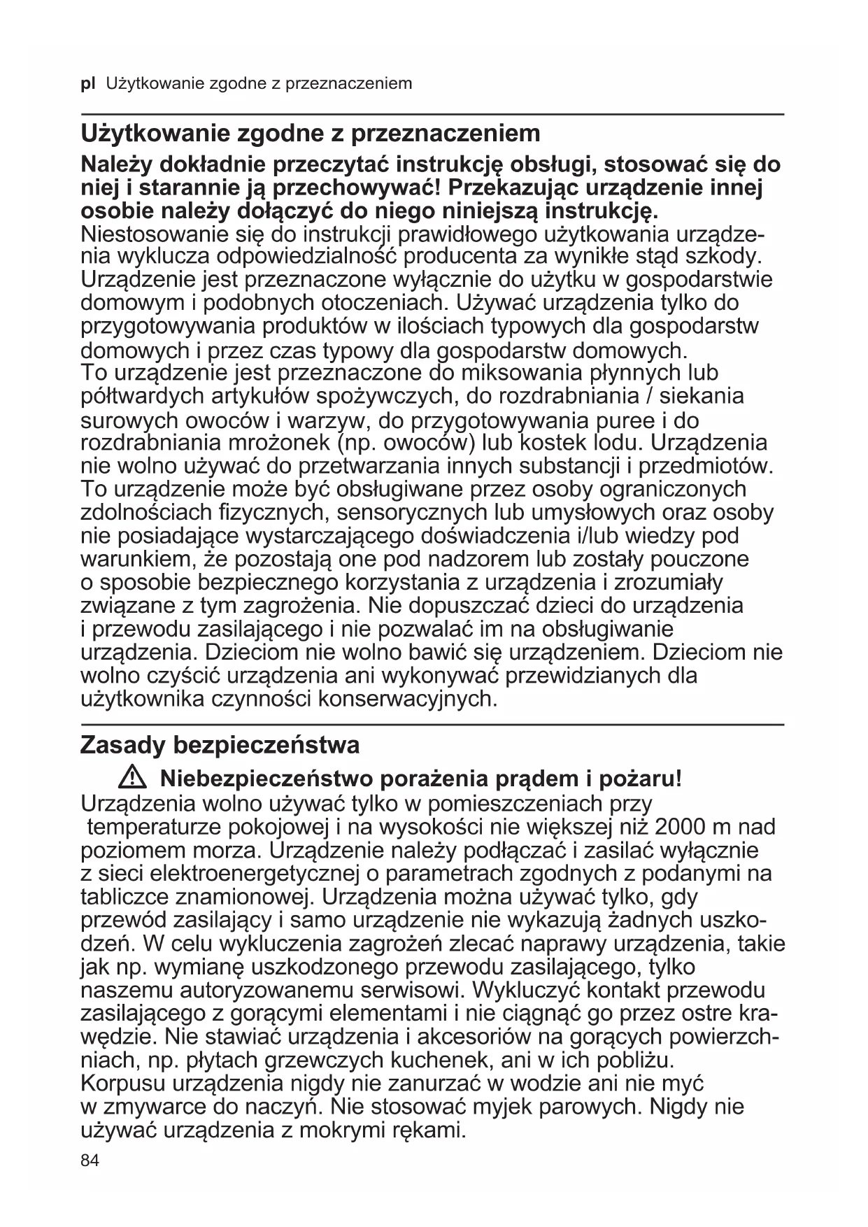 Cihazınızı kullanmayacaksanız, düğmesinden kapatıp kaldırınız. Değişiklik hakları mahfuzdur.84 pl Użytkowanie zgodne z przeznaczeniem Użytkowanie zgodne z przeznaczeniem Należy dokładnie przeczytać instrukcję obsługi, stosować się do niej i starannie ją przechowywać! Przekazując urządzenie innej osobie należy dołączyć do niego niniejszą instrukcję. Niestosowanie się do instrukcji prawidłowego użytkowania urządze- nia wyklucza odpowiedzialność producenta za wynikłe stąd szkody. Urządzenie jest przeznaczone wyłącznie do użytku w gospodarstwie domowym i podobnych otoczeniach. Używać urządzenia tylko do przygotowywania produktów w ilościach typowych dla gospodarstw domowych i przez czas typowy dla gospodarstw domowych. To urządzenie jest przeznaczone do miksowania płynnych lub półtwardych artykułów spożywczych, do rozdrabniania / siekania surowych owoców i warzyw, do przygotowywania puree i do rozdrabniania mrożonek (np. owoców) lub kostek lodu. Urządzenia nie wolno używać do przetwarzania innych substancji i przedmiotów. To urządzenie może być obsługiwane przez osoby ograniczonych zdolnościach fizycznych, sensorycznych lub umysłowych oraz osoby nie posiadające wystarczającego doświadczenia i/lub wiedzy pod warunkiem, że pozostają one pod nadzorem lub zostały pouczone o sposobie bezpiecznego korzystania z urządzenia i zrozumiały związane z tym zagrożenia. Nie dopuszczać dzieci do urządzenia i przewodu zasilającego i nie pozwalać im na obsługiwanie urządzenia. Dzieciom nie wolno bawić się urządzeniem. Dzieciom nie wolno czyścić urządzenia ani wykonywać przewidzianych dla użytkownika czynności konserwacyjnych. Zasady bezpieczeństwa W Niebezpieczeństwo porażenia prądem i pożaru! Urządzenia wolno używać tylko w pomieszczeniach przy temperaturze pokojowej i na wysokości nie większej niż 2000 m nad poziomem morza. Urządzenie należy podłączać i zasilać wyłącznie z sieci elektroenergetycznej o parametrach zgodnych z podanymi na tabliczce znamionowej. Urządzenia można używać tylko, gdy przewód zasilający i samo urządzenie nie wykazują żadnych uszko- dzeń. W celu wykluczenia zagrożeń zlecać naprawy urządzenia, takie jak np. wymianę uszkodzonego przewodu zasilającego, tylko naszemu autoryzowanemu serwisowi. Wykluczyć kontakt przewodu zasilającego z gorącymi elementami i nie ciągnąć go przez ostre kra- wędzie. Nie stawiać urządzenia i akcesoriów na gorących powierzch- niach, np. płytach grzewczych kuchenek, ani w ich pobliżu. Korpusu urządzenia nigdy nie zanurzać w wodzie ani nie myć w zmywarce do naczyń. Nie stosować myjek parowych. Nigdy nie używać urządzenia z mokrymi rękami.85