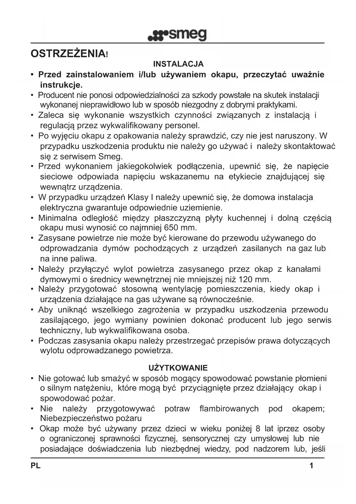 - Po wyjęciu okapu z opakowania należy sprawdzić, czy nie jest naruszony. W przypadku uszkodzenia produktu nie należy go używać i należy skontaktować się z serwisem Smeg.