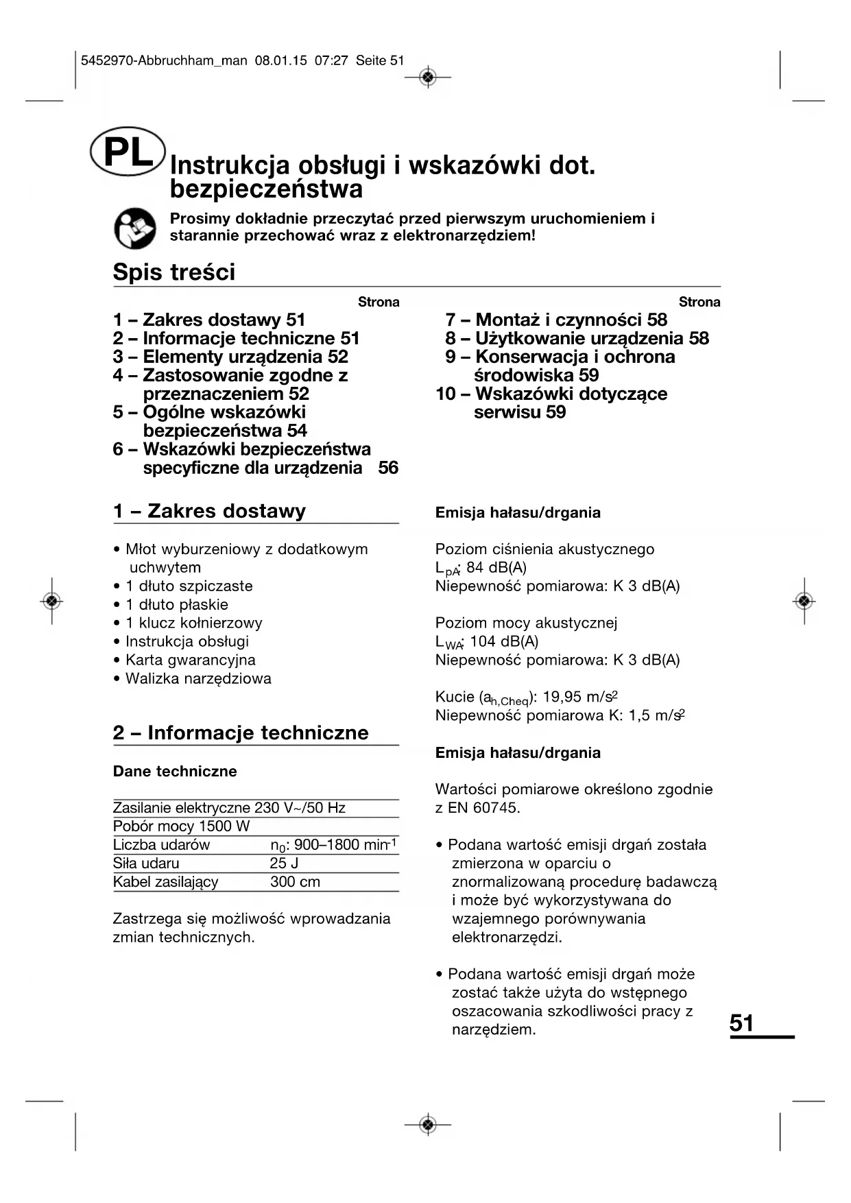 Po dłuszym okresie nieduzytkowania naręźdia lub w przypadku wączania narȩźdia w temperaturach ujemnych naleźny na kilka minut wączyć młot na biegu jałowym, tak aby srodek smarny Rozprowadzi są wewnatrz narȩźdia.