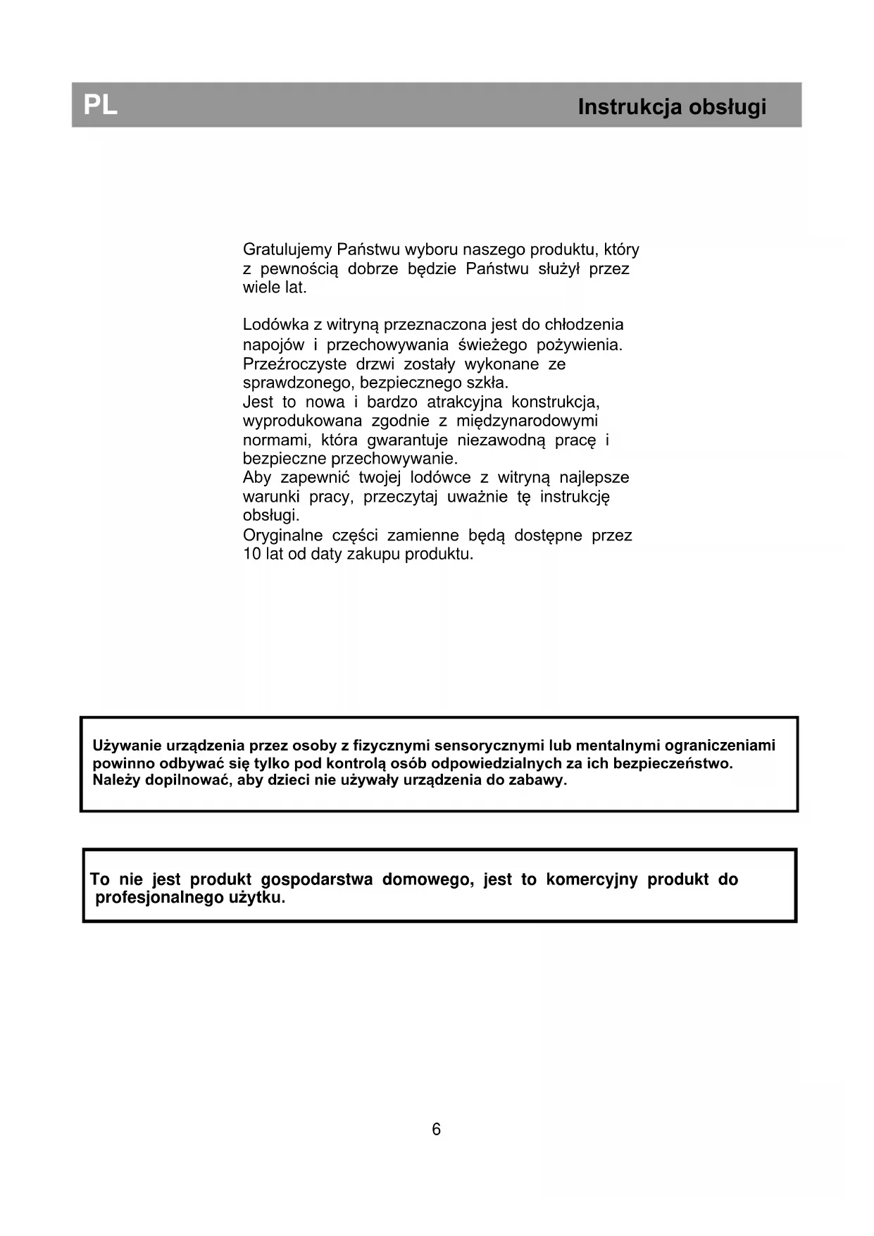 The symbol on the product or on packaging indicates that this product may not be treated as household waste. Instead it shall be handed over to the applicable collection point for the recycling of electrical and electronic equipment. By ensuring this product is disposed of correctly, you will help prevent potential negatyve consequences for the environment and humann health, which could otherwise be otherwise be caused by inappropriate waste handling of this product. For more detailed information about recycling of this product, please contact your local city office, you household waste disposal service or the shop where you purchased the product.Gratulujemy Państwu wyboru naszego produktu, który z pewnością dobrze będzie Państwu służył przez wiele lat. Lodówka z witryną przeznaczona jest do chłodzenia napojów i przechowywania świeżego pożywienia. Przeźroczyste drzwi zostały wykonane ze sprawdzonego, bezpiecznego szkła. Jest to nowa i bardzo atrakcyjna konstrukcja, wyprodukowana zgodnie z międzynarodowymi normami, która gwarantuje niezawodną pracę i bezpieczne przechowywanie. Aby zapewnić twojej lodówce z witryną najlepsze warunki pracy, przeczytaj uważnie tę instrukcję obsługi. Oryginalne części zamienne będą dostępne przez 10 lat od daty zakupu produktu.