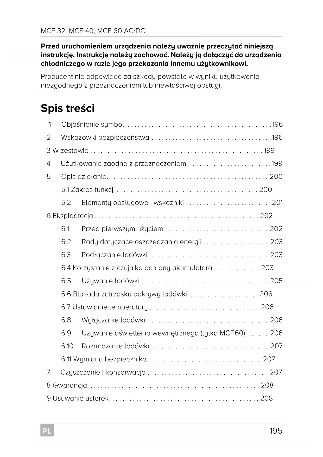 - Przed uruchomieniem urządzenia należy uważnie przeczytać niniejszą instrukcję. Instrukcję należy zachować. Należy ją dołączyć do urządzenia chłodniczego w razie jego przekazania innemu użytkownikowi. Producent nie odpowiada za szkody powstałe w wyniku użytkowania niezgodnego z przeznaczeniem lub niewłaściwej obsługi. Spis treści 1Objaśnienie symboli p. 196