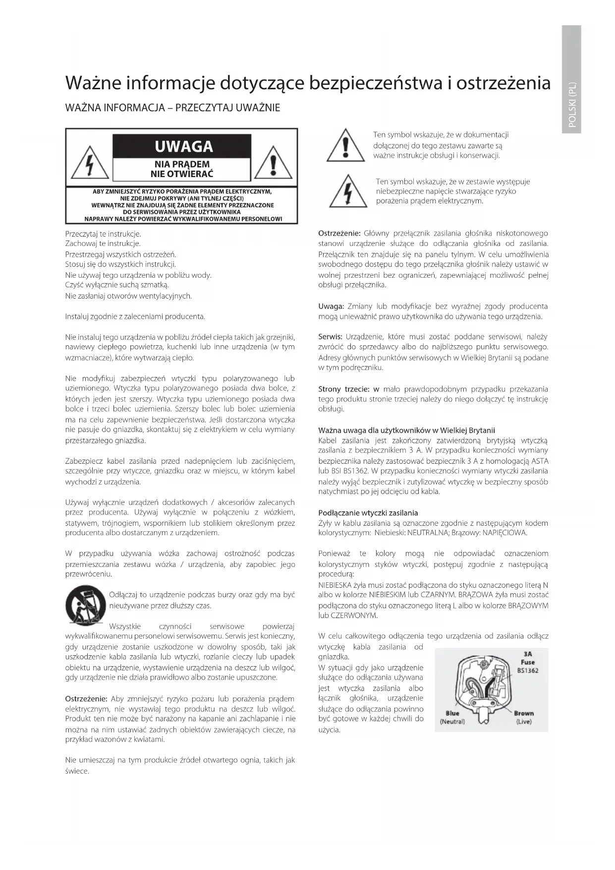 NIE OTWIERAĆ UWAGA ABY ZMNIEJSZYĆ RYZYKO PORAŻENIA PRĄDEM ELEKTRYCZNYM, NIE ZDEJMUJ POKRYWY (ANI TYLNEJ CZĘŚCI)WEWNĄTRZ NIE ZNAJDUJĄ SIĘ ŻADNE ELEMENTY PRZEZNACZONE DO SERWISOWANIA PRZEZ UŻYTKOWNIKANAPRAWY NALEŻY POWIERZAĆ WYKWALIFIKOWANEMU PERSONELOWI Przeczytaj te instrukcje. Zachowaj te instrukcje. Przestrzegaj wszystkich ostrzeżeń. Stosuj się do wszystkich instrukcji. Nie używaj tego urządzenia w pobliżu wody. Czyść wyłącznie suchą szmatką. Nie zasłaniaj otworów wentylacyjnych. Instaluj zgodnie z zaleceniami producenta. Nie instaluj tego urządzenia w pobliżu źródeł ciepła takich jak grzejniki, nawiewy ciepłego powietrza, kuchenki lub inne urządzenia (w tym wzmacniacze), które wytwarzają ciepło. Nie modykuj zabezpieczeń wtyczki typu polaryzowanego lub uziemionego. Wtyczka typu polaryzowanego posiada dwa bolce, z których jeden jest szerszy. Wtyczka typu uziemionego posiada dwa bolce i trzeci bolec uziemienia. Szerszy bolec lub bolec uziemienia ma na celu zapewnienie bezpieczeństwa. Jeśli dostarczona wtyczka nie pasuje do gniazdka, skontaktuj się z elektrykiem w celu wymiany przestarzałego gniazdka. Zabezpiecz kabel zasilania przed nadepnięciem lub zaciśnięciem, szczególnie przy wtyczce, gniazdku oraz w miejscu, w którym kabel wychodzi z urządzenia. Używaj wyłącznie urządzeń dodatkowych / akcesoriów zalecanych przez producenta. Używaj wyłącznie w połączeniu z wózkiem, statywem, trójnogiem, wspornikiem lub stolikiem określonym przez producenta albo dostarczanym z urządzeniem. W przypadku używania wózka zachowaj ostrożność podczas przemieszczania zestawu wózka / urządzenia, aby zapobiec jego przewróceniu. Odłączaj to urządzenie podczas burzy oraz gdy ma być nieużywane przez dłuższy czas. Wszystkie czynności serwisowe powierzaj wykwalikowanemu personelowi serwisowemu. Serwis jest konieczny, gdy urządzenie zostanie uszkodzone w dowolny sposób, taki jak uszkodzenie kabla zasilania lub wtyczki, rozlanie cieczy lub upadek obiektu na urządzenie, wystawienie urządzenia na deszcz lub wilgoć, gdy urządzenie nie działa prawidłowo albo zostanie upuszczone. Ostrzeżenie: Aby zmniejszyć ryzyko pożaru lub porażenia prądem elektrycznym, nie wystawiaj tego produktu na deszcz lub wilgoć. Produkt ten nie może być narażony na kapanie ani zachlapanie i nie można na nim ustawiać żadnych obiektów zawierających ciecze, na przykład wazonów z kwiatami. Nie umieszczaj na tym produkcie źródeł otwartego ognia, takich jak świece. Ostrzeżenie: Główny przełącznik zasilania głośnika niskotonowego stanowi urządzenie służące do odłączania głośnika od zasilania. Przełącznik ten znajduje się na panelu tylnym. W celu umożliwienia swobodnego dostępu do tego przełącznika głośnik należy ustawić w wolnej przestrzeni bez ograniczeń, zapewniającej możliwość pełnej obsługi przełącznika. Uwaga: Zmiany lub modykacje bez wyraźnej zgody producenta mogą unieważnić prawo użytkownika do używania tego urządzenia. Serwis: Urządzenie, które musi zostać poddane serwisowi, należy zwrócić do sprzedawcy albo do najbliższego punktu serwisowego. Adresy głównych punktów serwisowych w Wielkiej Brytanii są podane w tym podręczniku. Strony trzecie: w mało prawdopodobnym przypadku przekazania tego produktu stronie trzeciej należy do niego dołączyć tę instrukcję obsługi. Ważna uwaga dla użytkowników w Wielkiej Brytanii Kabel zasilania jest zakończony zatwierdzoną brytyjską wtyczką zasilania z bezpiecznikiem 3 A. W przypadku konieczności wymiany bezpiecznika należy zastosować bezpiecznik 3 A z homologacją ASTA lub BSI BS1362. W przypadku konieczności wymiany wtyczki zasilania należy wyjąć bezpiecznik i zutylizować wtyczkę w bezpieczny sposób natychmiast po jej odcięciu od kabla. Podłączanie wtyczki zasilania Żyły w kablu zasilania są oznaczone zgodnie z następującym kodem kolorystycznym: Niebieski: NEUTRALNA; Brązowy: NAPIĘCIOWA. Ponieważ te kolory mogą nie odpowiadać oznaczeniom kolorystycznym styków wtyczki, postępuj zgodnie z następującą procedurą: NIEBIESKA żyła musi zostać podłączona do styku oznaczonego literą N albo w kolorze NIEBIESKIM lub CZARNYM. BRĄZOWA żyła musi zostać podłączona do styku oznaczonego literą L albo w kolorze BRĄZOWYM lub CZERWONYM. W celu całkowitego odłączenia tego urządzenia od zasilania odłącz wtyczkę kabla zasilania od gniazdka. W sytuacji gdy jako urządzenie służące do odłączania używana jest wtyczka zasilania albo łącznik głośnika, urządzenie służące do odłączania powinno być gotowe w każdej chwili do użycia.106 107 Wprowadzenie Dziękujemy za zakup produktu Q Acoustics. Ta instrukcja zawiera informacje na temat ustawiania i instalacji w celu zapewnienia optymalnej wydajności działania produktu. W celu zapewnienia bezpiecznej i satysfakcjonującej eksploatacji produktu przed przystąpieniem do jego instalacji i użytkowania, przeczytaj dokładnie instrukcję i ważne informacje dotyczące bezpieczeństwa oraz ostrzeżenia. Sprawdź dokładnie produkt. Jeśli brakuje jakichkolwiek elementów lub są one uszkodzone, możliwie jak najszybciej zgłoś ten fakt sprzedawcy. Mamy nadzieję, że produkty Q Acoustic dostarczą Państwu niezapomnianych wrażeń. POLSKI (PL)106 107 Nakręć nakrętkę kontrującą na podpórkę wkręć wszystkie trzy podpórki w nóżki głośnika niskotonowego (subwoofera). W przypadku drewnianej lub kamiennej podłogi należy założyć osłonę pod każdą z podpórek przed ustawieniem głośnika w pionie. Po ustawieniu głośnika w pionie na właściwym miejscu, wyreguluj wszystkie podpórki do momentu wypoziomowania i ustabilizowania położenia głośników. POLSKI (PL) Przygotowanie Wyjmij głośniki z opakowań, trzymając za obudowy. Nie dotykaj driverów ani nie podnoś głośników za opakowania ochronne. Głośniki Q B12 są ciężkie – w 