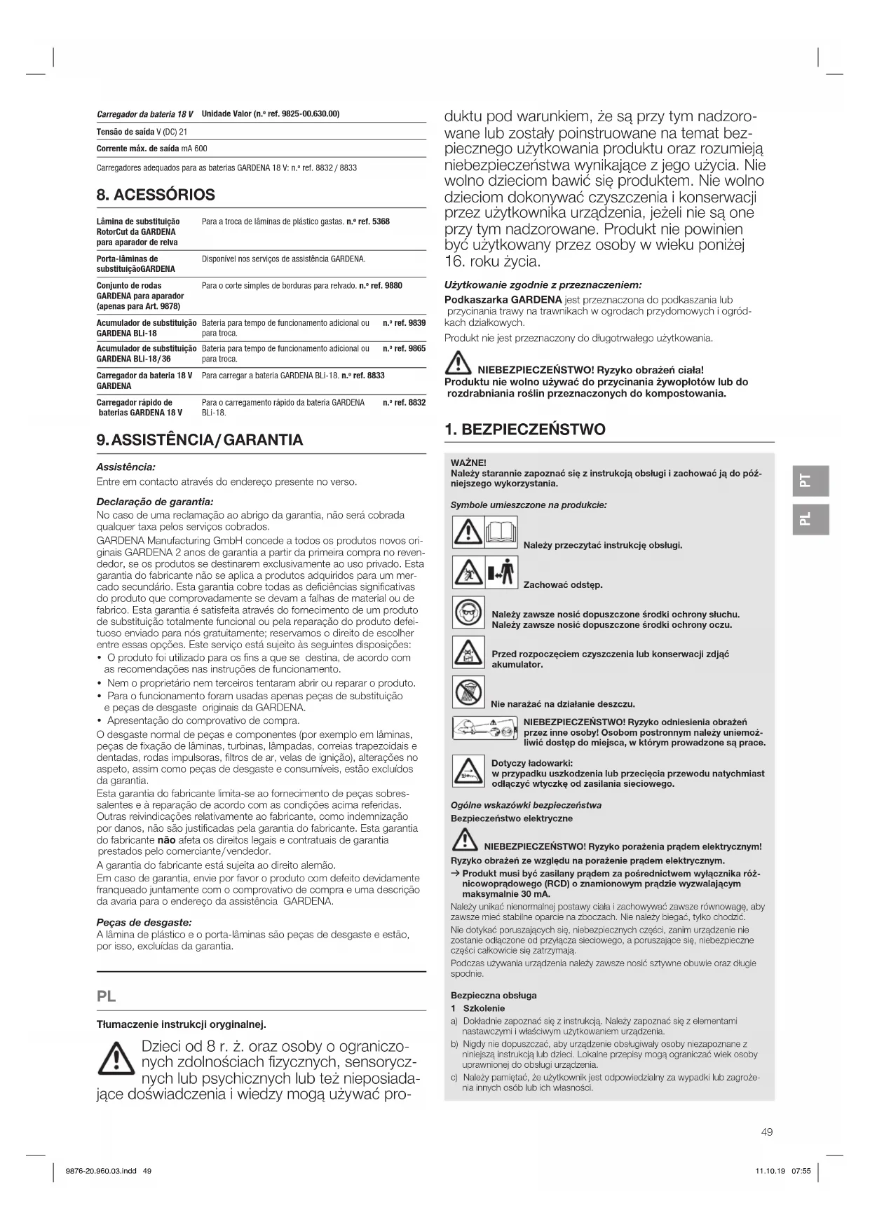 4 Konserwacja i przechowywanie a) Przed przystąpieniem do konserwacji lub czyszczenia odłączyć urządzenie od zasilania (tzn. wyciągnąć wtyczkę z gniazda, usunąć urządzenie blokujące lub wymienną baterię). b) Stosować tylko zalecane przez producenta części zamienne i akcesoria. c) Urządzenie należy regularnie sprawdzać i konserwować. Naprawę urządzenia należy zlecać tylko autoryzowanym punktom serwisowym. d) Jeśli urządzenie nie jest używane, powinno ono być przechowywane poza zasięgiem dzieci. Dodatkowe wskazówki bezpieczeństwa Bezpieczne obchodzenie się zakumulatorem NIEBEZPIECZEŃSTWO! Ryzyko pożaru! Podczas ładowania akumulator powinien znajdowaćsię na niepalnej, odpornej na wysoką temperaturę i nieprzewodzącej powierzchni. Podczas ładowania akumulatora nie wolno pozostawiać bez nadzoru. Nie wolno zwierać zestyków. Żrące, palne i łatwopalne przedmioty należy trzymać z dala od ładowarki i akumulatora. W trakcie procesu ładowania nie przykrywać ładowarki i akumulatora. W przypadku pojawienia się dymu lub ognia natychmiast odłączyć ładowarkę od sieci. Do produktów akumulatorowych GARDENA należy stosować wyłącznie akumu- latory GARDENA. Firma GARDENA nie ponosi odpowiedzialności za akumulatory innych producentów. Akumulatory niższej jakości mogą stwarzać ryzyko pożaru ieksplozji! Nie używać ładowarki GARDENA do ładowania innych akumulatorów, ponieważ firma GARDENA nie może zagwarantować kompatybilności. Takie użycie może również stwarzać ryzyko pożaru i eksplozji. Nie należy ładować baterii jednorazowych. NIEBEZPIECZEŃSTWO! Ryzyko wybuchu! Chronić akumulator przed gorącem i ogniem. Akumulatora nie należy kłaść na grzejniku, ani nie wystawiać na dłuższe działanie promie- ni słonecznych. Nie należy używać akumulatorów w atmosferze wybuchowej, np. wobecności cieczy, gazów lub pyłów palnych. Akumulatory mogą wytwarzać iskry, które mogą spowodować zapłon pyłu lub oparów. Akumulator należy sprawdzić przed każdym użyciem. Przed każdym użyciem należy przeprowadzić kontrolę wizualną akumulatora. Niesprawny akumulator należy zutylizować zgodnie z przepisami. Nie wolno wysyłać go pocztą. Dokładniejszych informacji udzielają lokalne zakłady utylizacji odpadów. Nie używać akumulatora jako źródła zasilania innych produktów. Istnieje ryzyko obrażeń. Używać akumulatora wyłącznie do przewidzianych produktów GARDENA. Akumulator można ładować i eksploatować tylko w temperaturze otoczenia w zakresie od 0 °C do 40 °C. Po dłuższym użytkowaniu pozostawić akumulator do schłodzenia. Regularnie sprawdzać przewód ładowarki pod kątem uszkodzenia lub zużycia (łamliwości). Przewodu można używać tylko, jeśli jest on w niena- gannymstanie. Nie przechowywać i nie transportować akumulatora w temperaturze powyżej 45°C ani nie narażać go na bezpośrednie działanie promieni słonecznych. Zaleca się przechowywanie akumulatora w temperaturze poniżej 25 °C, aby stopień samoistnego rozładowania był jak najmniejszy. Nie narażać akumulatora na działanie deszczu, wody (zanurzenie) lub wilgoci. Utrzymywać akumulator w czystości (dotyczy to zwłaszcza szczelin wentylacyj- nych). Jeśli akumulator nie będzie używany przez pewien czas (np. zimą), należy naładować go, aby uniknąć głębokiego rozładowania. Aby uniknąć samoczynnego rozładowania, niewłaściwego użycia lub wypadków, nie należy przechowywać akumulatora podłączonego do produktu. Nie przechowywać akumulatora w miejscach, gdzie mogą występować ładunki elektrostatyczne. Bezpieczeństwo elektryczne NIEBEZPIECZEŃSTWO! Zatrzymanie akcji serca! Podczas pracy produkt wytwarza pole elektromagnetyczne. Wokreślo- nych warunkach pole to może oddziaływać na aktywne ipasywne implan- ty medyczne. Aby uniknąć ryzyka poważnych lub śmiertelnych obrażeń ciała, zalecamy osobom posiadającym implanty medyczne przed użyciem produktu skontaktować się zlekarzem lub producentem implantu. Produktu wyposażonego w akumulator używać wyłącznie w temperaturze w zakresie od 0 do 40 °C. W sytuacji awaryjnej wyjąć akumulator. Nie używać produktu w pobliżu wody lub też do pielęgnacji stawów. Bezpieczeństwo osobiste NIEBEZPIECZEŃSTWO! Ryzyko uduszenia! Istnieje ryzyko połknięcia drobnych części. Wprzypadku małych dzieci istnieje ryzyko uduszenia plastikową torebką. Dzieci należy trzymać zdala od miejsca montażu produktu. W przypadku silnych wibracji wymienić nóż i sprawdzić mocowanie noża pod kątem uszkodzeń. Przed użyciem sprawdzić, czy wskaźnik zużycia jest w dobrym stanie. Przenosić, korzystając z przedniego uchwytu. Należy nosić środki ochrony indywidualnej. Nosić rękawice do czyszczenia zespołu tnącego. Nosić zawsze okulary ochronne. Wyposażenie ochronne, takie jak rękawice, obuwie antypoślizgowe lub też ochrona słuchu, jakie powinno być używane w odpowiednich warunkach, ogranicza zagrożenie zranieniem. Należy zachować ostrożność podczas ustawiania produktu, aby uniknąć zaklesz- czenia palców pomiędzy ruchomymi i stałymi częściami urządzenia lub podczas montażu osłony podkaszarki. Nie używać wody lub też środków chemicznych do czyszczenia osłony lub innych części podkaszarki. Dokręcić wszystkie nakrętki i śruby, aby upewnić się, że produkt umożliwia bez- pieczne wykonywanie pracy. Nie demontować produktu w zakresie wykraczającym poza zakres dostawy. Ostrzeżenie! W przypadku noszenia ochrony słuchu oraz ze względu na hałas generowany przez produkt, użytkownik może nie zauważyć zbliżających się osób. Podczas eksploatacji i transportu zwracać szczególną uwagę na zagrożenie dla innych ludzi. Należy zachować czujność, obserwować, co się robi, i używać zdrowego rozsąd- ku podczas korzystania z elektronarzędzia. Nie używać elektronarzędzia w stanie zmęczenia lub choroby,