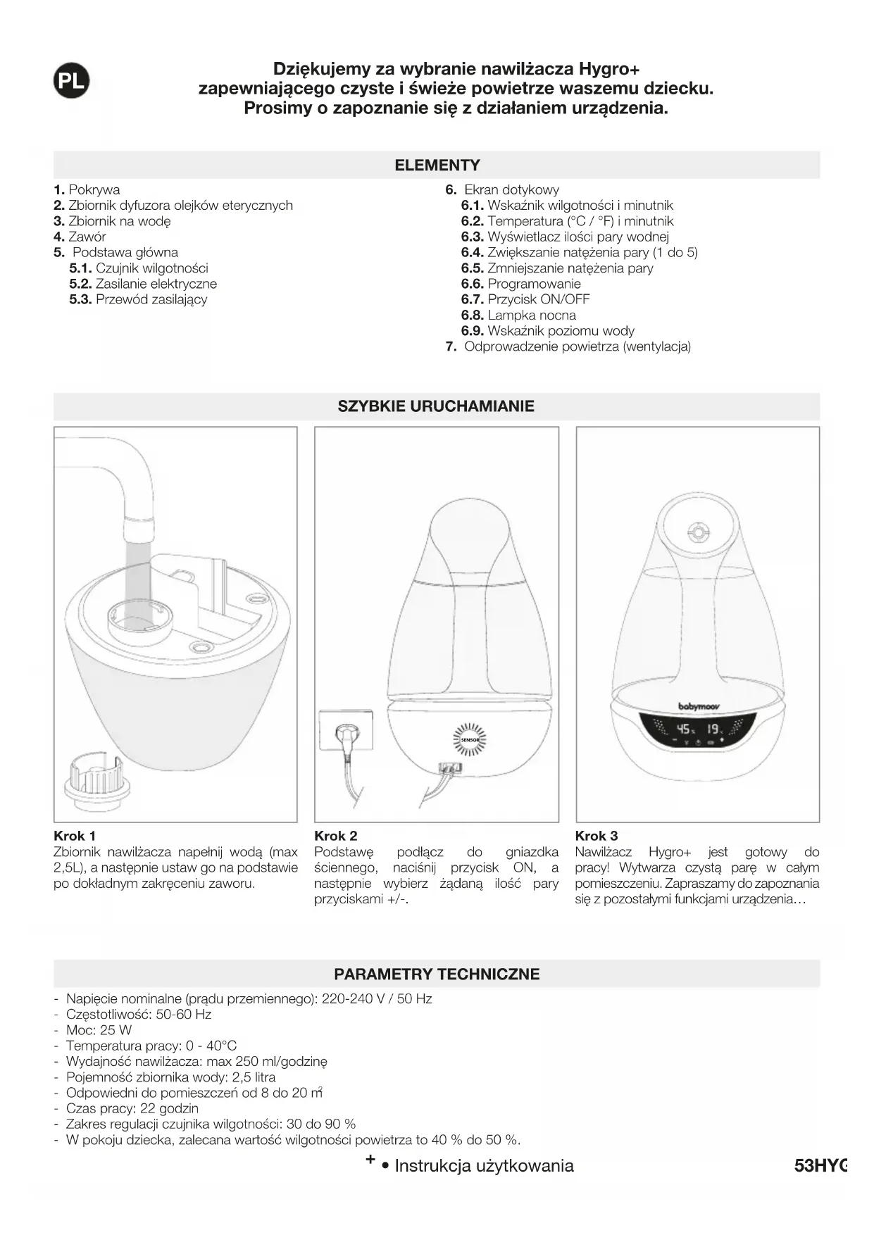 Dziękujemy za wybranie nawilżacza Hygro+ zapewniającego czyste i świeże powietrze waszemu dziecku. Prosimy o zapoznanie się z działaniem urządzenia. SZYBKIE URUCHAMIANIE