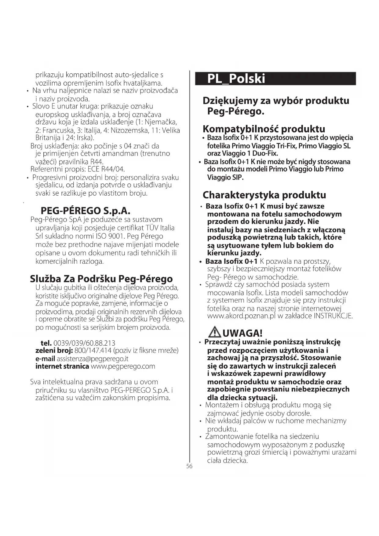 - Numer seryjny: poza homologacją każdy produkt posiada także własny numer seryjny. PEG-PÉREGO S.p.A. Peg-Pérego SpA to firma z wdrożonym systemem zarządzania jakością certyfikowanym przez TÜV Italia Srl, zgodnie z normą ISO 9001. Producent Peg-Pérego zastrzega sobie prawo do wprowadzania zmian w modelach prezentowanych w niniejszej publikacji dla celów technicznych i reklamowych. Serwis gwarancyjny i pogwarancyjny Peg-Pérego Jeżeli jakakolwiek z części zgubi się lub ulegnie zniszczeniu, nie używaj zamienników. W celu zdobycia informacji, wymiany lub naprawy produktu bądź zakupienia oryginalnych części możesz skontaktować się z producentem lub dystrybutorem w swoim kraju.. tel. 0039/039/60.88.213 e-mail assistenza@pegperego.it sito internet www.pegperego.com Wszelkie prawa autorskie dotyczące treści niniejszej instrukcji są własnością firmy Peg- Pérego S.p.A. i są chronione obowiązującym prawem. UA_Українська Дякуємо Вам за те, що Ви обрали продукцію Peg-Perego. Сумісність Продуктів