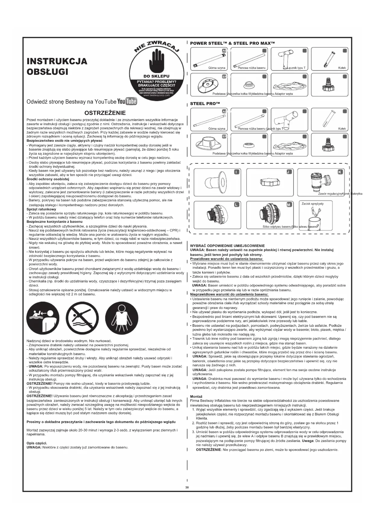 E F G HA B C D STEEL PRO™ E F G HA B C DGórna szynaPionowa nóżka basenuŁącznik typu TKołekPodstawa Uszczelka kołka Wykładzina basenu Adaptor wężaGórna szynaPionowa nóżka basenu Łącznik typu TKołekPodstawa Uszczelka kołka Wykładzina basenu Adaptor węża Odwiedź stronę Bestway na YouTube PYTANIA? PROBLEMY?BRAKUJĄCE CZĘŚCI?W celu zapoznania się z najczęściej zadawanymi pytaniami, instrukcjami obsługi, filmami czy w celu zakupu części zamiennych prosimy o odwiedzenie naszej strony www.bestwaycorp.com DO SKLEPU
