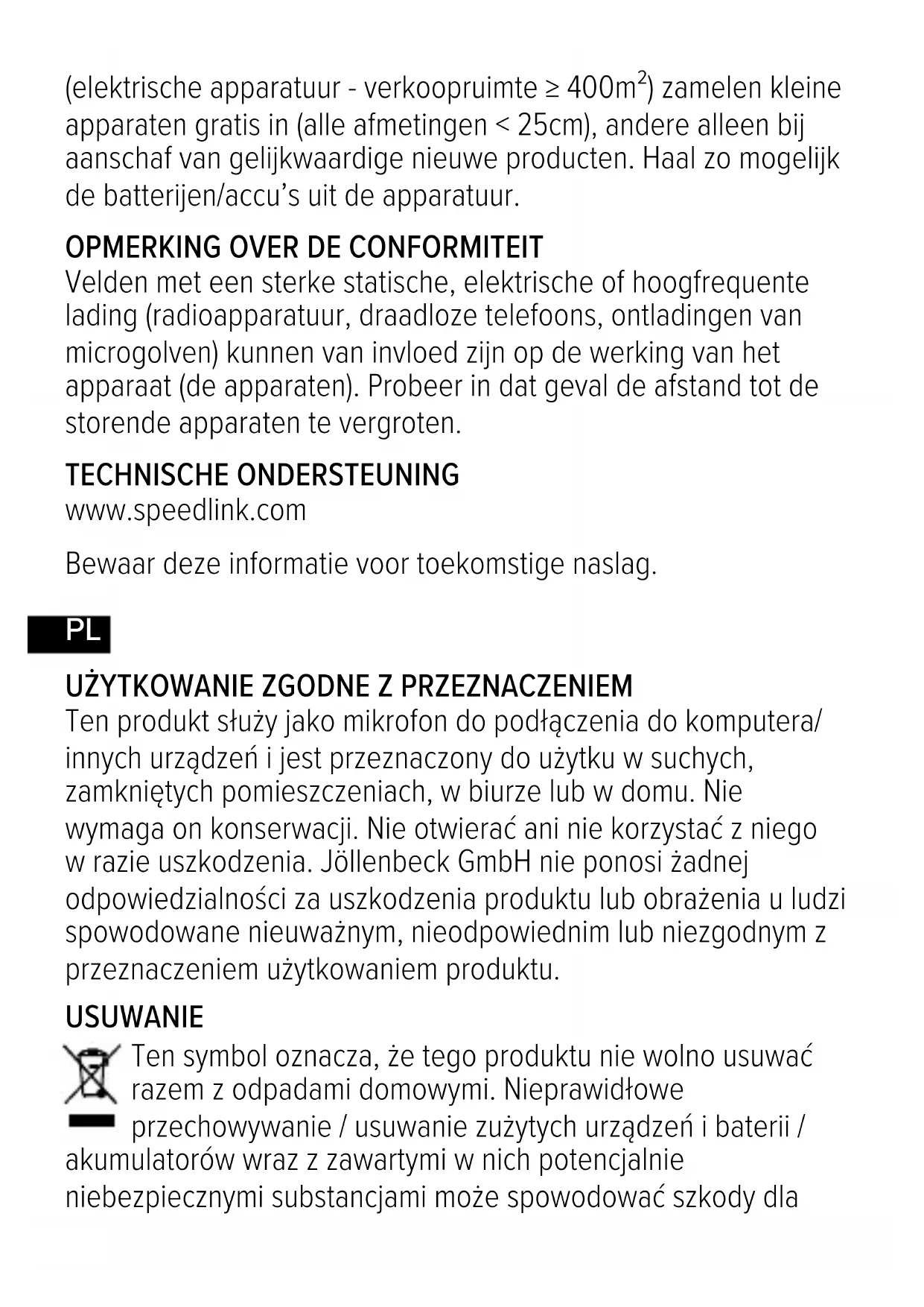 Ten produkt służy jako mikrofon do podłączenia do komputera/ innych urządzeń i jest przeznaczony do użytku w suchych, zamkniętych pomieszczeniach, w biurze lub w domu. Nie wymaga on konserwacji. Nie otwierać ani nie korzystać z niego w razie uszkodzenia. Jöllenbeck GmbH nie ponosi żadnej odpowiedzialności za uszkodzenia produktu lub obrażenia u ludzi spowodowane nieuważnym, nieodpowiednim lub niezgodnym z przeznaczeniem użytkowaniem produktu. USUWANIE Ten symbol oznacza, że tego produktu nie wolno usuwać razem z odpadami domowymi. Nieprawidłowe przechowywanie / usuwanie zużytych urządzeń i baterii / akumulatorów wraz z zawartymi w nich potencjalnie niebezpiecznymi substancjami może spowodować szkody dlaPL