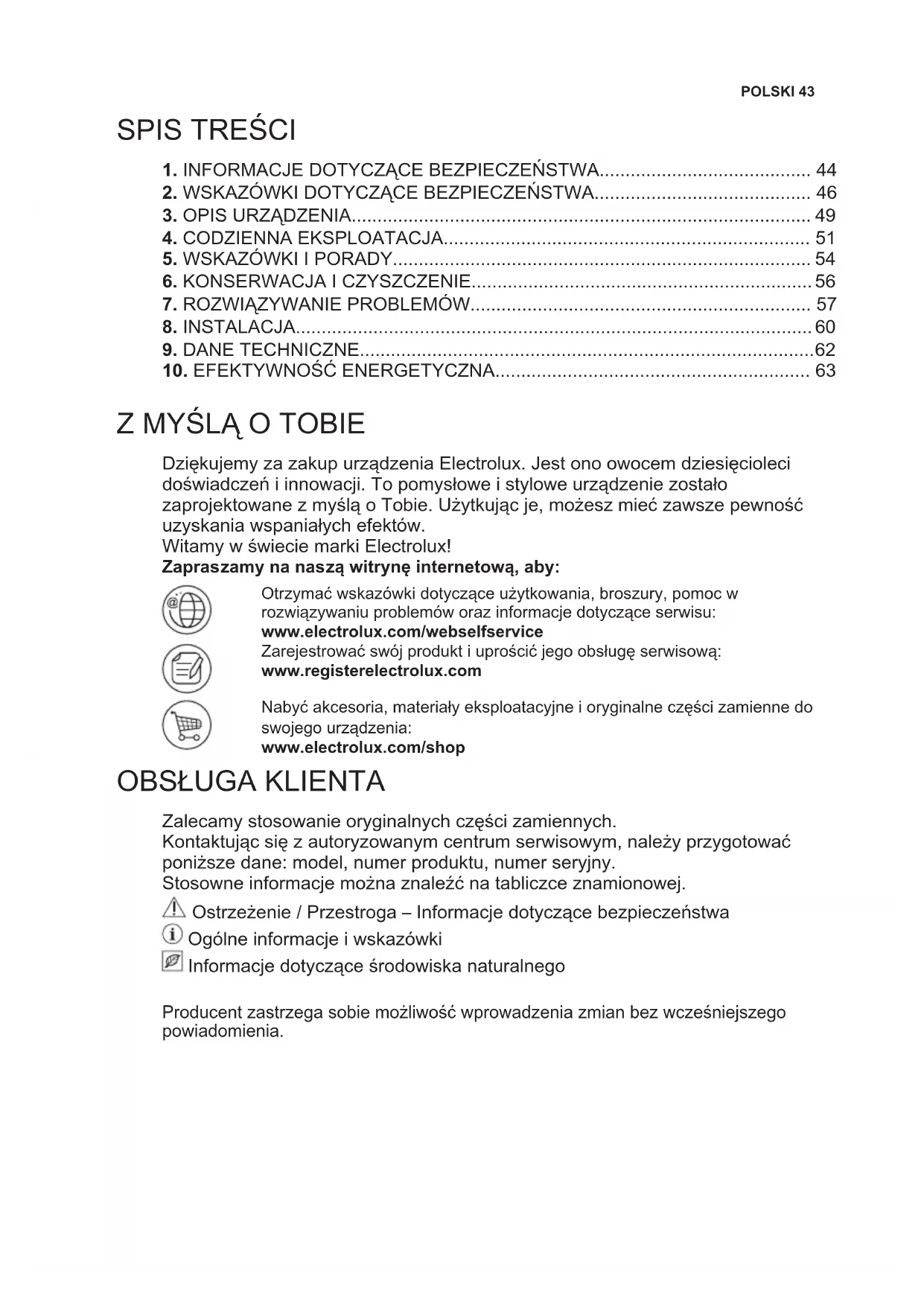 Dziękujemy za zakup urządzenia Electrolux. Jest ono owocem dziesięcioleci doświadczeń i innowacji. To pomysłowe i stylowe urządzenie zostało zaprojektowane z myślą o Tobie. Użytkując je, możesz mieć zawsze pewność uzyskania wspaniałych efektów. Witamy w świecie marki Electrolux! Zapraszamy na naszą witrynę internetową, aby: Otrzymać wskazówki dotyczące użytkowania, broszury, pomoc w rozwiązywaniu problemów oraz informacje dotyczące serwisu: www.electrolux.com/webselfservice Zarejestrować swój produkt i uprościć jego obsługę serwisową: www.registerelectrolux.com Nabyć akcesoria, materiały eksploatacyjne i oryginalne części zamienne do swojego urządzenia: www.electrolux.com/shop