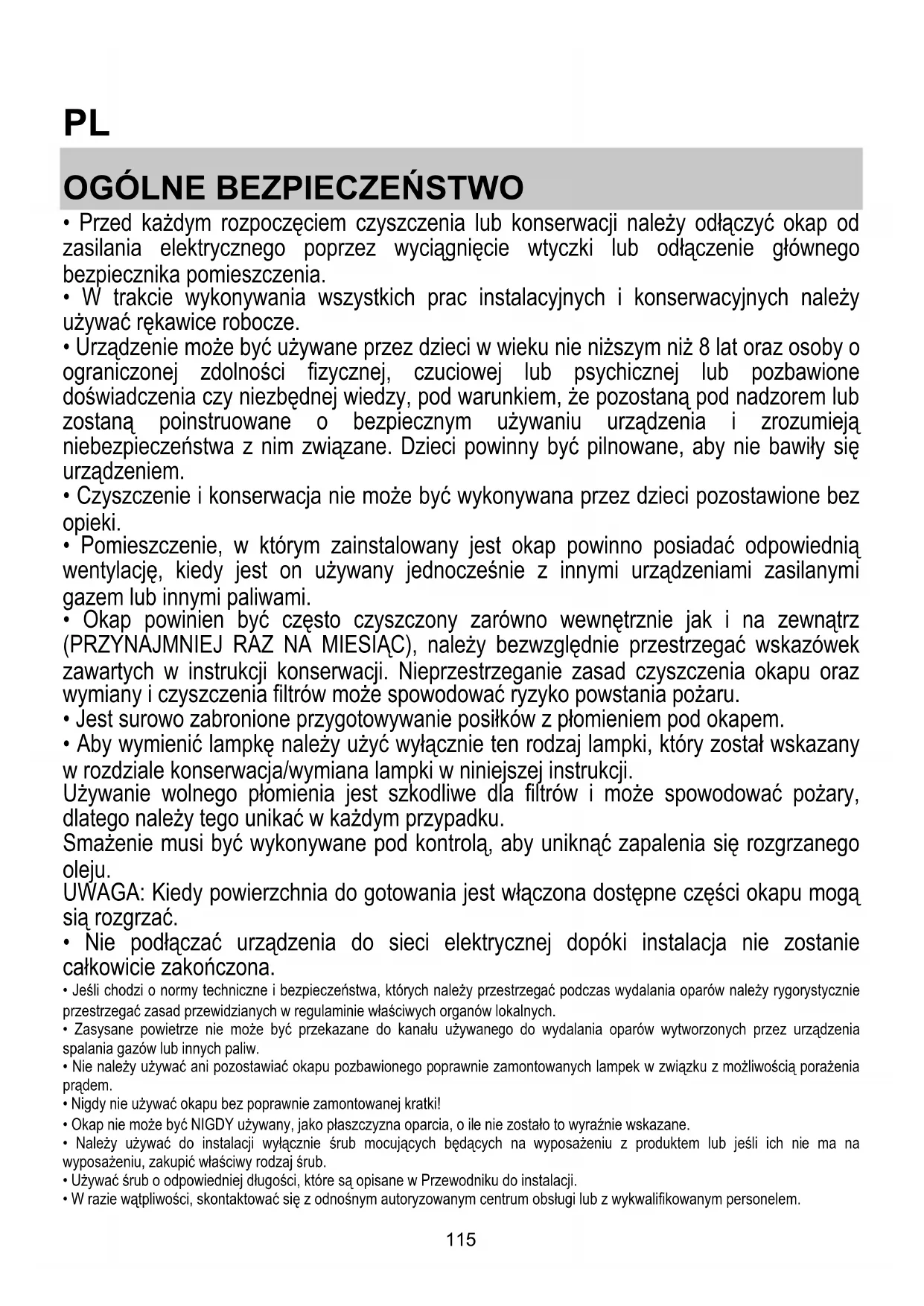 - Okap powinien być często czyszczony zarówno wewnętrznie jak i na zewnątrz (PRZYNAJMNIEJ RAZ NA MIESIĄC), należy bezwzględnie przestrzegać wskazówek zawartych w instrukcji konserwacji. Nieprzestrzeganie zasad czyszczenia okapu oraz wymiany i czyszczenia filtrów może spowodować ryzyko powstania pożaru.