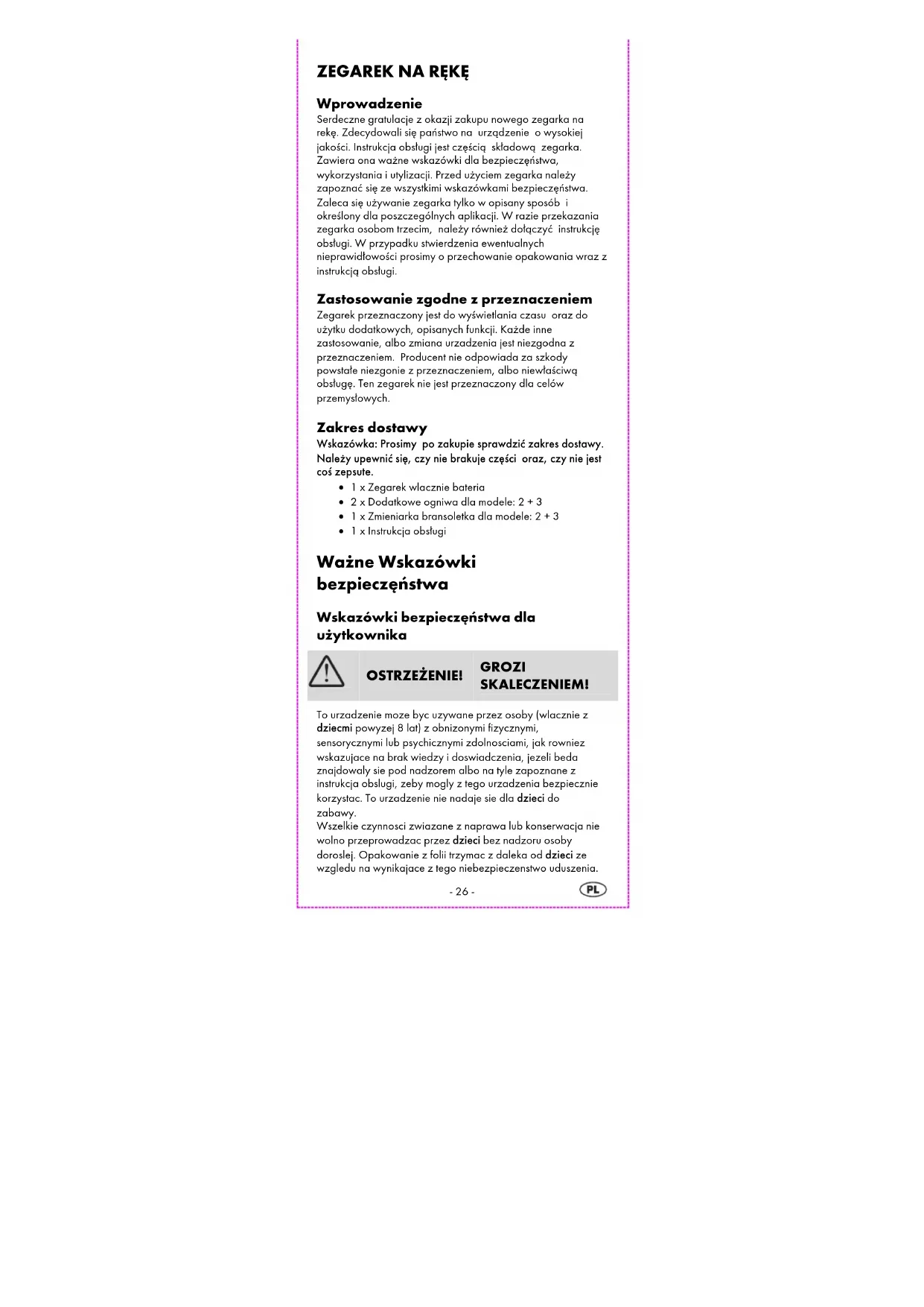 Wprowadzenie Serdeczne gratulacje z okazji zakupu nowego zegarka na rekę. Zdecydowali się państwo na urządzenie o wysokiej jakości. Instrukcja obsługi jest częścią składową zegarka. Zawiera ona ważne wskazówki dla bezpieczęństwa, wykorzystania i utylizacji. Przed użyciem zegarka należy zapoznać się ze wszystkimi wskazówkami bezpieczęństwa. Zaleca się używanie zegarka tylko w opisany sposób i określony dla poszczególnych aplikacji. W razie przekazania zegarka osobom trzecim, należy również dołączyć instrukcję obsługi. W przypadku stwierdzenia ewentualnych nieprawidłowości prosimy o przechowanie opakowania wraz z instrukcją obsługi. Zastosowanie zgodne z przeznaczeniem Zegarek przeznaczony jest do wyświetlania czasu oraz do użytku dodatkowych, opisanych funkcji. Każde inne zastosowanie, albo zmiana urzadzenia jest niezgodna z przeznaczeniem. Producent nie odpowiada za szkody powstałe niezgonie z przeznaczeniem, albo niewłaściwą obsługę. Ten zegarek nie jest przeznaczony dla celów przemysłowych. Zakres dostawy Wskazówka: Prosimy po zakupie sprawdzić zakres dostawy. Należy upewnić się, czy nie brakuje części oraz, czy nie jest coś zepsute. 1 x Zegarek wlacznie bateria 2 x Dodatkowe ogniwa dla modele: 2 + 3 1 x Zmieniarka bransoletka dla modele: 2 + 3 1 x Instrukcja obsługi Ważne Wskazówki bezpieczęństwa Wskazówki bezpieczęństwa dla użytkownika