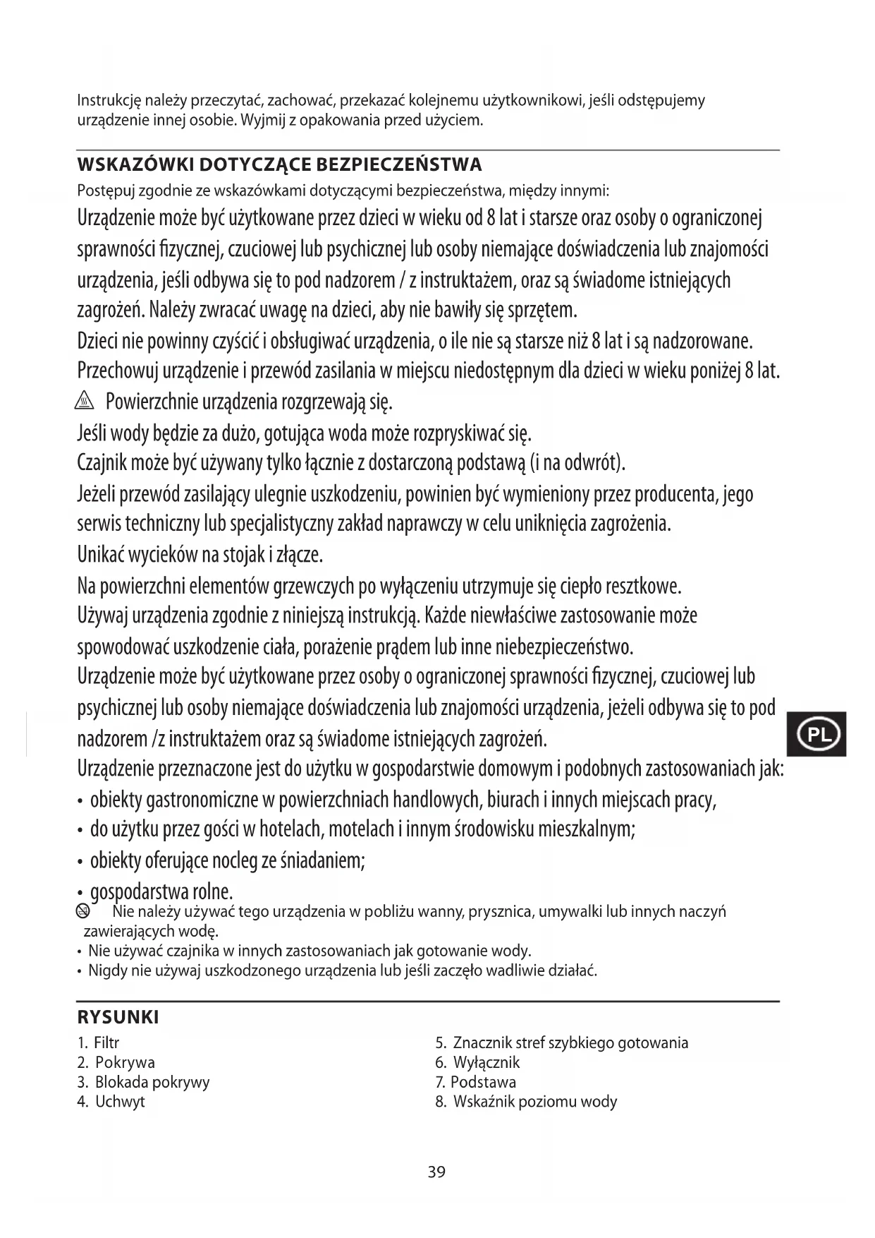Postępuj zgodnie ze wskazówkami dotyczącymi bezpieczeństwa, między innymi: Urządzenie może być użytkowane przez dzieci w wieku od 8 lat i starsze oraz osoby o ograniczonej sprawności zycznej, czuciowej lub psychicznej lub osoby niemające doświadczenia lub znajomości urządzenia, jeśli odbywa się to pod nadzorem / z instruktażem, oraz są świadome istniejących zagrożeń. Należy zwracać uwagę na dzieci, aby nie bawiły się sprzętem. Dzieci nie powinny czyścić i obsługiwać urządzenia, o ile nie są starsze niż 8 lat i są nadzorowane. Przechowuj urządzenie i przewód zasilania w miejscu niedostępnym dla dzieci w wieku poniżej 8 lat. h Powierzchnie urządzenia rozgrzewają się. Jeśli wody będzie za dużo, gotująca woda może rozpryskiwać się. Czajnik może być używany tylko łącznie z dostarczoną podstawą (i na odwrót). Jeżeli przewód zasilający ulegnie uszkodzeniu, powinien być wymieniony przez producenta, jego serwis techniczny lub specjalistyczny zakład naprawczy w celu uniknięcia zagrożenia. Unikać wycieków na stojak i złącze. Na powierzchni elementów grzewczych po wyłączeniu utrzymuje się ciepło resztkowe. Używaj urządzenia zgodnie z niniejszą instrukcją. Każde niewłaściwe zastosowanie może spowodować uszkodzenie ciała, porażenie prądem lub inne niebezpieczeństwo. Urządzenie może być użytkowane przez osoby o ograniczonej sprawności zycznej, czuciowej lub psychicznej lub osoby niemające doświadczenia lub znajomości urządzenia, jeżeli odbywa się to pod nadzorem /z instruktażem oraz są świadome istniejących zagrożeń. Urządzenie przeznaczone jest do użytku w gospodarstwie domowym i podobnych zastosowaniach jak: