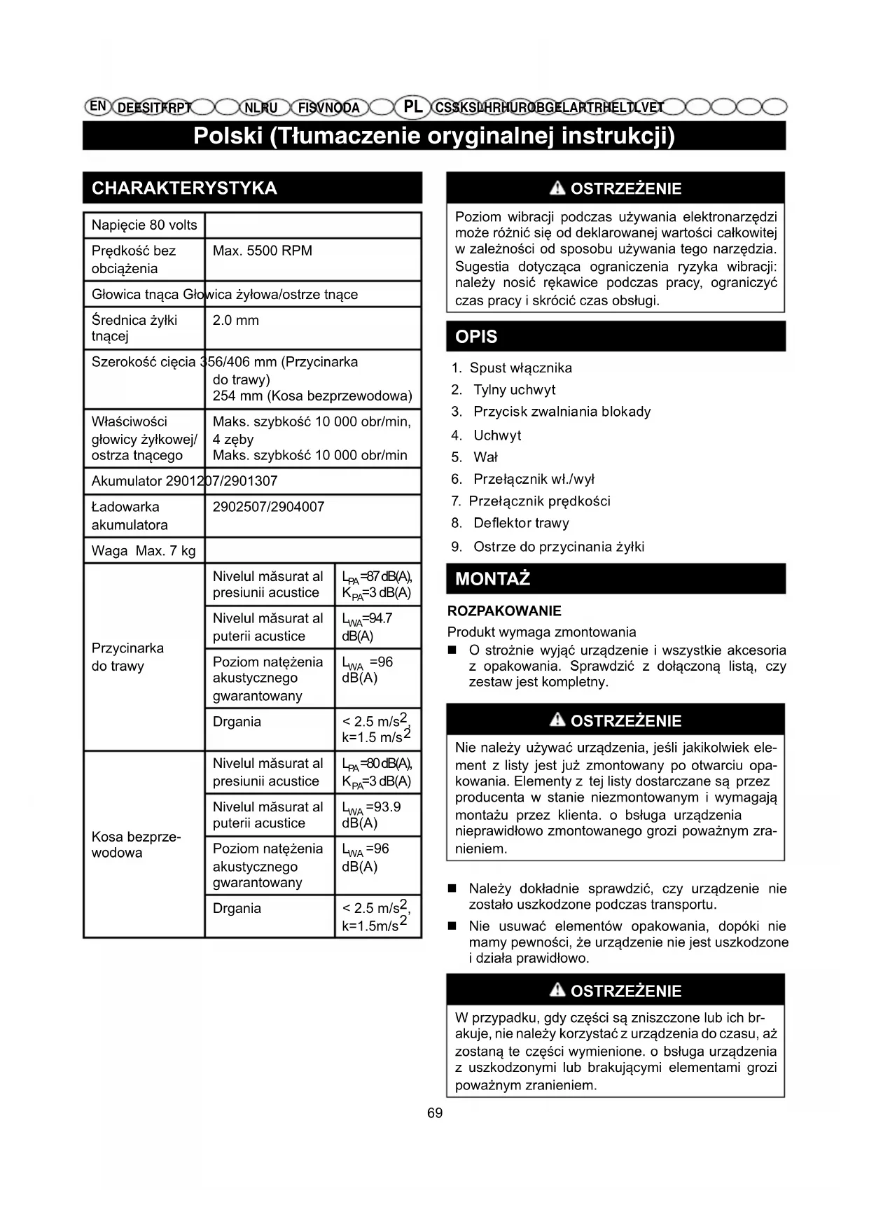 MONTAŻ ROZPAKOWANIE Produkt wymaga zmontowania O strożnie wyjąć urządzenie i wszystkie akcesoria z opakowania. Sprawdzić z dołączoną listą, czy zestaw jest kompletny. OSTRZEŻENIE Nie należy używać urządzenia, jeśli jakikolwiek ele- ment z listy jest już zmontowany po otwarciu opa- kowania. Elementy z tej listy dostarczane są przez producenta w stanie niezmontowanym i wymagają montażu przez klienta. o bsługa urządzenia nieprawidłowo zmontowanego grozi poważnym zra- nieniem. Należy dokładnie sprawdzić, czy urządzenie nie zostało uszkodzone podczas transportu. Nie usuwać elementów opakowania, dopóki nie mamy pewności, że urządzenie nie jest uszkodzone i działa prawidłowo. OSTRZEŻENIE W przypadku, gdy części są zniszczone lub ich br- akuje, nie należy korzystać z urządzenia do czasu, aż zostaną te części wymienione. o bsługa urządzenia z uszkodzonymi lub brakującymi elementami grozi poważnym zranieniem.Polski (Tłumaczenie oryginalnej instrukcji)