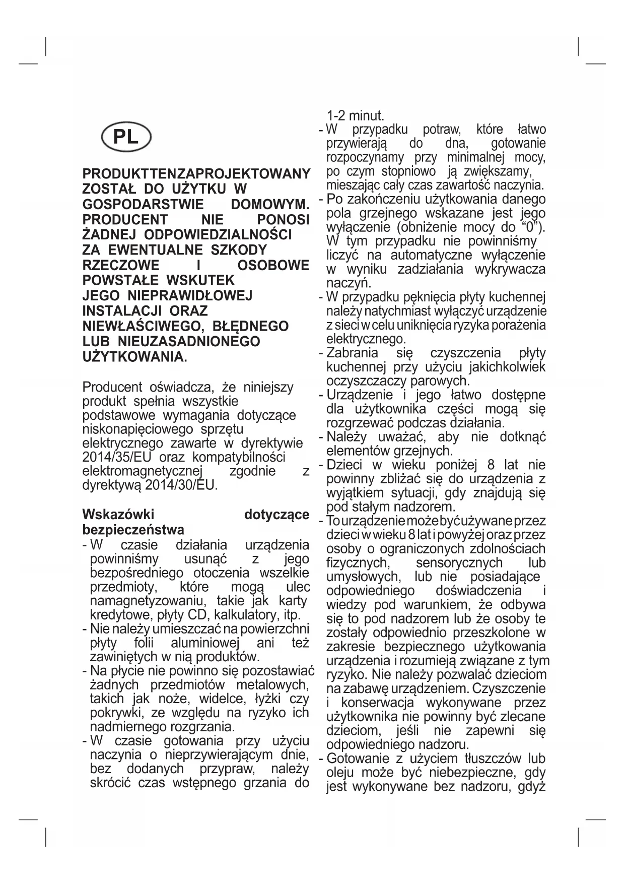 LUB NIEUZASADNIONEGO UŻYTKOWANIA. Producent oświadcza, że niniejszy produkt spełnia wszystkie podstawowe wymagania dotyczące niskonapięciowego sprzętu elektrycznego zawarte w dyrektywie 2014/35/EU oraz kompatybilności elektromagnetycznej zgodnie z dyrektywą 2014/30/EU. Wskazówki dotyczące bezpieczeństwa - W czasie działania urządzenia powinniśmy usunąć z jego bezpośredniego otoczenia wszelkie przedmioty, które mogą ulec namagnetyzowaniu, takie jak karty kredytowe, płyty CD, kalkulatory, itp. - Nie należy umieszczać na powierzchni płyty folii aluminiowej ani też zawiniętych w nią produktów. - Na płycie nie powinno się pozostawiać żadnych przedmiotów metalowych, takich jak noże, widelce, łyżki czy pokrywki, ze względu na ryzyko ich nadmiernego rozgrzania. - W czasie gotowania przy użyciu naczynia o nieprzywierającym dnie, bez dodanych przypraw, należy skrócić czas wstępnego grzania do 1-2 minut.